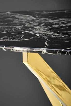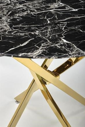 Jídelní stůl si oblíbíte pro jeho kulatý design a zajímavou konstrukci. Tento jídelní stůl se hodí do domácností, kaváren, restaurací, ale jistě jej oceníte rovněž v hotelech. Deska stolu se vyrábí z skla v barvě černý mramor a nese ji zajímavě propletená konstrukce z chromované oceli ve zlaté barvě. Obohaťte svou jídelnu či kuchyň o tento moderní jídelní stůl. Židle nejsou součástí produktu. Zboží dodáváme v demontu.