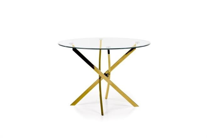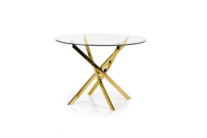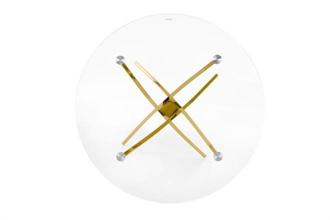 Jídelní stůl si oblíbíte pro jeho kulatý design a zajímavou konstrukci. Tento jídelní stůl se hodí do domácností, kaváren, restaurací, ale jistě jej oceníte rovněž v hotelech. Deska stolu se vyrábí z čirého skla a nese ji zajímavě propletená konstrukce z chromované oceli ve zlaté barvě. Obohaťte svou jídelnu či kuchyň o tento moderní jídelní stůl. Židle nejsou součástí produktu. Zboží dodáváme v demontu.