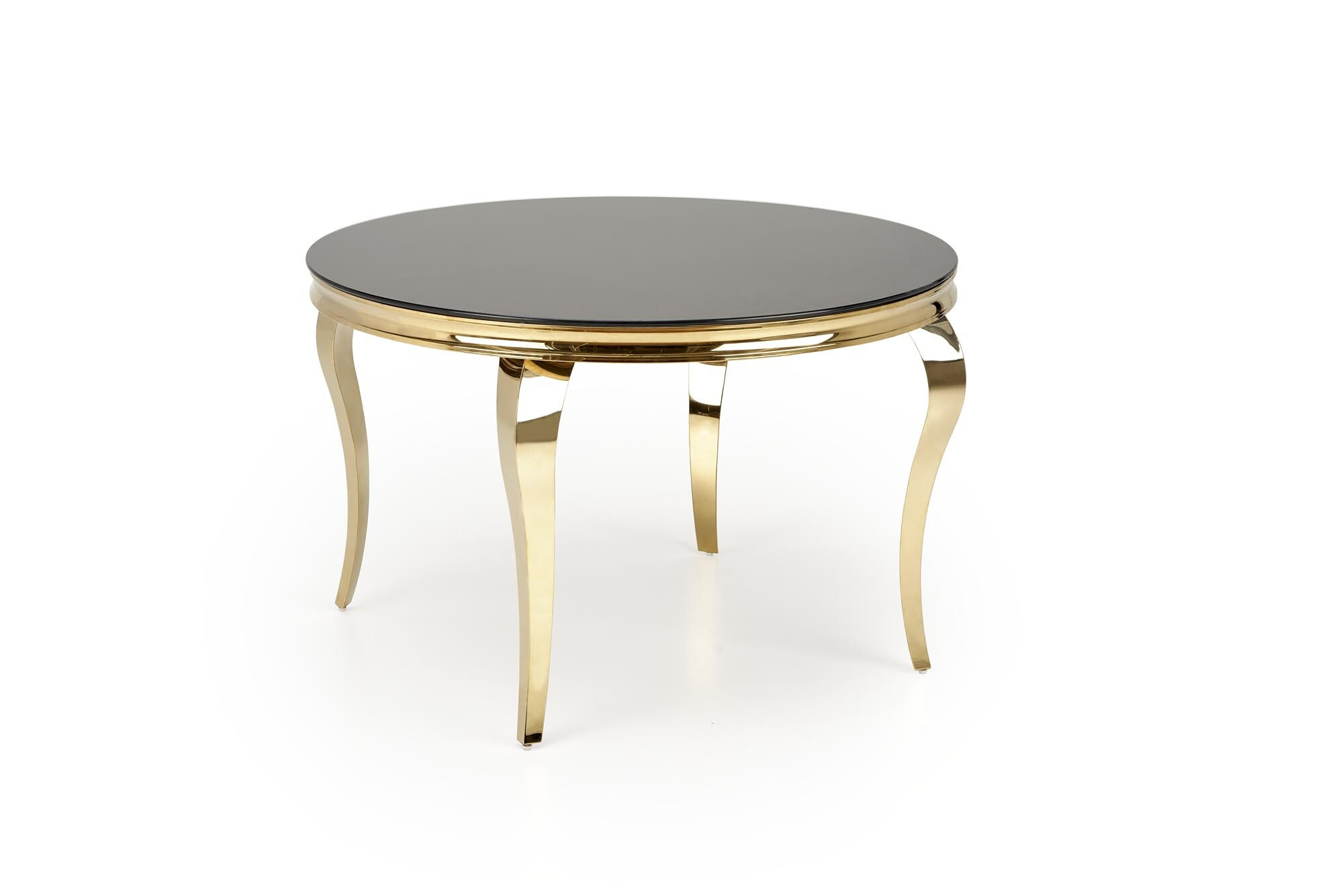 Kulatý jídelní stůl je vyroben v kombinaci skla černé barvy a nerezové oceli s designovou podnoží ve zlaté barvě. Zboží dodáváme v demontu.