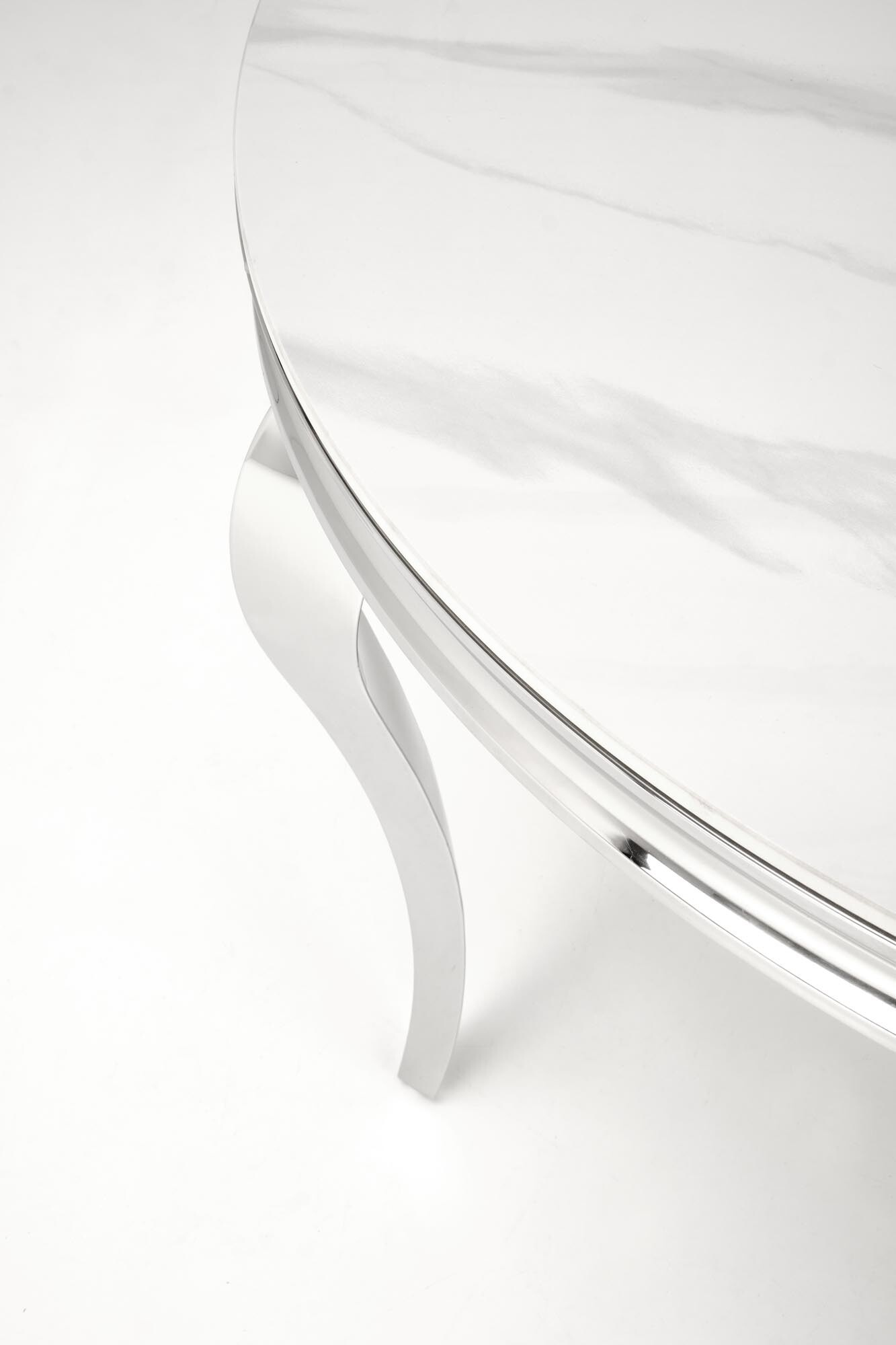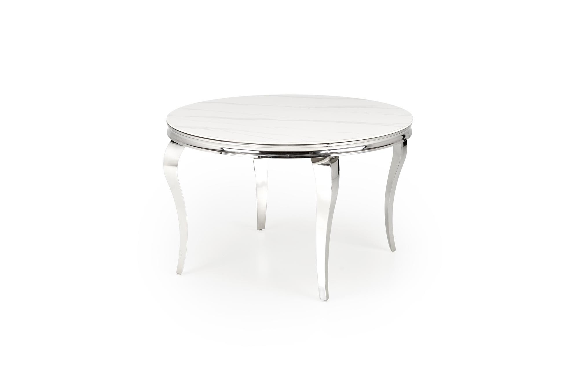 Kulatý jídelní stůl vyroben v kombinaci slinutého kamene bílé mramorové barvy a nerezové oceli s designovou podnoží ve stříbrné barvě. Zboží dodáváme v demontu.