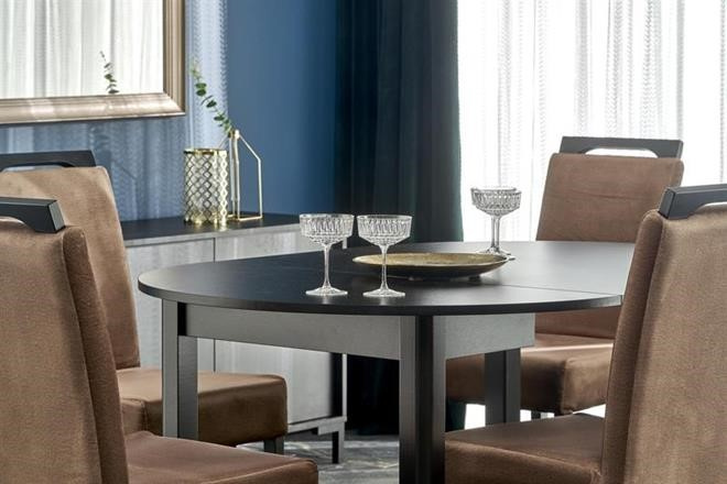 Moderní rozkládací jídelní stůl je vyroben z kvalitní desky dýhované v dezénu černá. Lze ho rozložit do délky 142 cm. Osvěžte svůj interiér tímto jídelním stolem. Židle nejsou součástí, foto je pouze ilustrační. Zboží dodáváme v demontu.