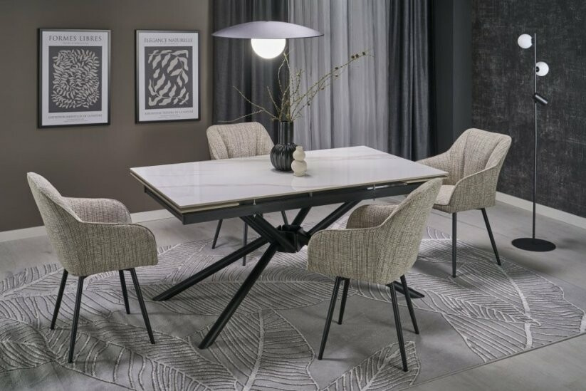 Deska jídelního stolu je vyrobena ze slinutého kamene v barvě bílého mramoru. Masivní, pevný rám originálního tvaru je vyroben z kovu lakovaného černou barvou. Zboží dodáváme v demontu.