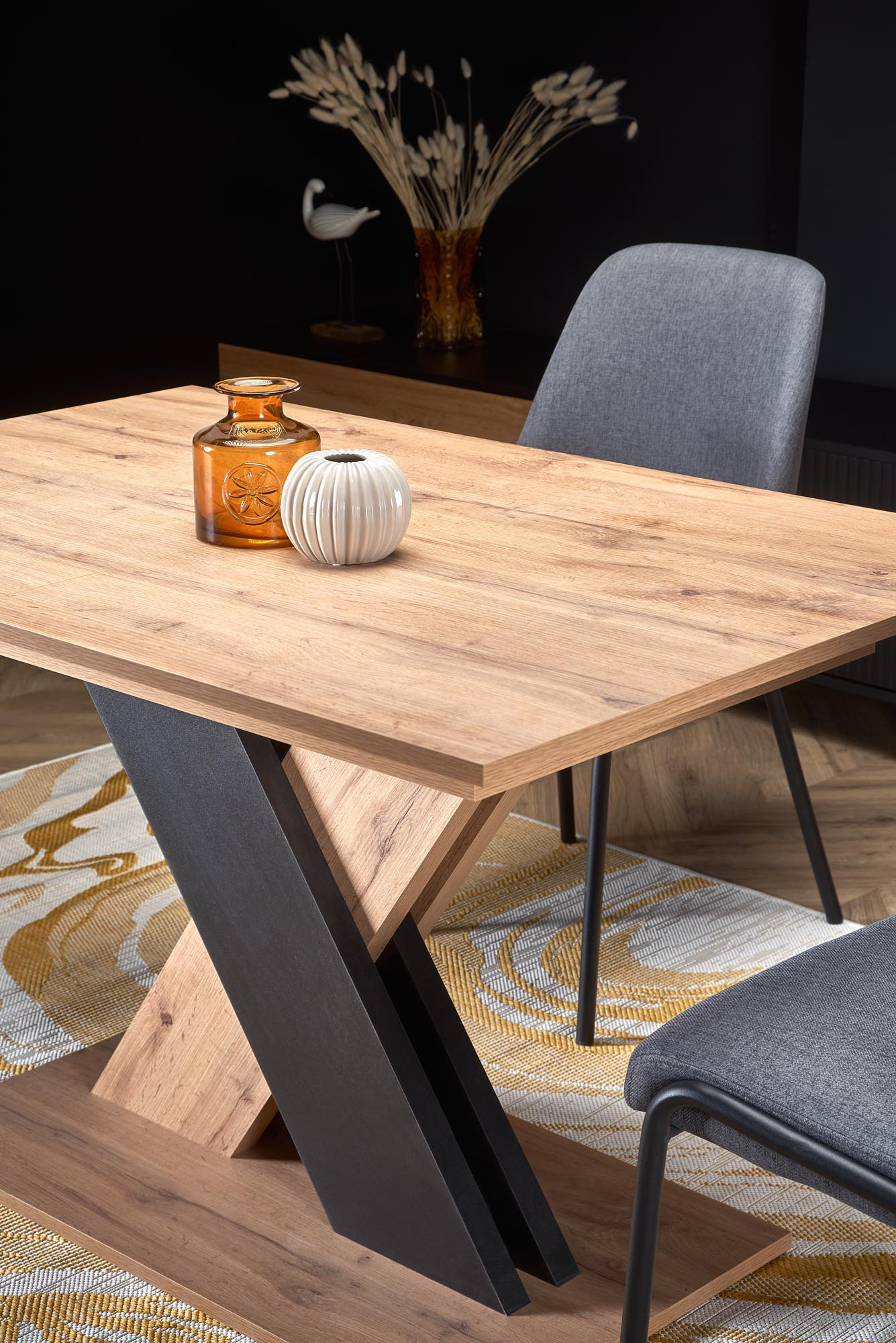 Jídelní stůl je vyrobený z laminované DTD v barvě dub wotan. Stojí na designové podnoži na konci spojené deskou v barevném provedení dub wotan/černá. Židle nejsou součástí, foto je pouze ilustrační. Zboží dodáváme v demontu.