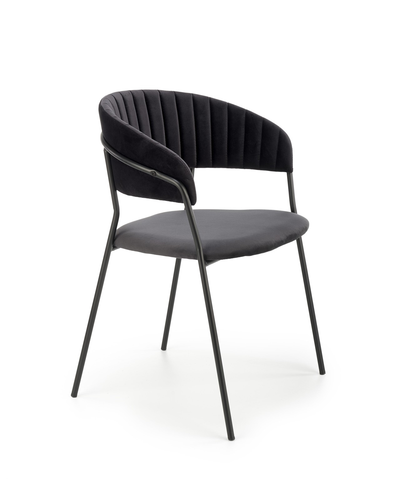 Stylová jídelní židle K426 je čalouněna černou sametovou látkou. Stabilitu zajišťují kovové nohy práškově lakované černou barvou. Židle se pyšní dekorativním prošíváním zádově opěrky a dostatečně velkým a pohodlným sedákem.