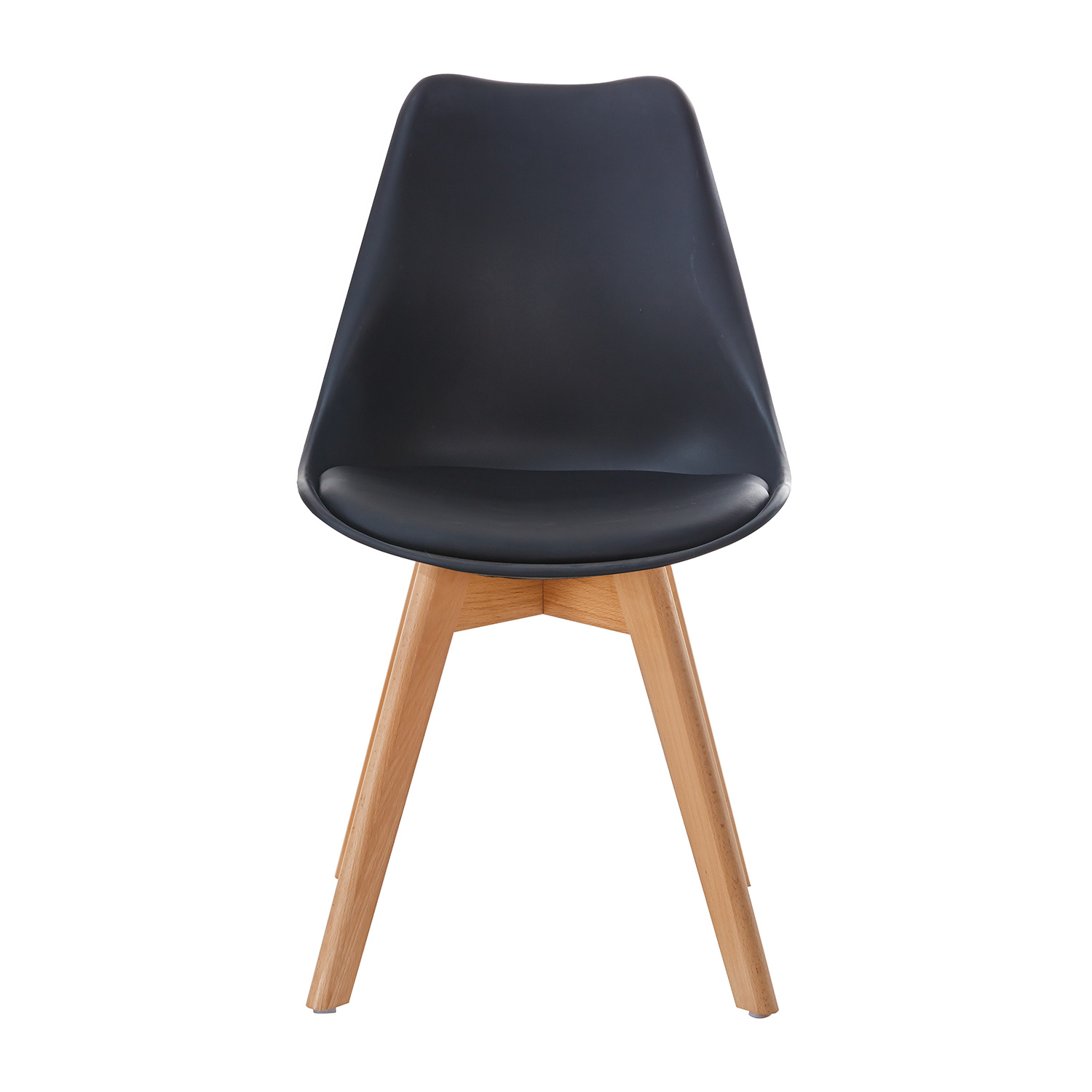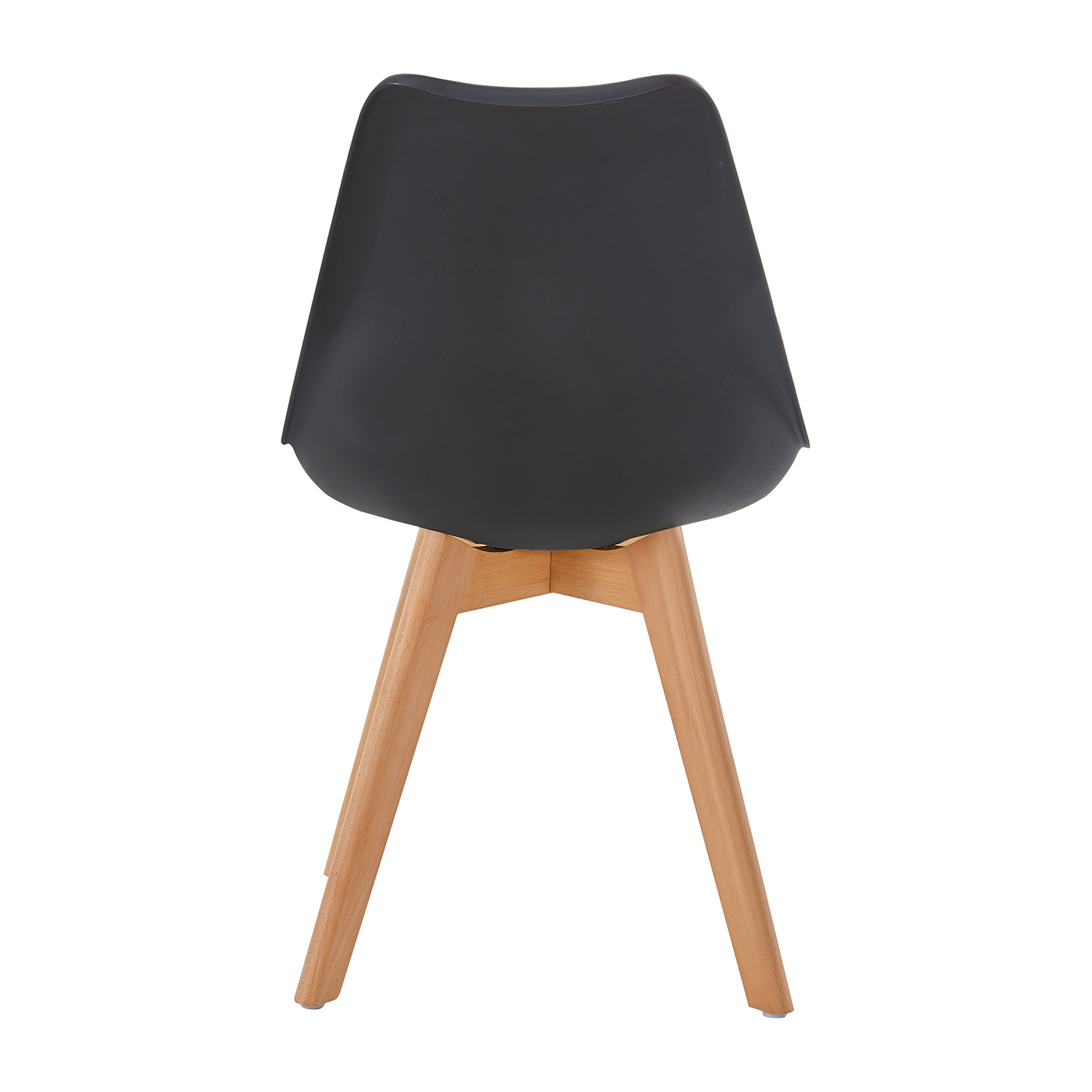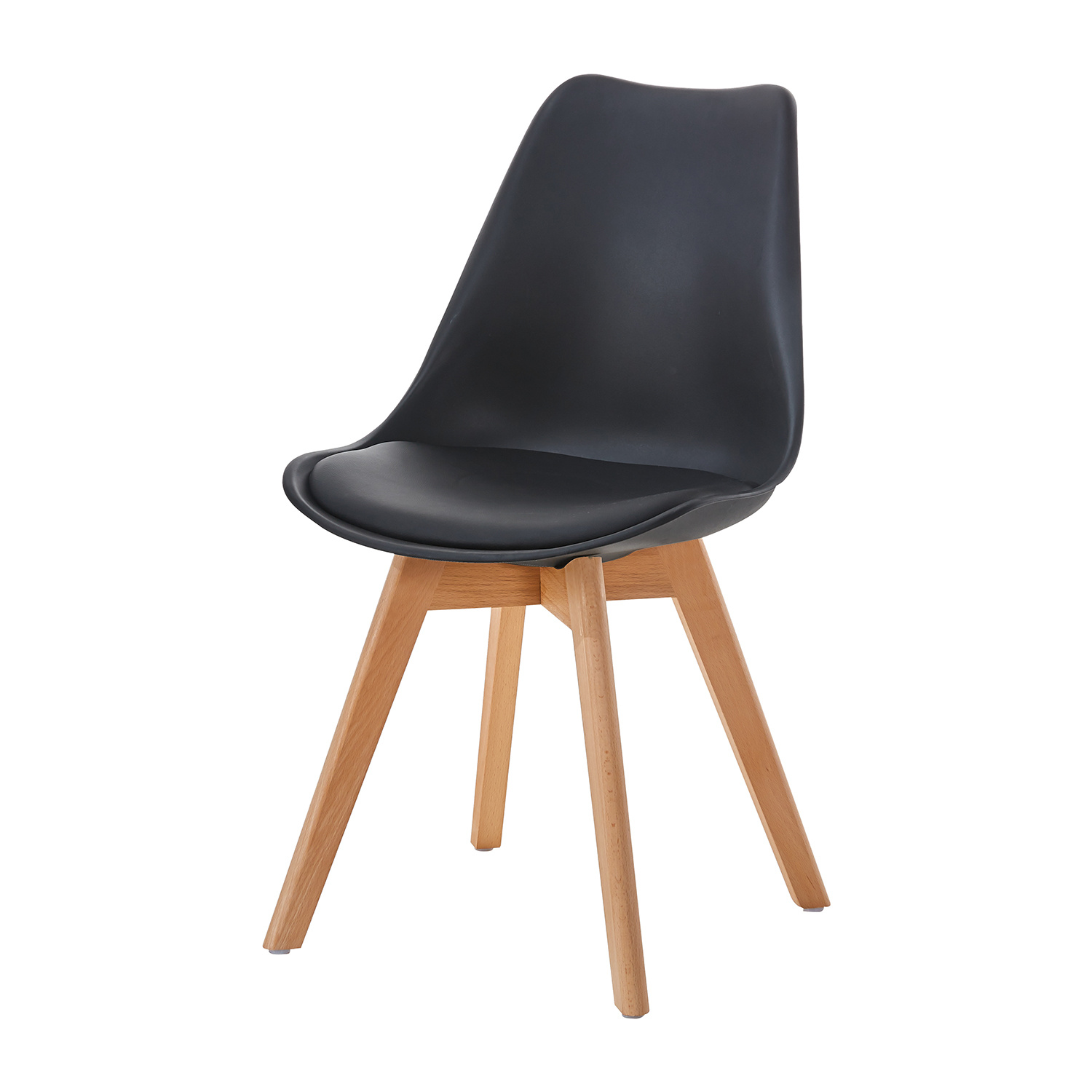 Jídelní židle má korpus PP, sedák z imitace kůže – imitace v barevném provedení černá. Nohy masiv buk, výška sedu 46 cm.