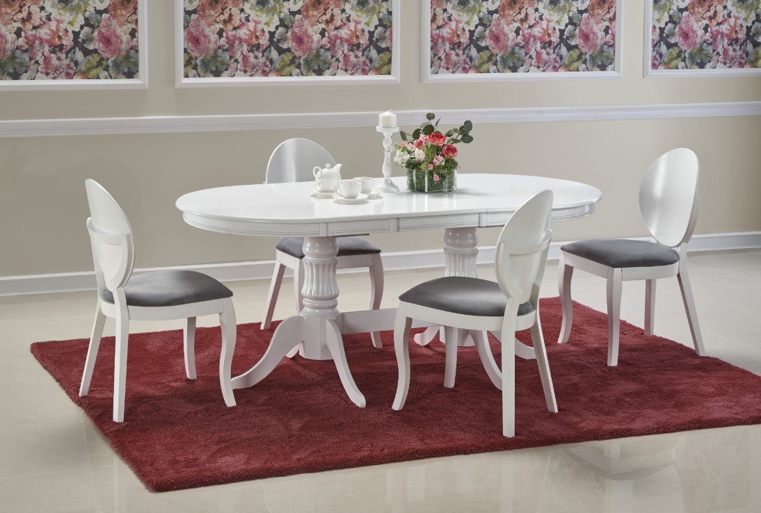 Rozkládací jídelní stůl má desku stolu vyrobenou z MDF lakované v barevném provedení bílá. Nohy jsou z masivu v barevném provedené bílá. Jídelní židle nejsou součástí produktu. Zboží je dodáváno v demontu.