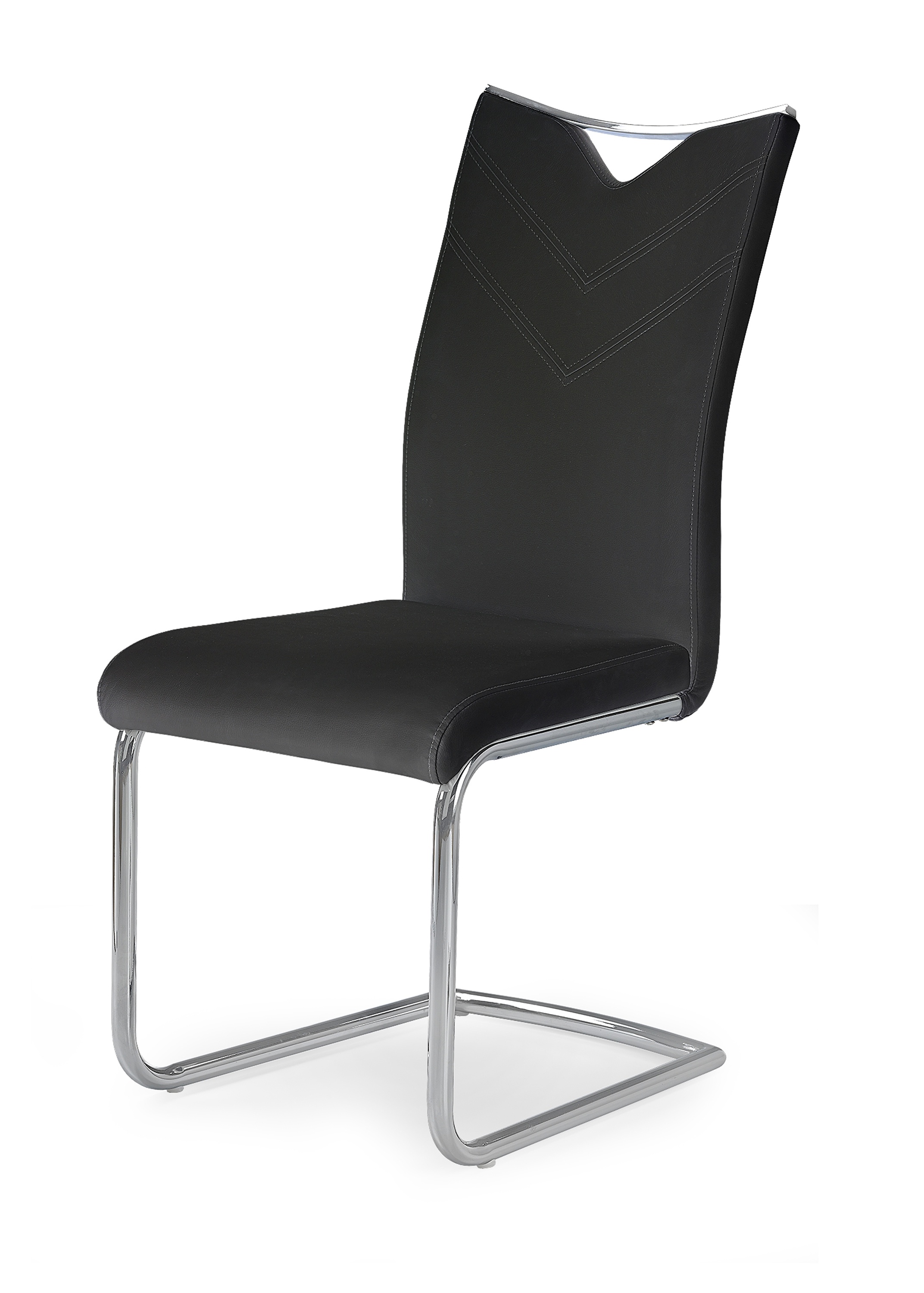 Elegantní jídelní židle je vyrobena v kombinaci materiálů, kovová pohupová podnož z chromované oceli, sedák a opěrák jsou čalouněny eko kůží v černé barvě. Opěrka je zdobena prošitím. Židle se skvěle hodí do moderních, ale také klasicky zařízených domácností, především kuchyní a jídelen. Max. nosnost 120kg. Zboží je dodáváno v demontu.