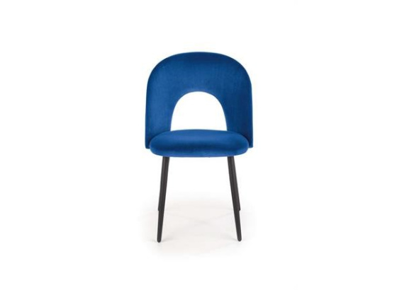 Jídelní židle K446Elegantní jídelní židle K446 je vyrobena v kombinaci kovové podnože z práškově lakované ocele a čalouněná sametovou potahovou látkou s prošíváním. Černé nohy jsou ve spodní části ozdobené zlatou barvou.