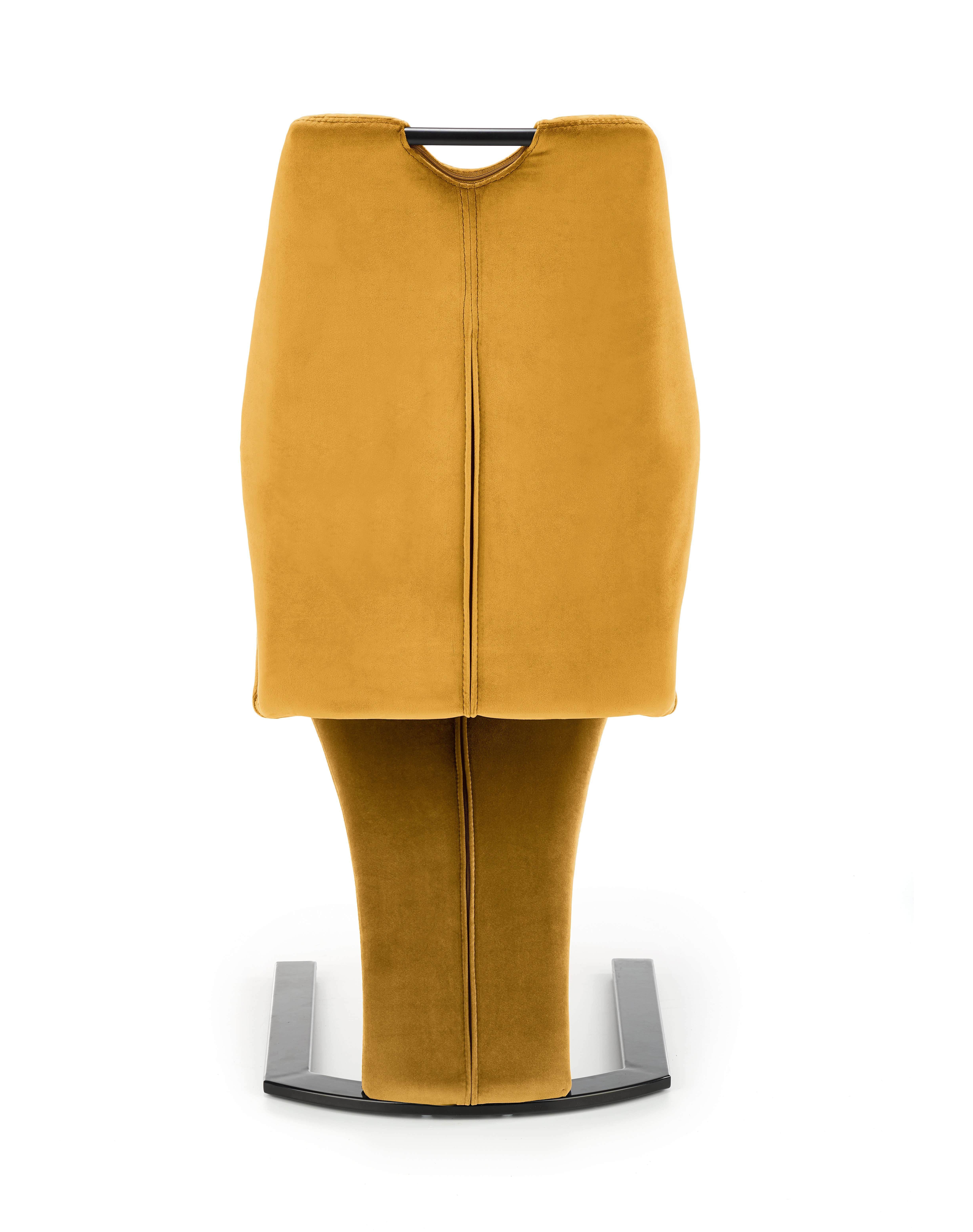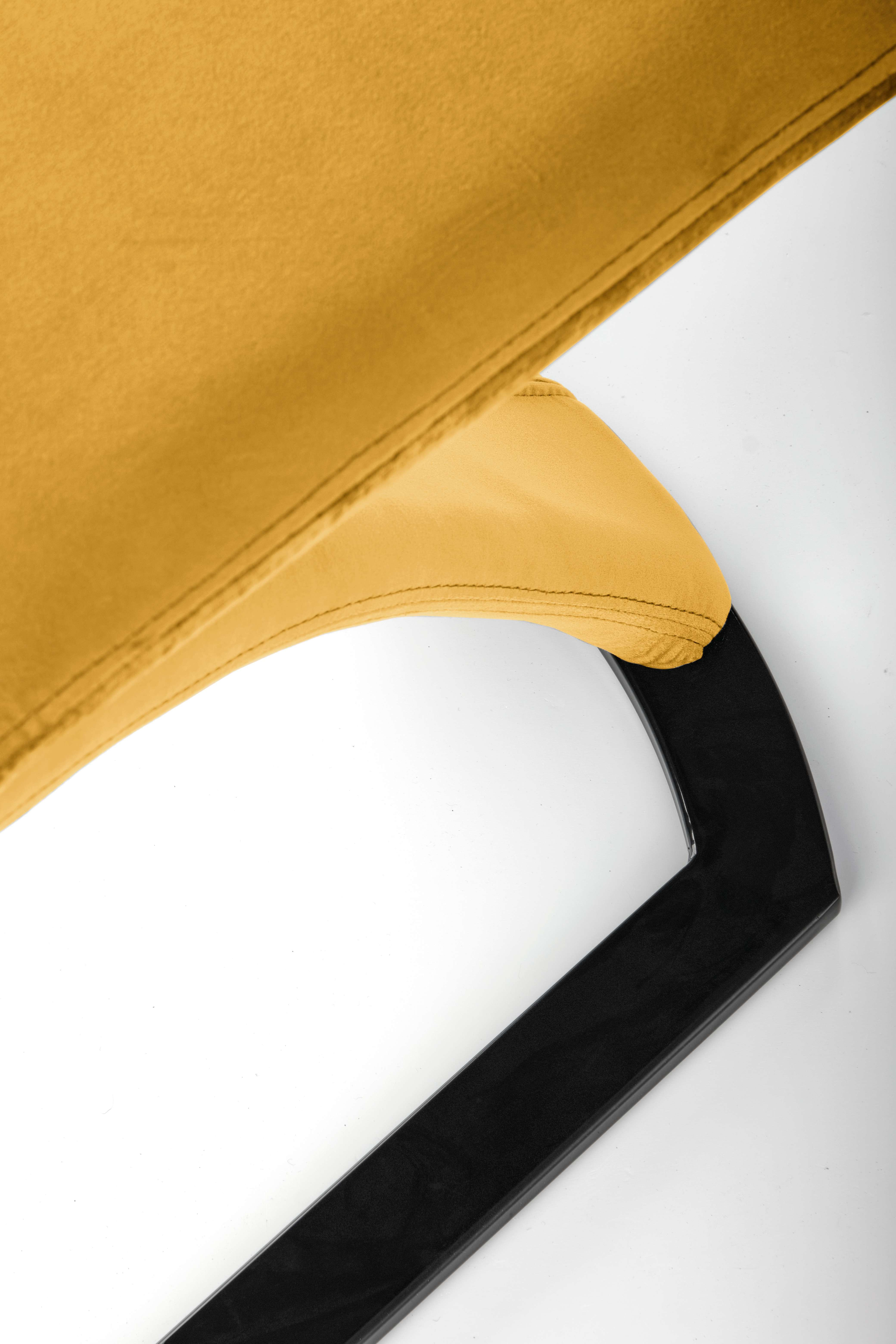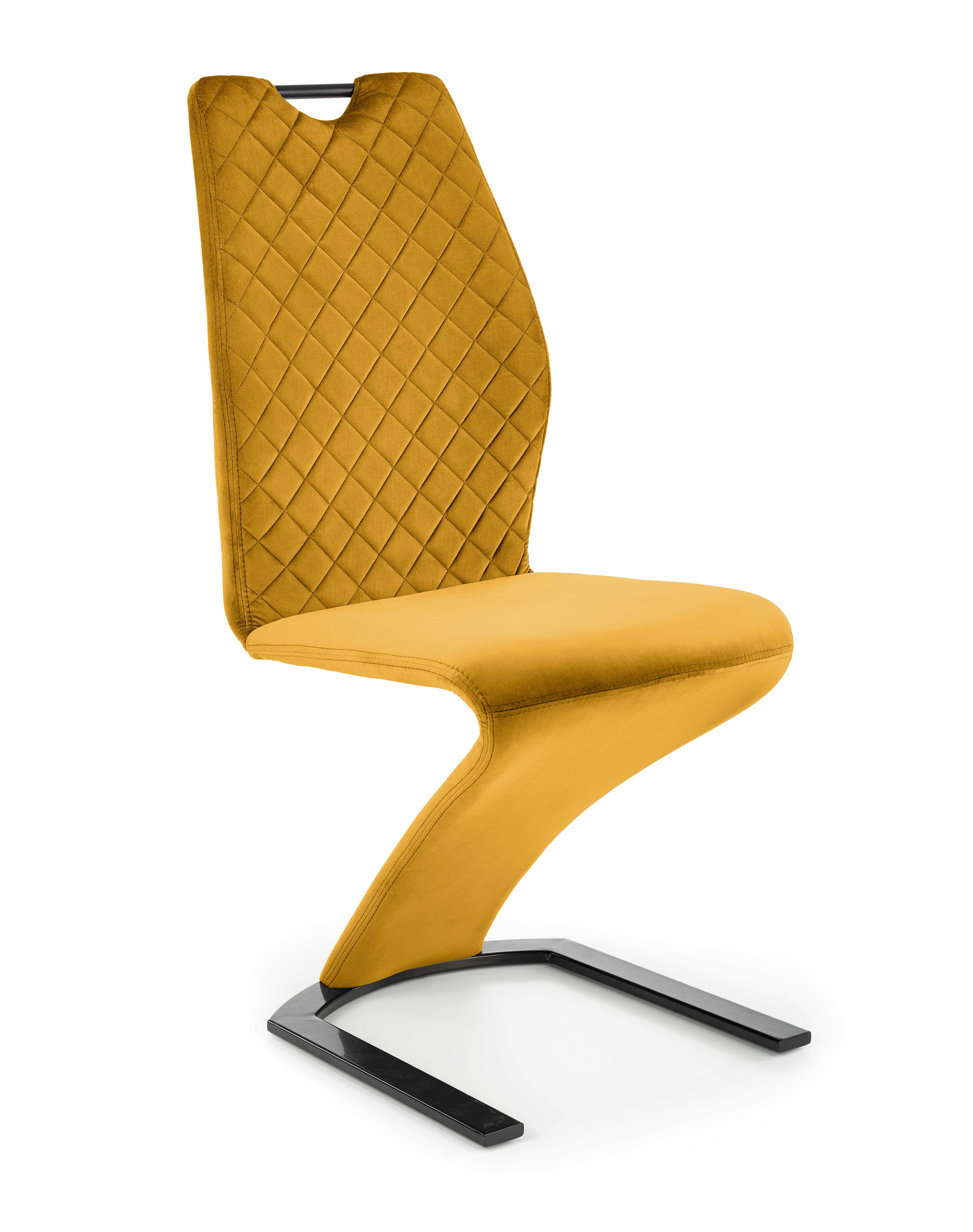 Jídelní židle K442Stylová jídelní židle K442 je čalouněna sametovou látkou v barvě hořčicová. Stojí na designové pohupovací podnoži z ocele lakované černou barvou. Židle má vysokou zádovou opěrku pro maximálně pohodlné sezení