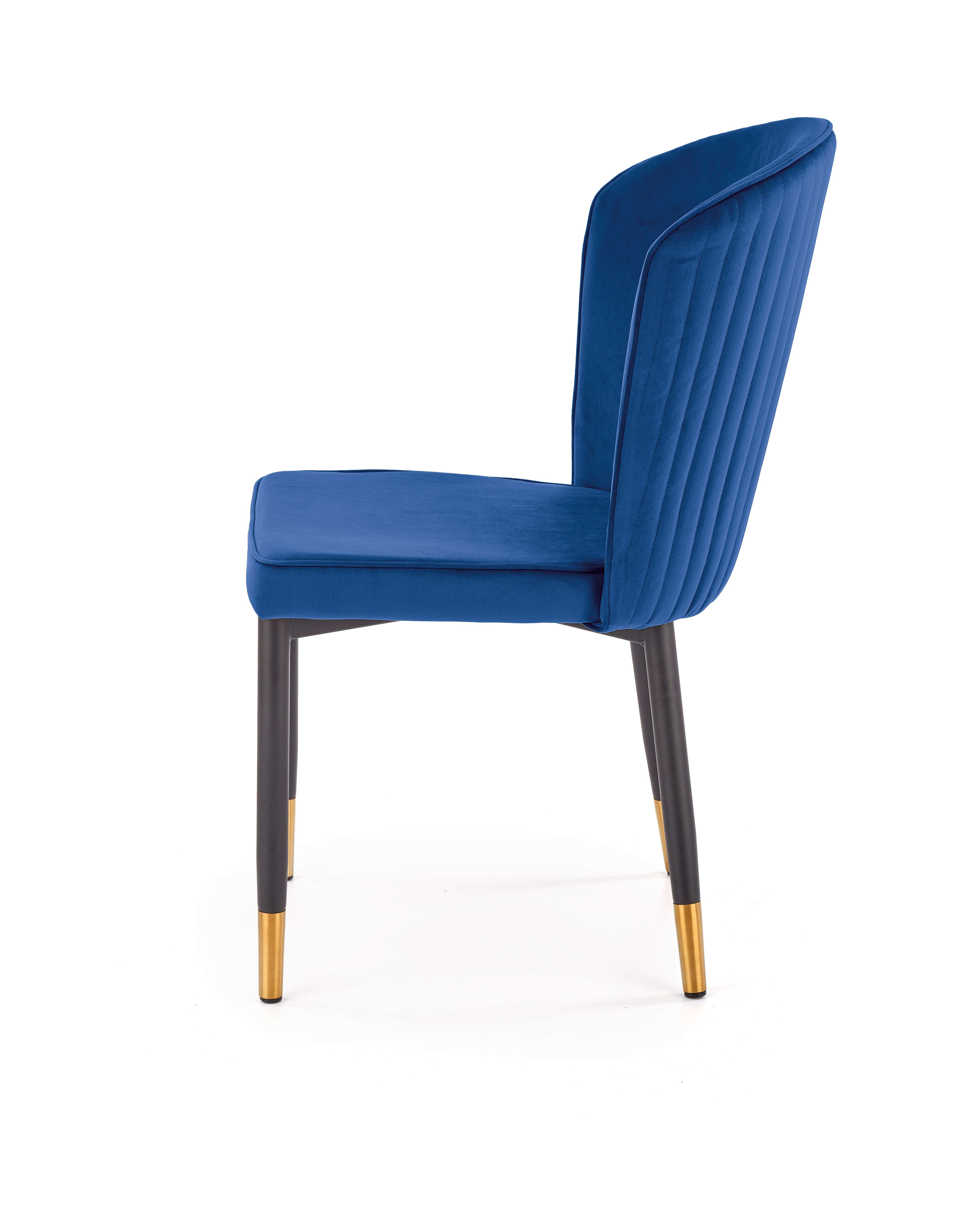 Jídelní židle K446Elegantní jídelní židle K446 je vyrobena v kombinaci kovové podnože z práškově lakované ocele a čalouněná sametovou potahovou látkou s prošíváním. Černé nohy jsou ve spodní části ozdobené zlatou barvou.