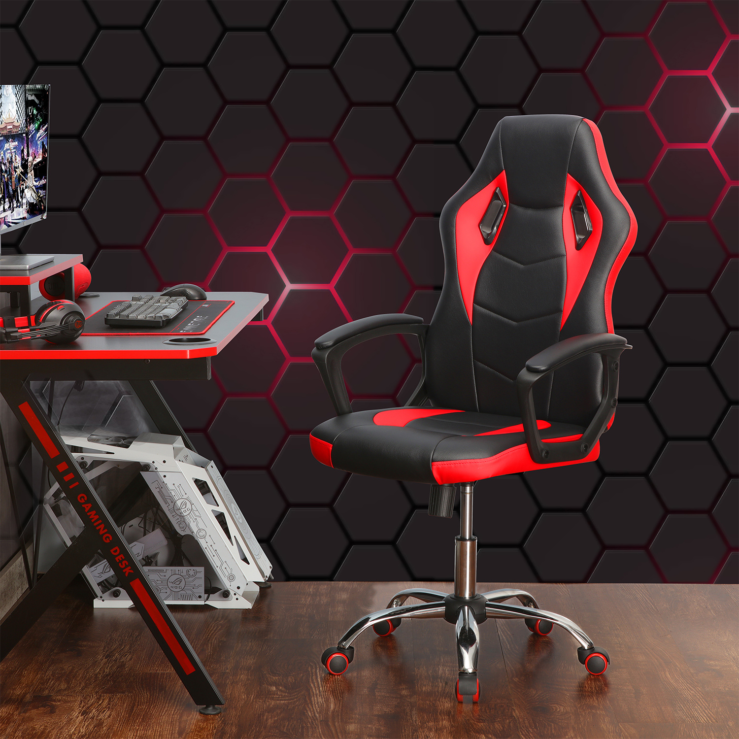 potah kůže – imitace, barevné provedení černá / červená výškově nastavitelné, houpací mechanismus chromovaný kříž, PU kolečka v červené barvě