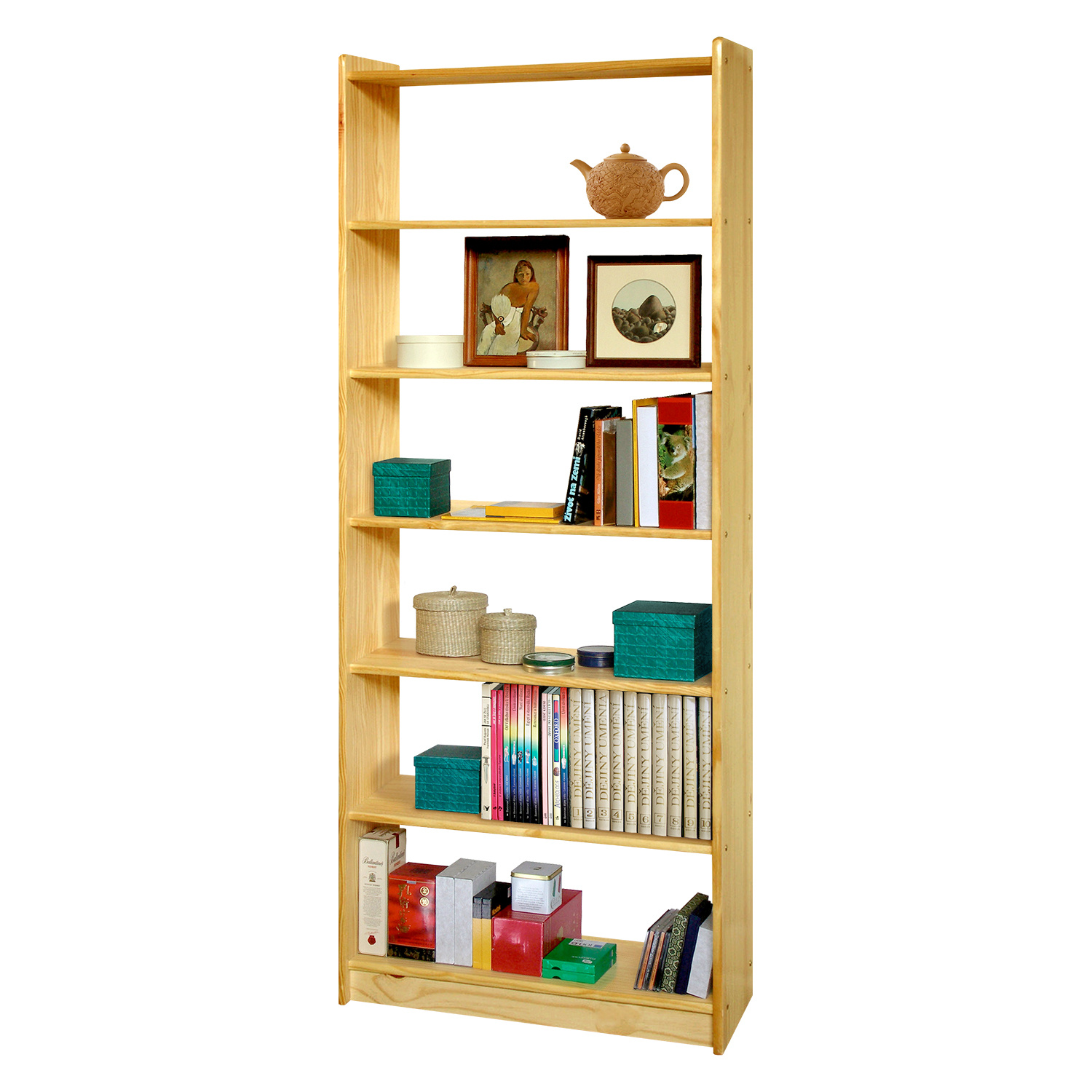 Knihovna je vyrobená z masivního borovicového dřeva lakovaného v přírodní barvě. Otevřená police disponuje pěti policemi. Tato moderní knihovna je díky svému provedení vhodná k využití do všech moderních interiérů. Zboží je dodáváno v demontu.