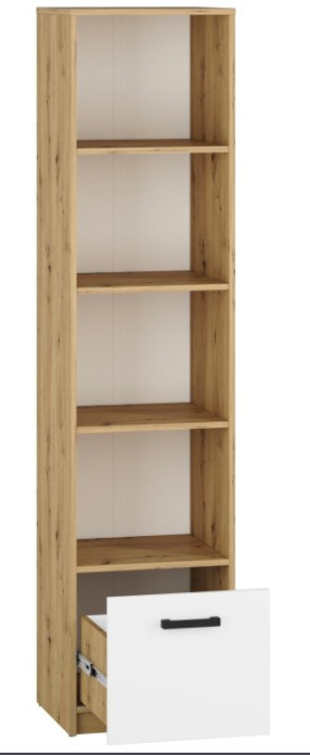 Knihovna FINI 04 je součástí systémového nábytku FINI ale lze ji použít i samostatně nebo k jinému nábytku. Konstrukce a přední díly jsou vyrobeny z kvalitního a odolného lamina v dekoru dřeva v kombinaci s bílou a antracitovou barvou. Úchytky jsou plastové v černé barvě.