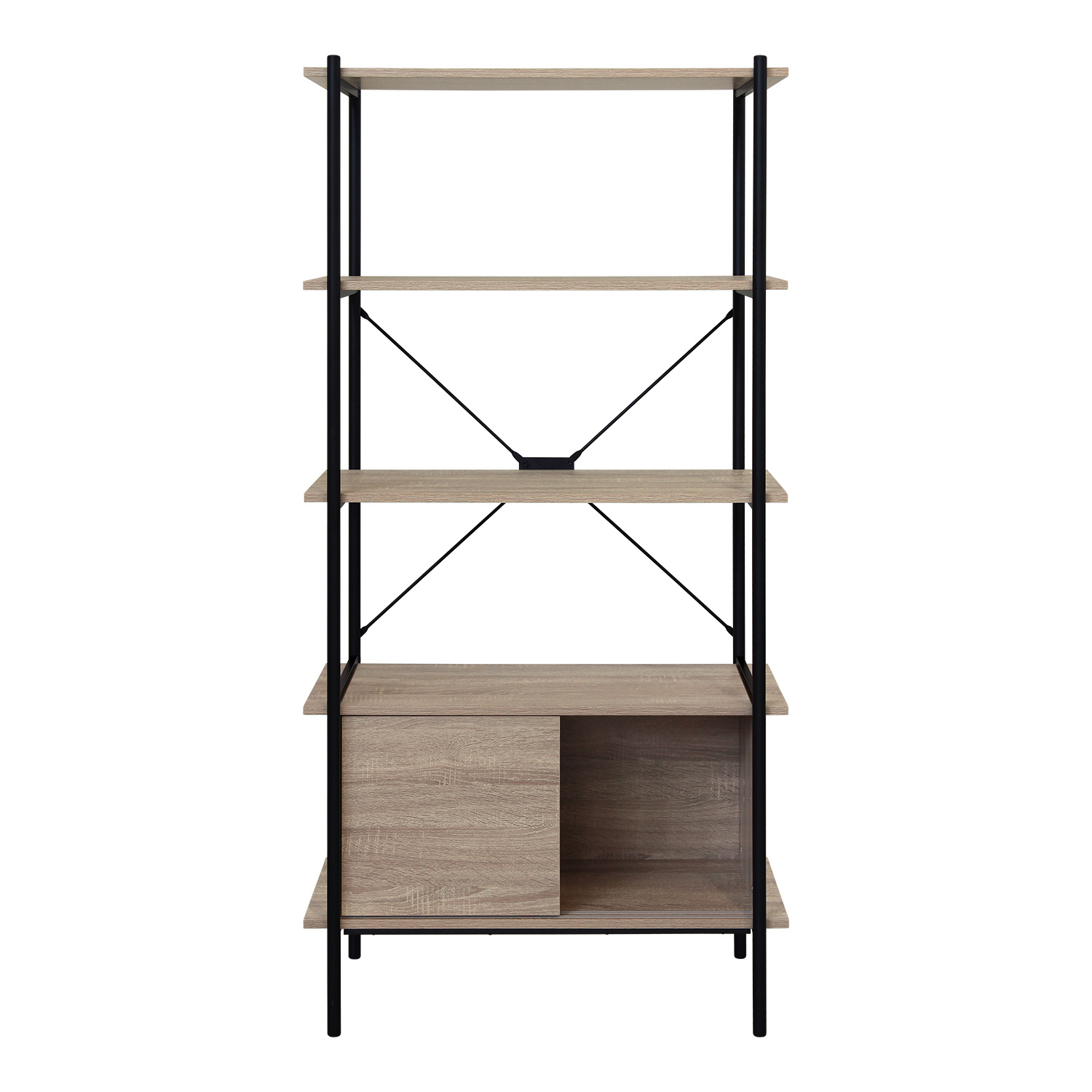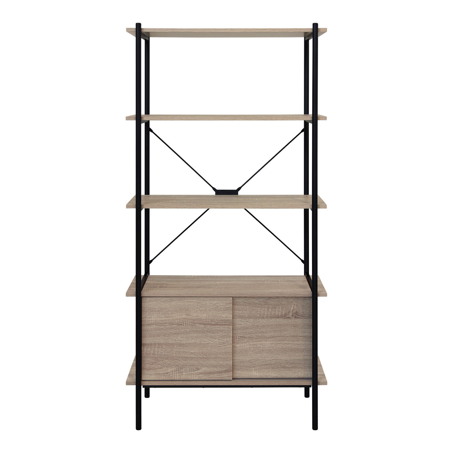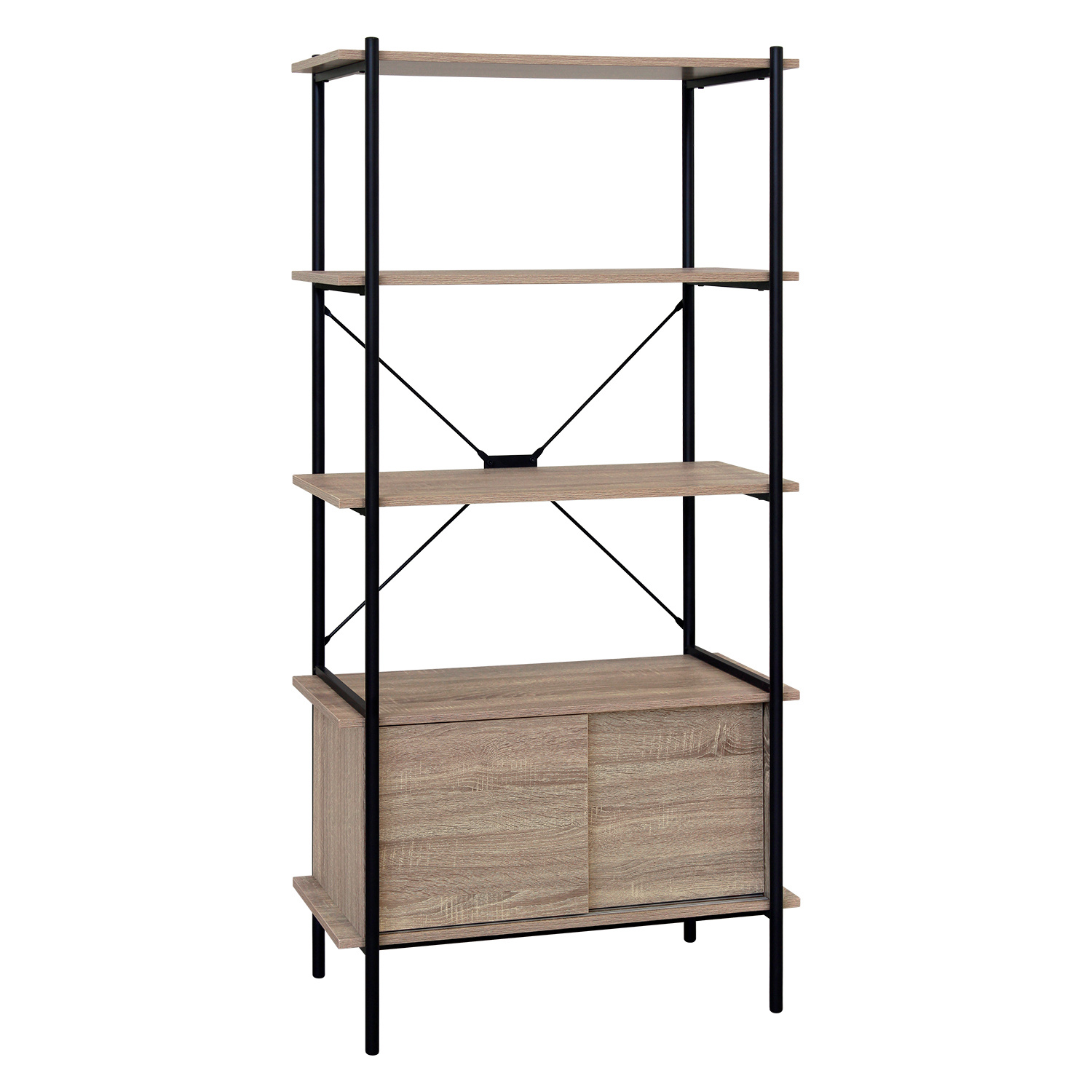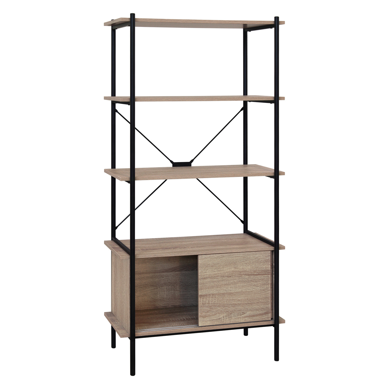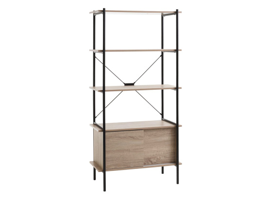 Knihovna v provedení kovová konstrukce černé barvy. 3 police a skříňka s posuvnými dvířky v barevném provedení dub sonoma. Zboží dodáváme v demontu.