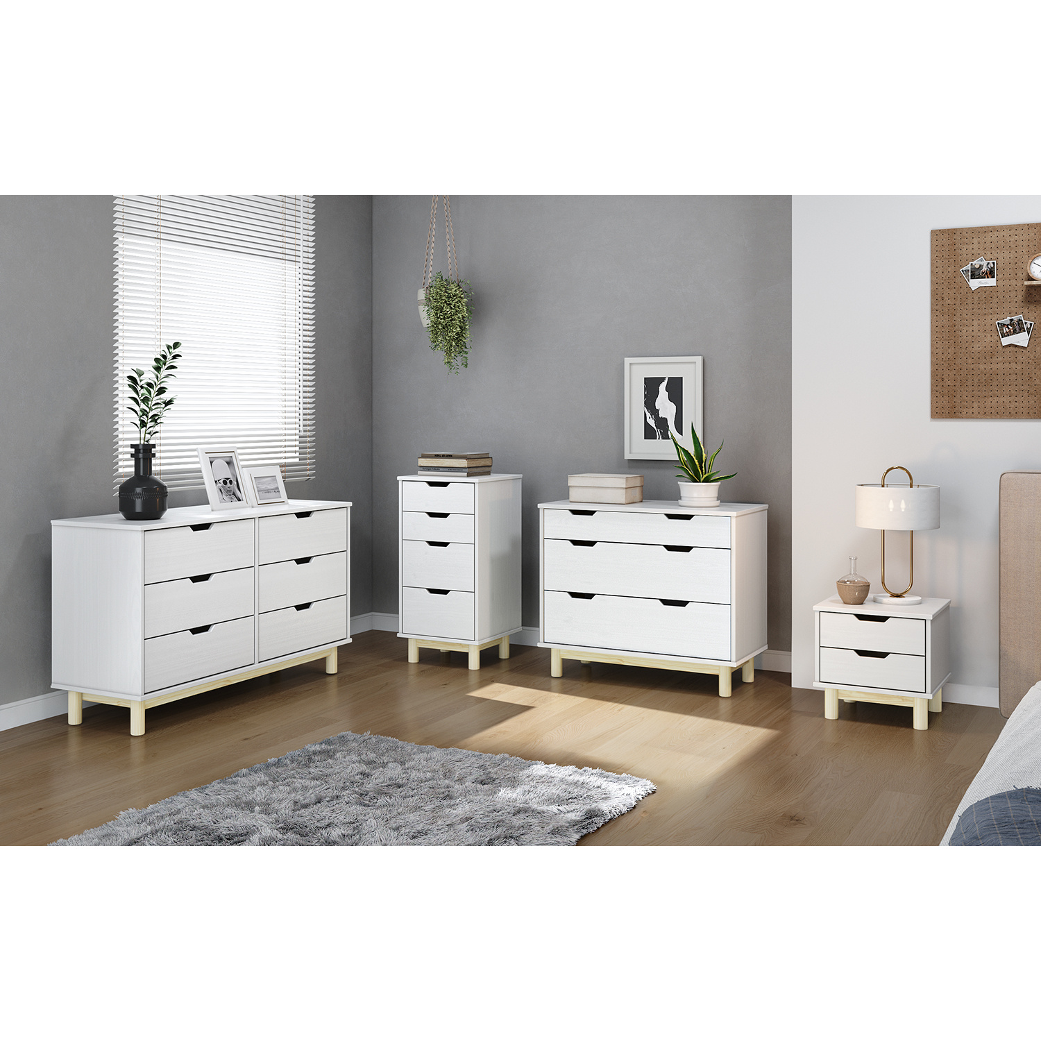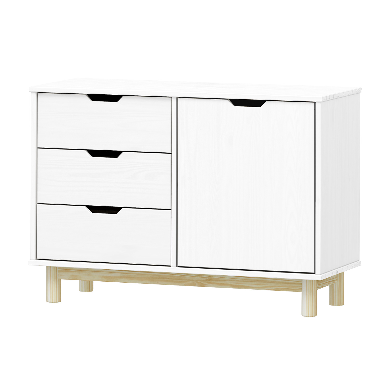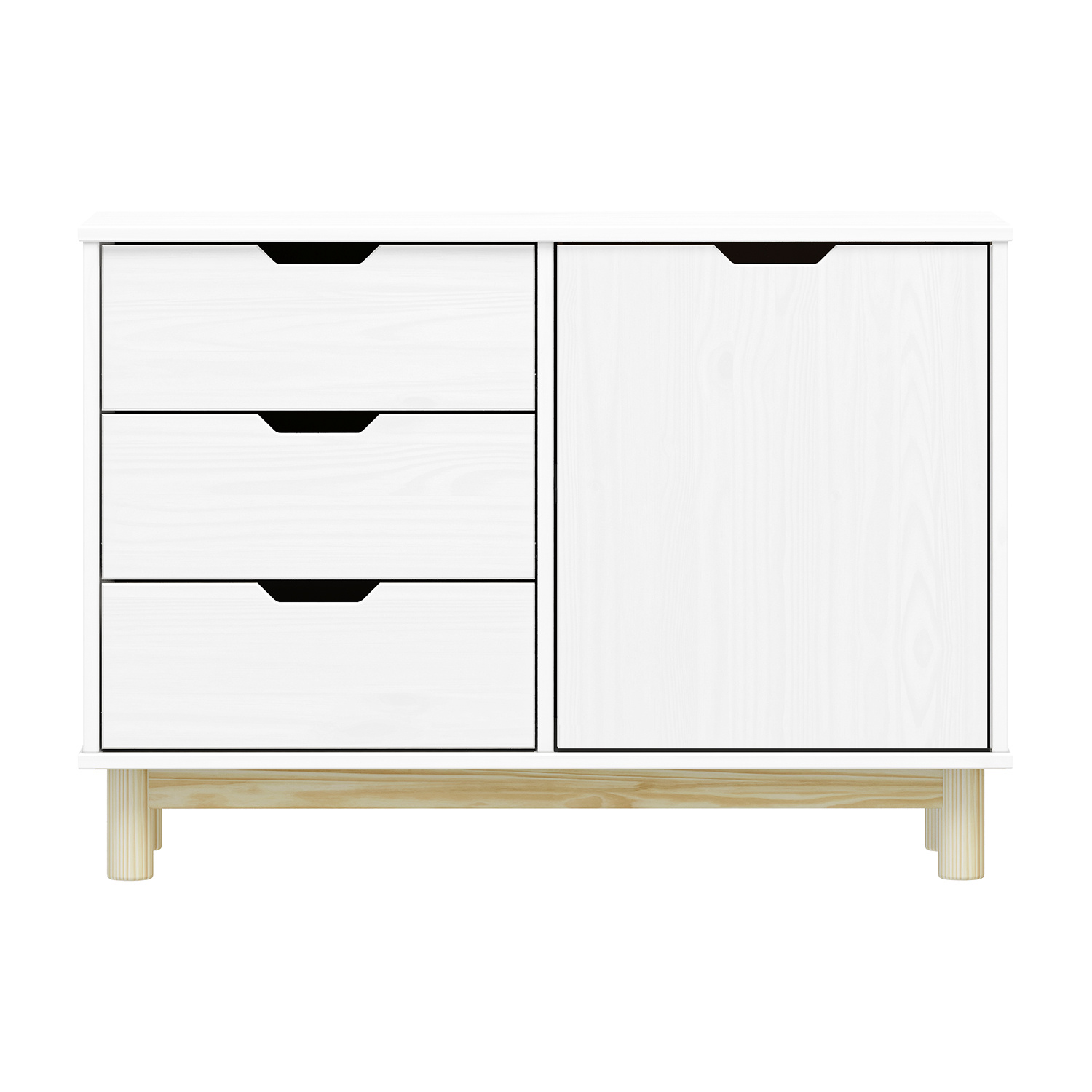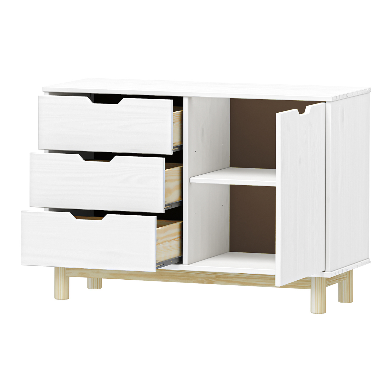 materiál masiv borovice, barevné provedení bílý lak 3 zásuvky s kovovými pojezdy, 1 dvířka, 1 police