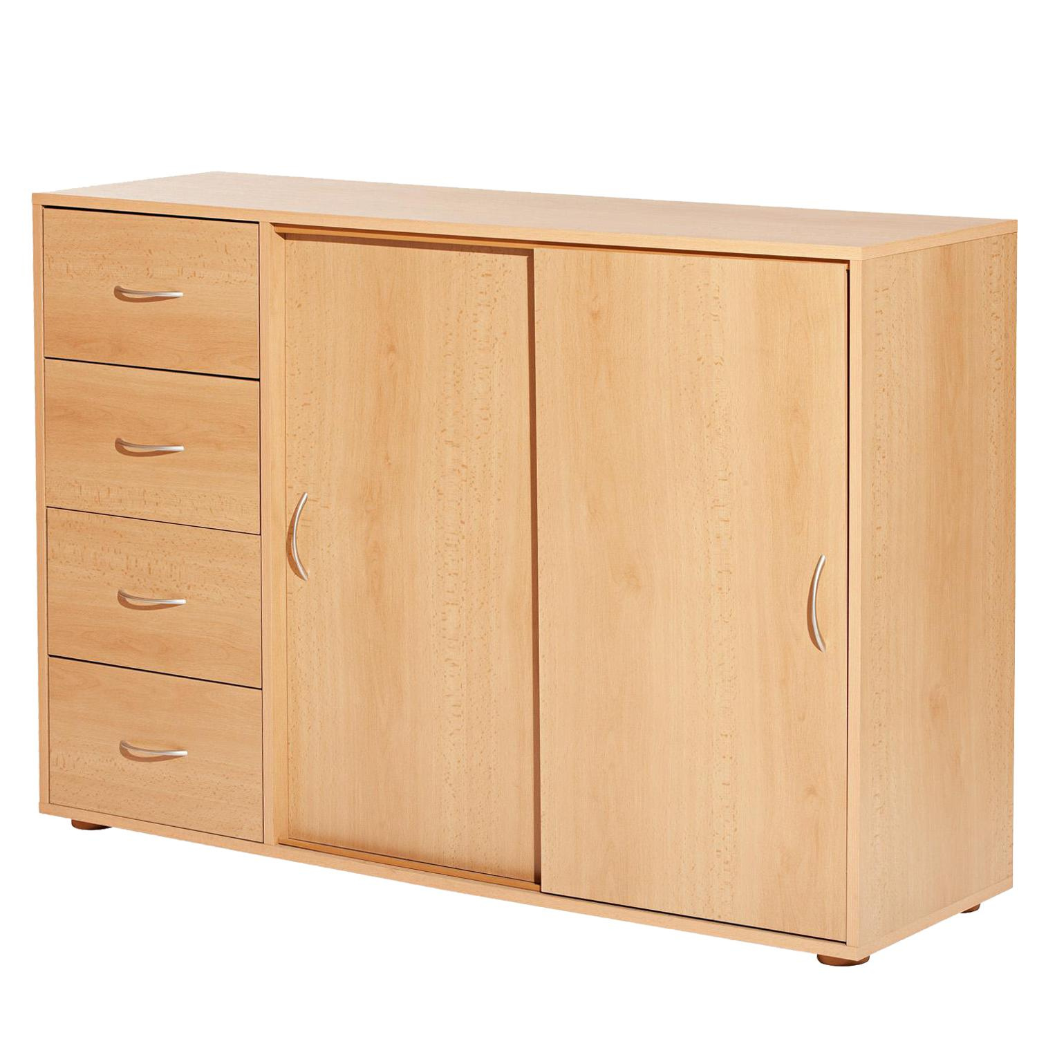 Moderní komoda je vyrobena z lamina v barvě buk. Má 2 posuvná dvířka, 1 variabilní polici a 4 zásuvky. Hloubka zásuvek 30cm. Komodu lze umístit do jakékoli místnosti, hodí se na ukládání dokumentů, oblečení i nerůznějších věcí. Zboží dodáváme v demontu.