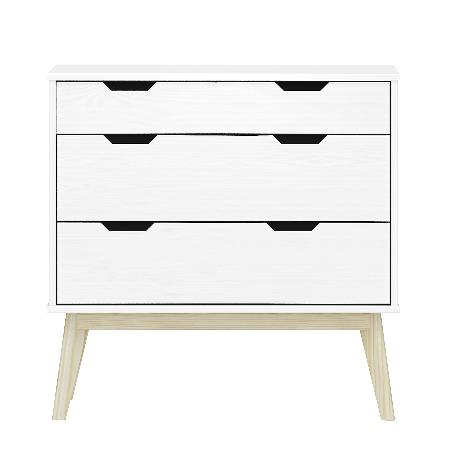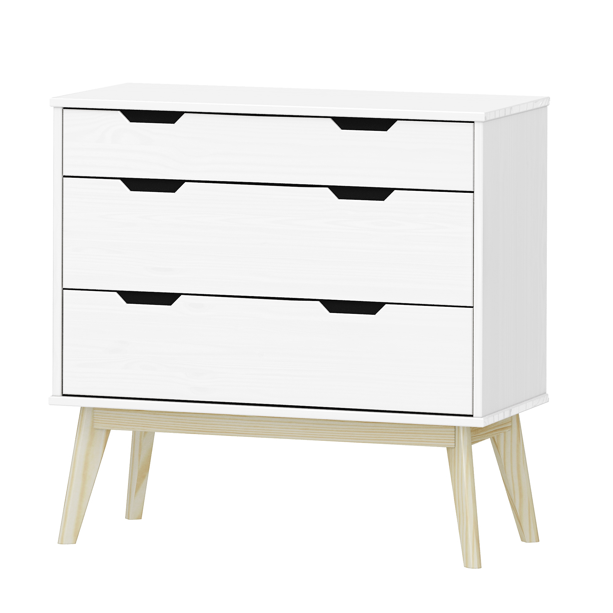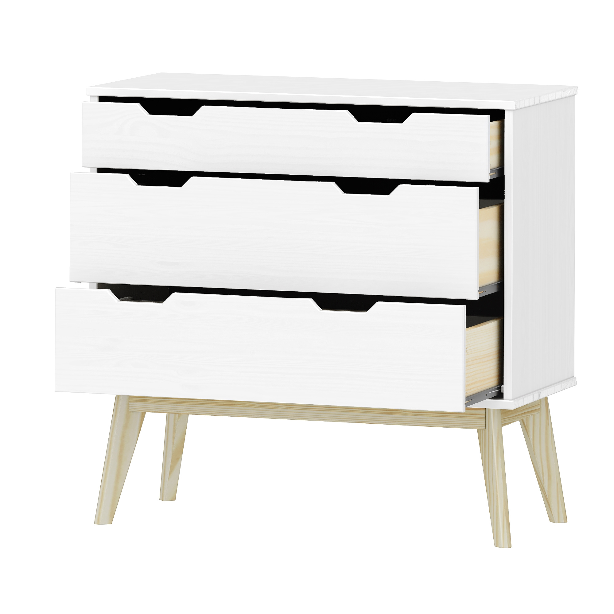 materiál masiv borovice, barevné provedení bílý lak 1 menší a 2 větší zásuvky s kovovými pojezdy