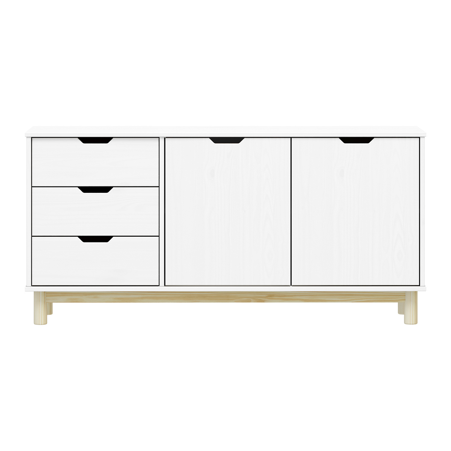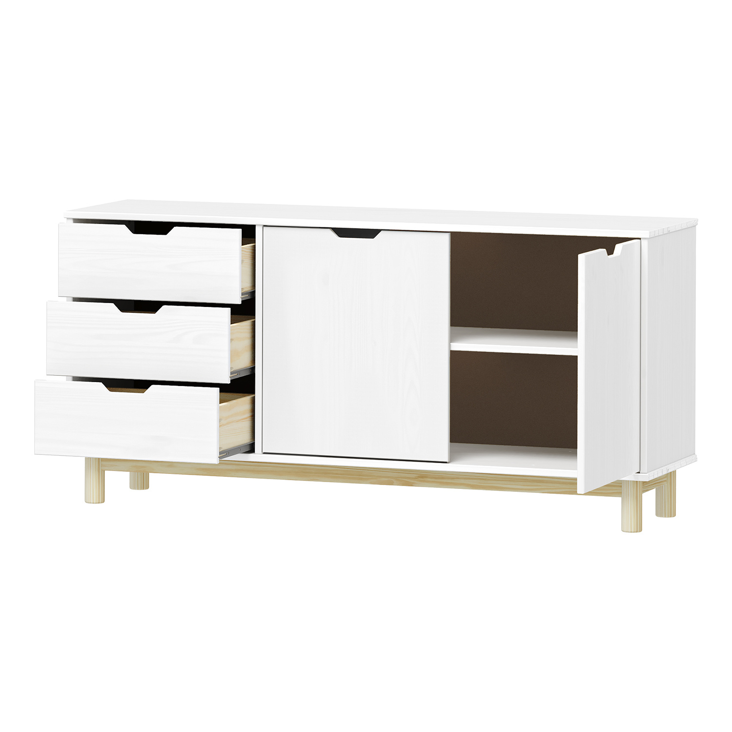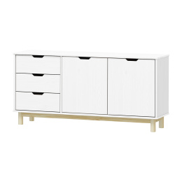 materiál masiv borovice, barevné provedení bílý lak 3 zásuvky s kovovými pojezdy, 2 dvířka, 1 police