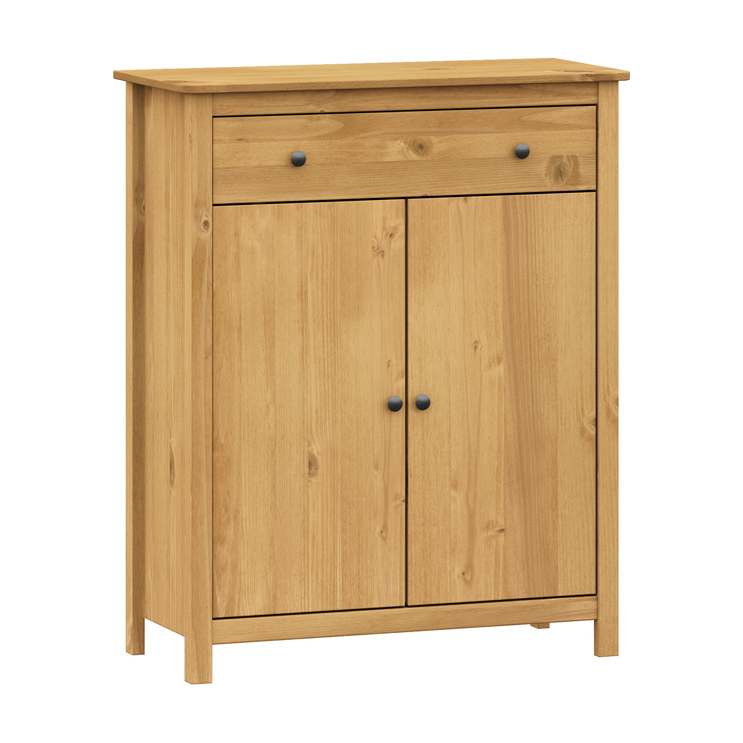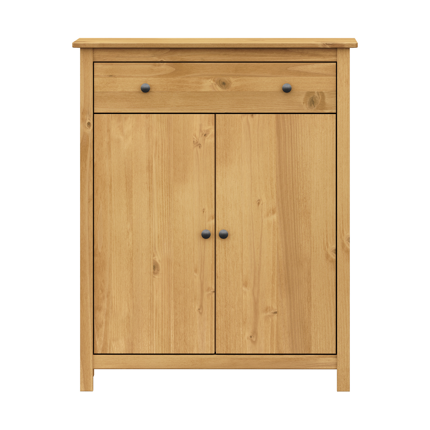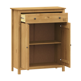 materiál masiv borovice voskovaná v medovém odstínu kovové úchytky v barevném provedení černěná mosaz 1 zásuvka s kovovými pojezdy, 2 plné dveře, 1 police maximální nosnosti uvedeny v návodu k montáži