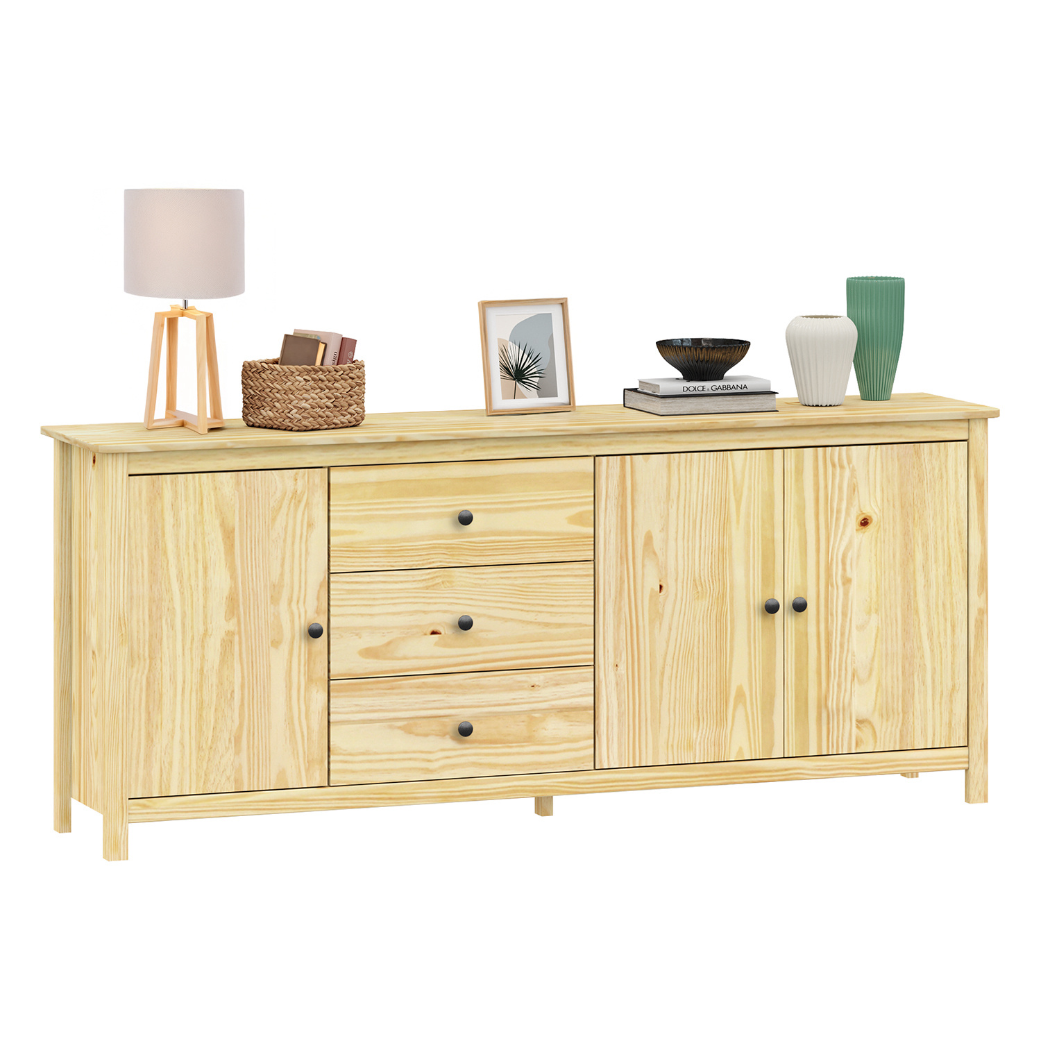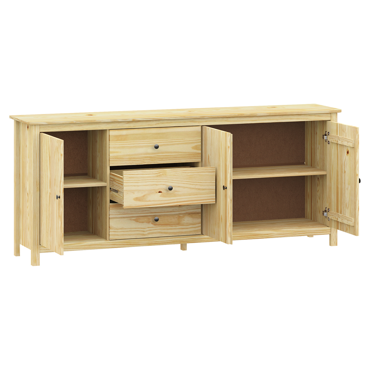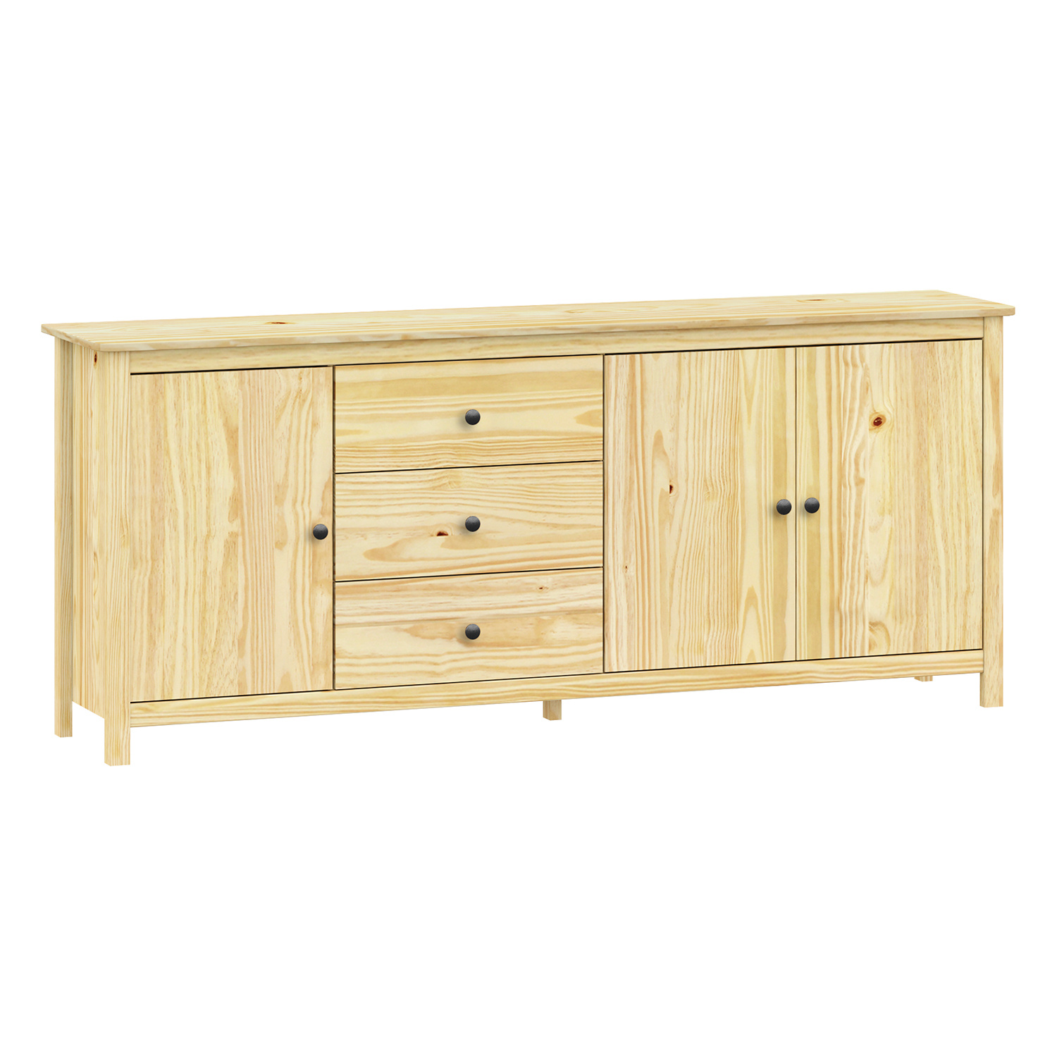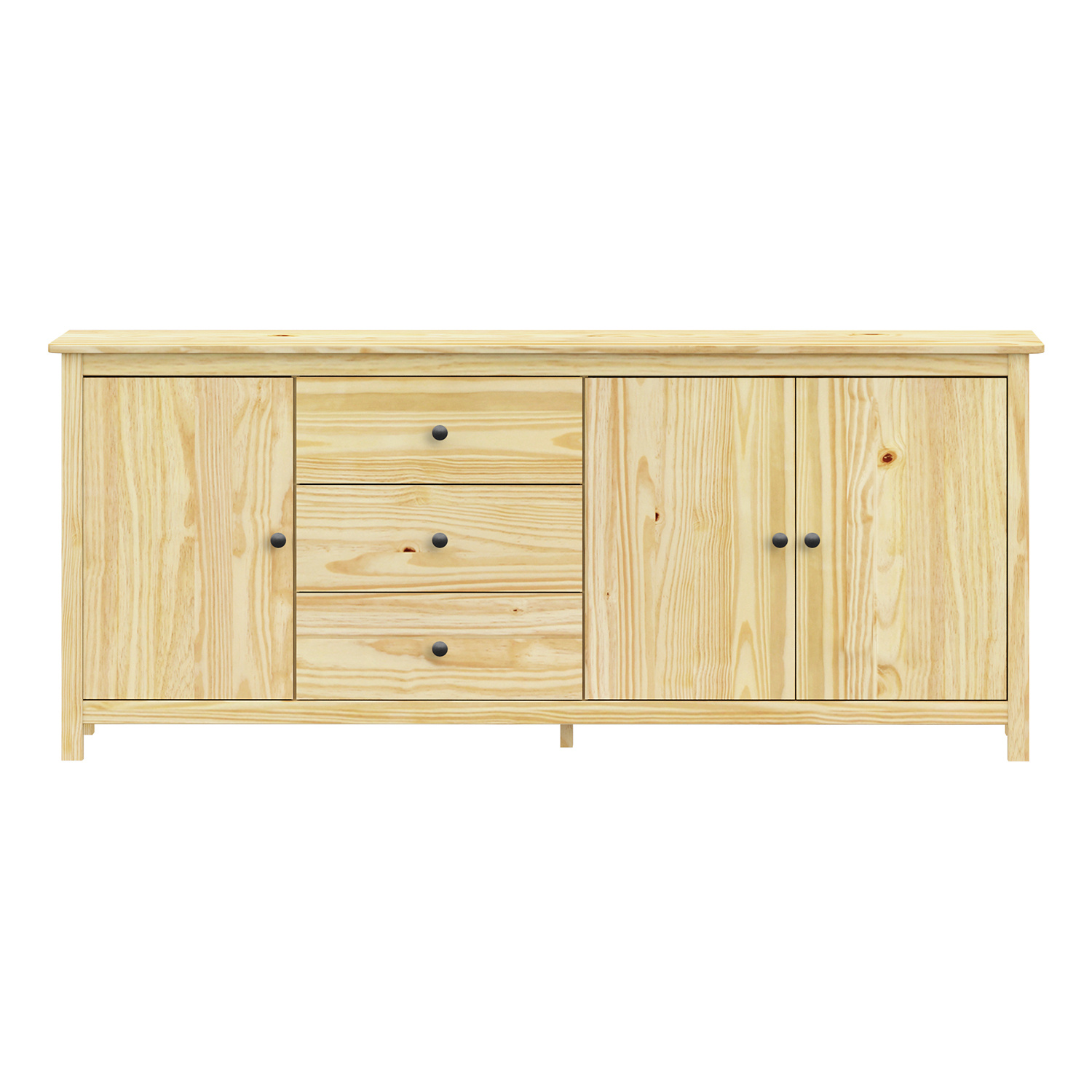 materiál masiv borovice, lakované provedení kovové úchytky v barevném provedení černěná mosaz 3 zásuvky s kovovými pojezdy, 3 plné dveře, 2 police maximální nosnosti uvedeny v návodu k montáži