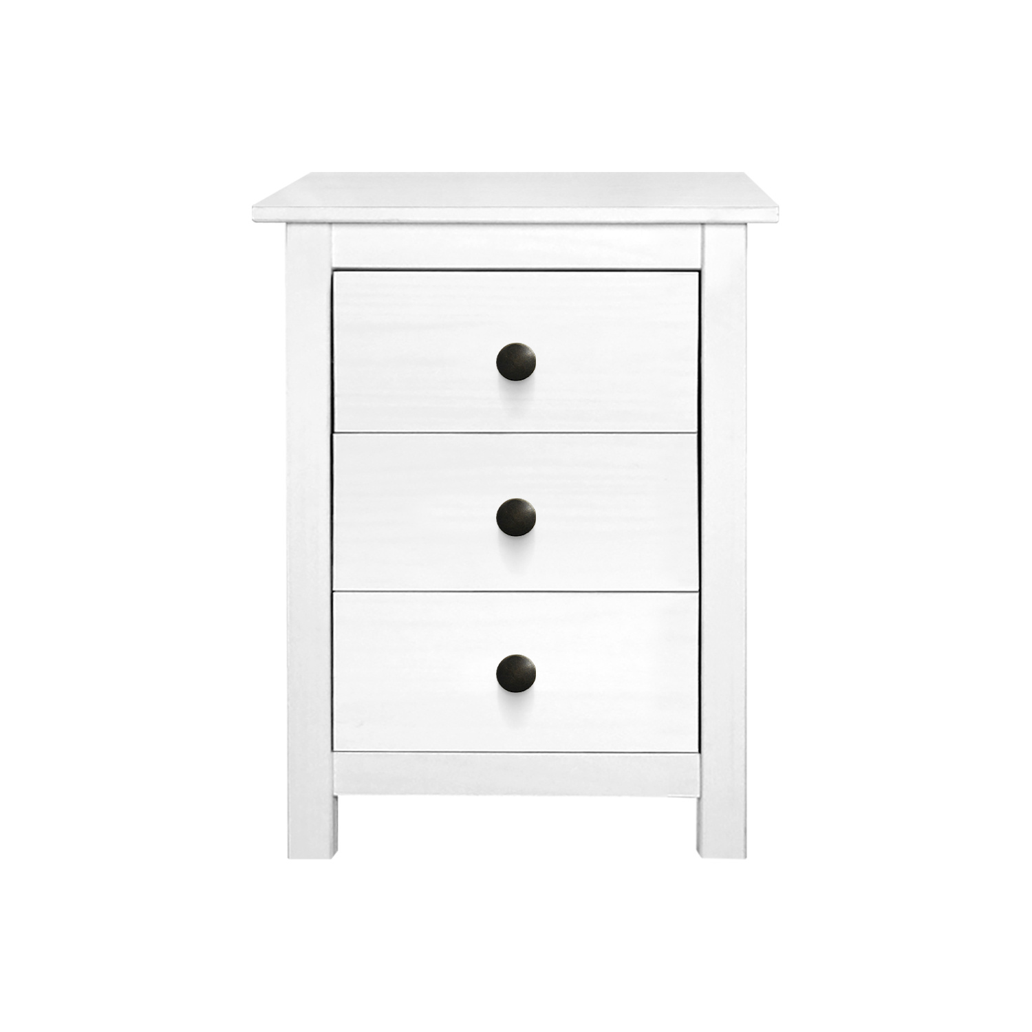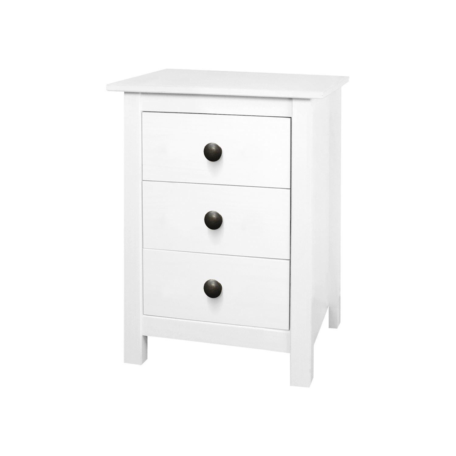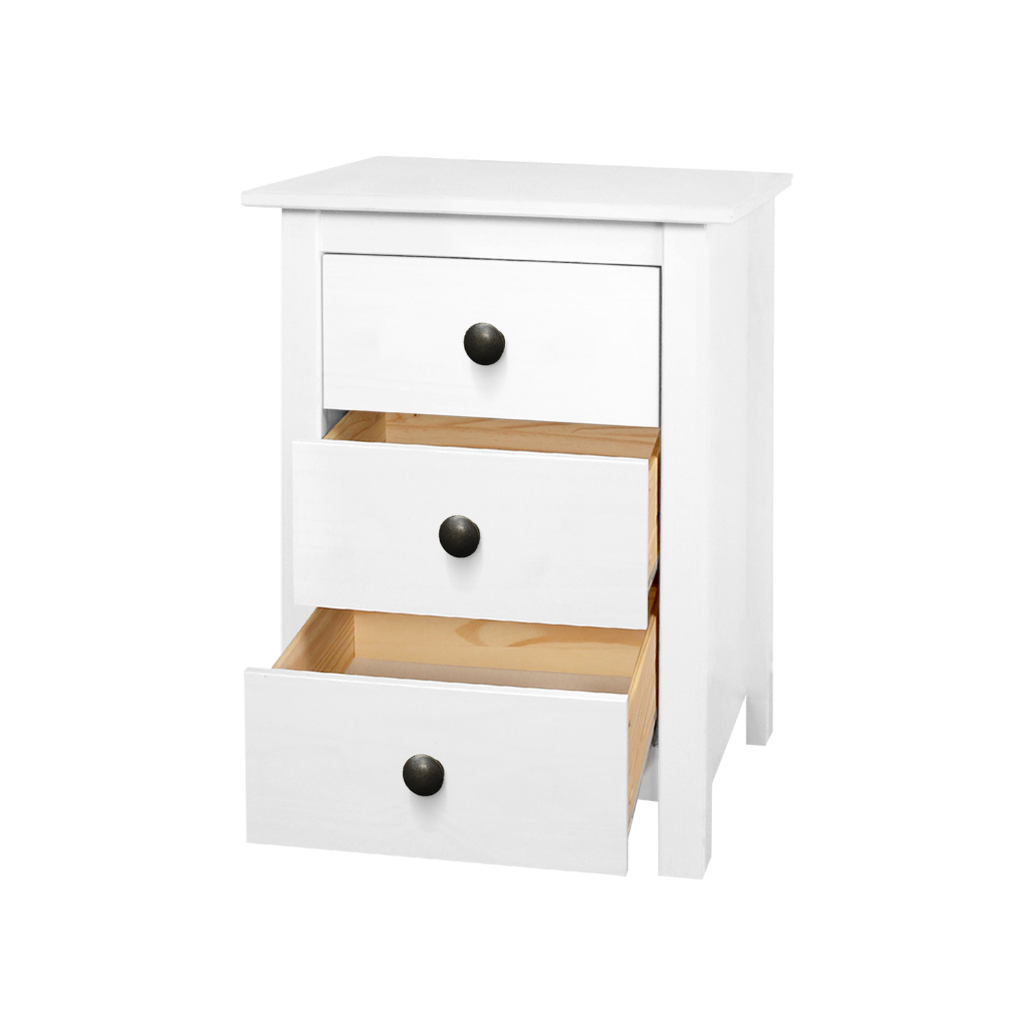 materiál masiv borovice, barevné provedení bílý lak kovové úchytky tři zásuvky s kovovými pojezdy
