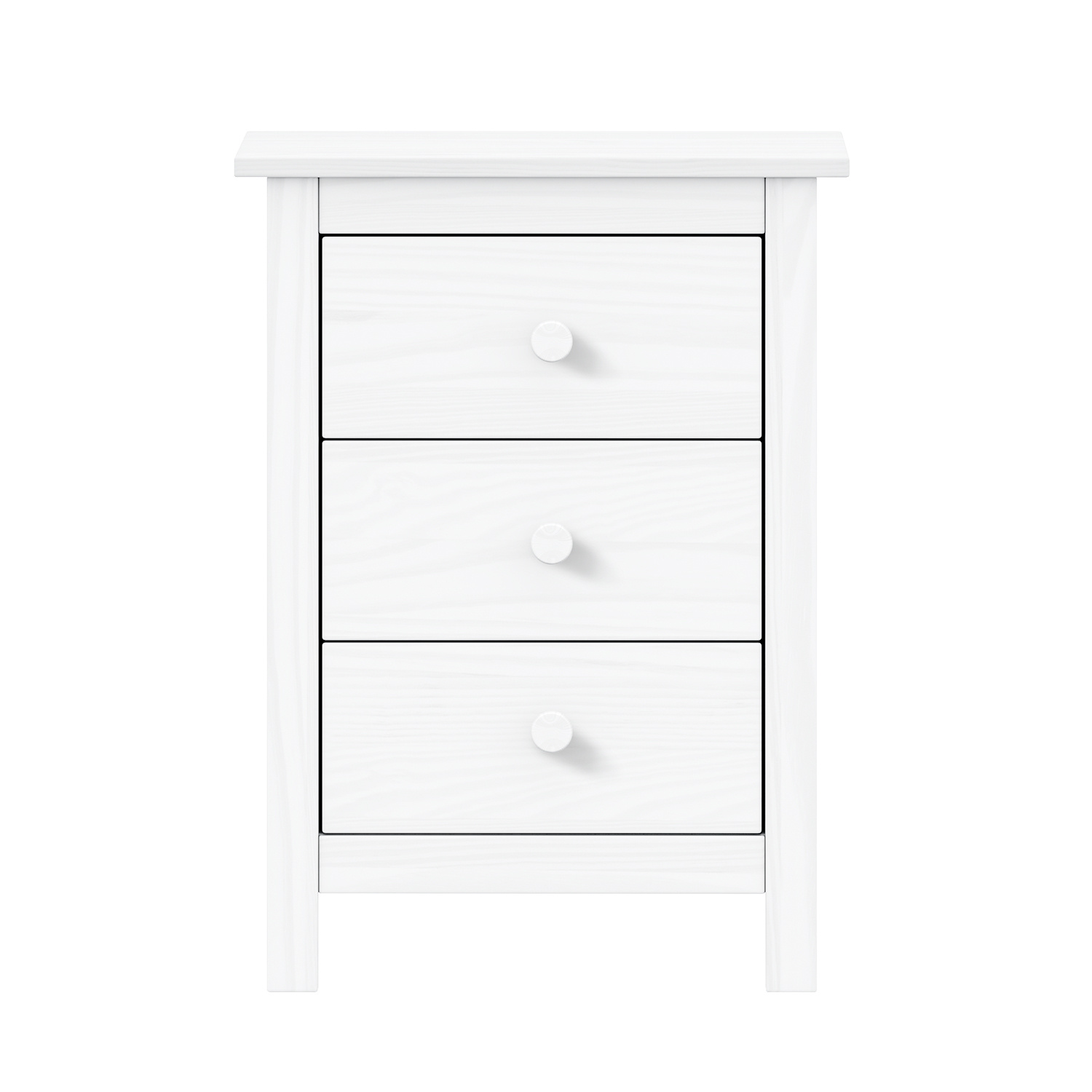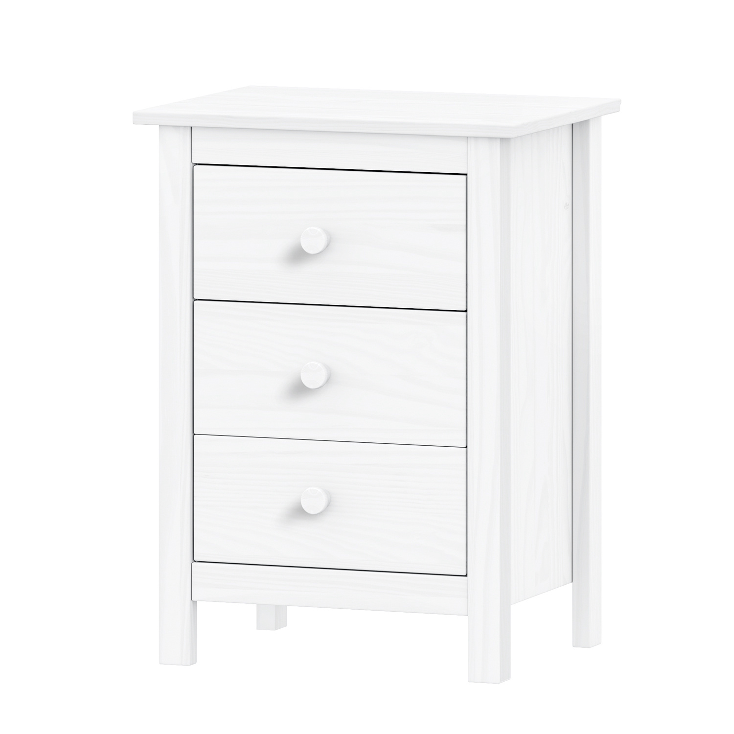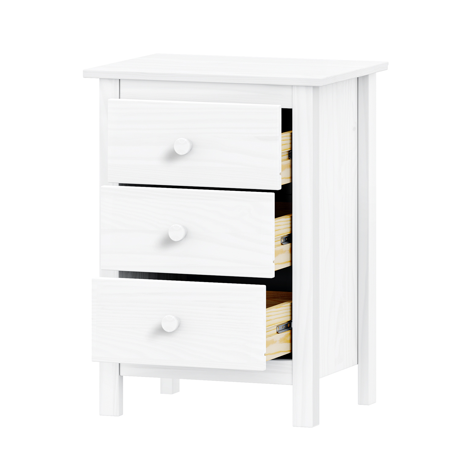 Komoda je vyrobena z materiálu masiv borovice v barevném provedení bílá. Má tři zásuvky s kovovými pojezdy. Zboží dodáváme v demontu.