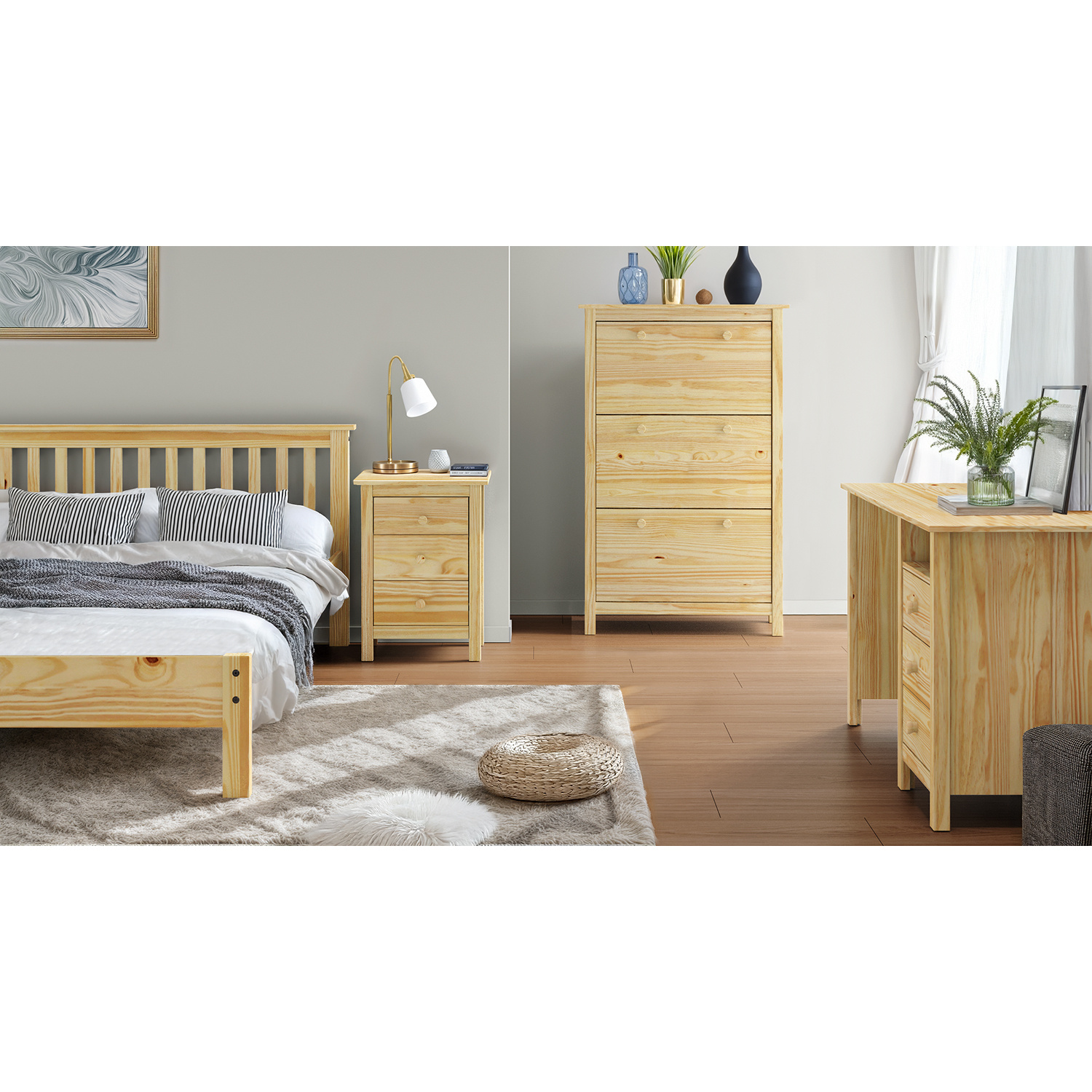 Komoda je vyrobena z materiálu masiv borovice v lakovaném provedení. Má tři zásuvky s kovovými pojezdy. Zboží dodáváme v demontu.