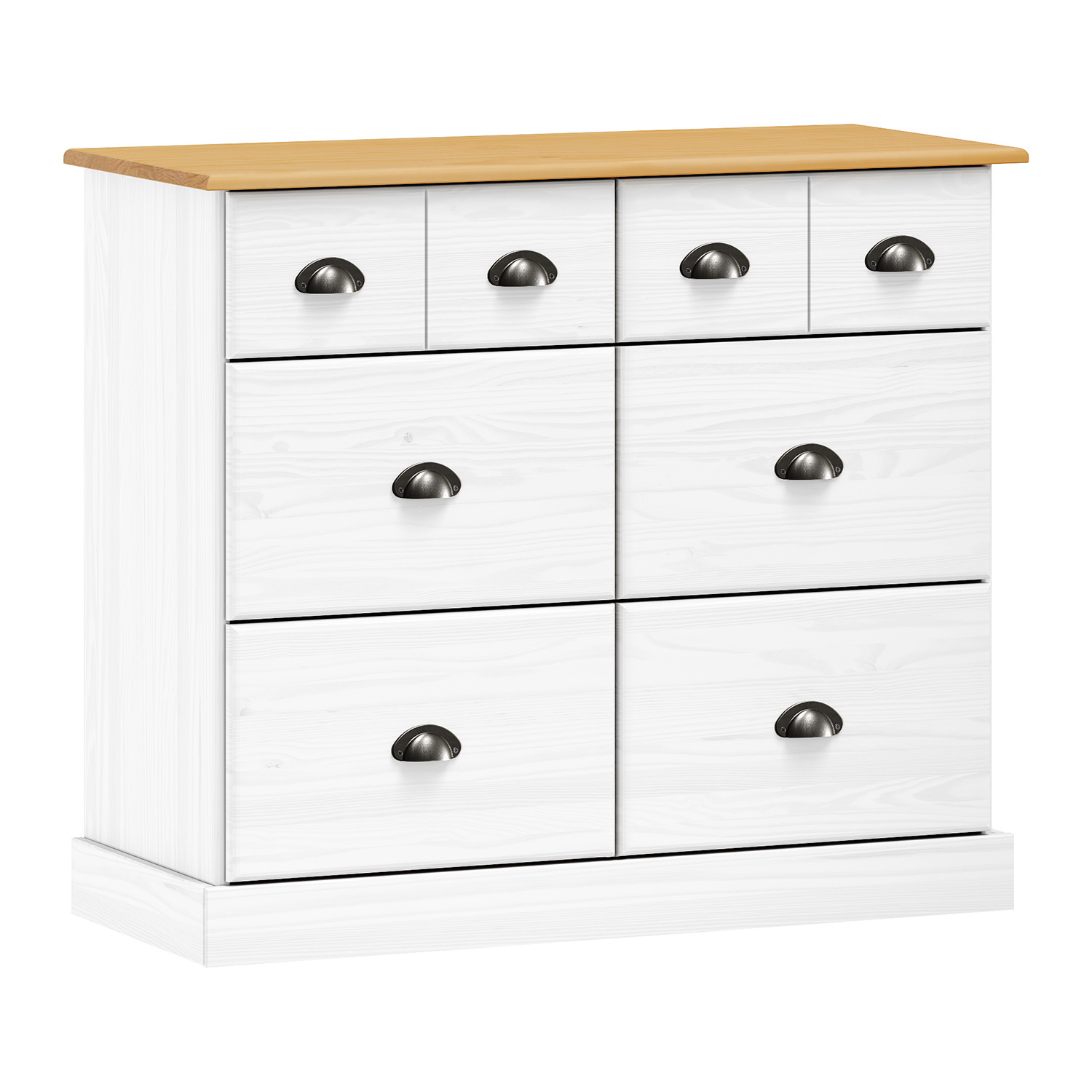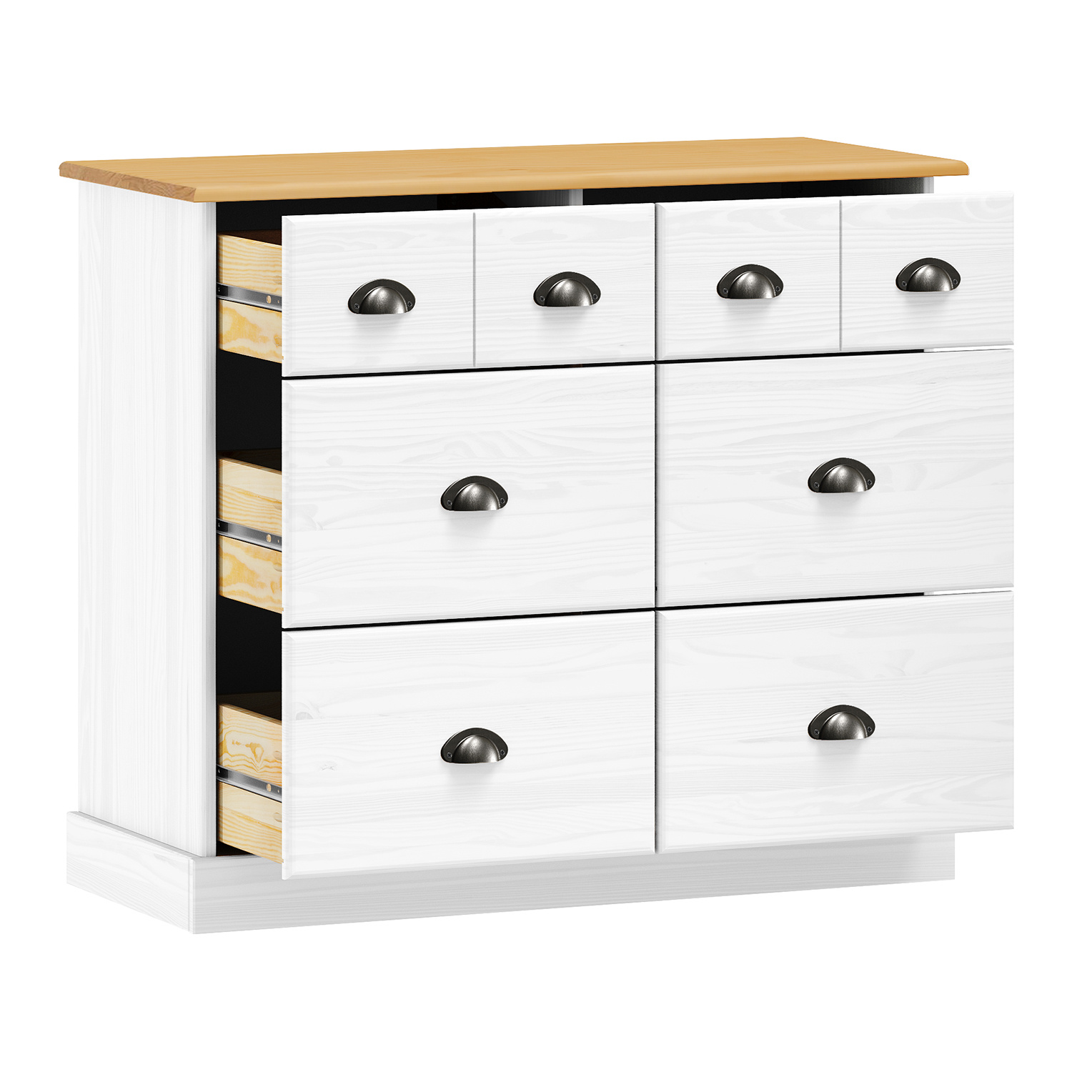 materiál masiv borovice, barevné provedení bílý lak 4 větší a 2 menší zásuvky s kovovými úchytkami a pojezdy