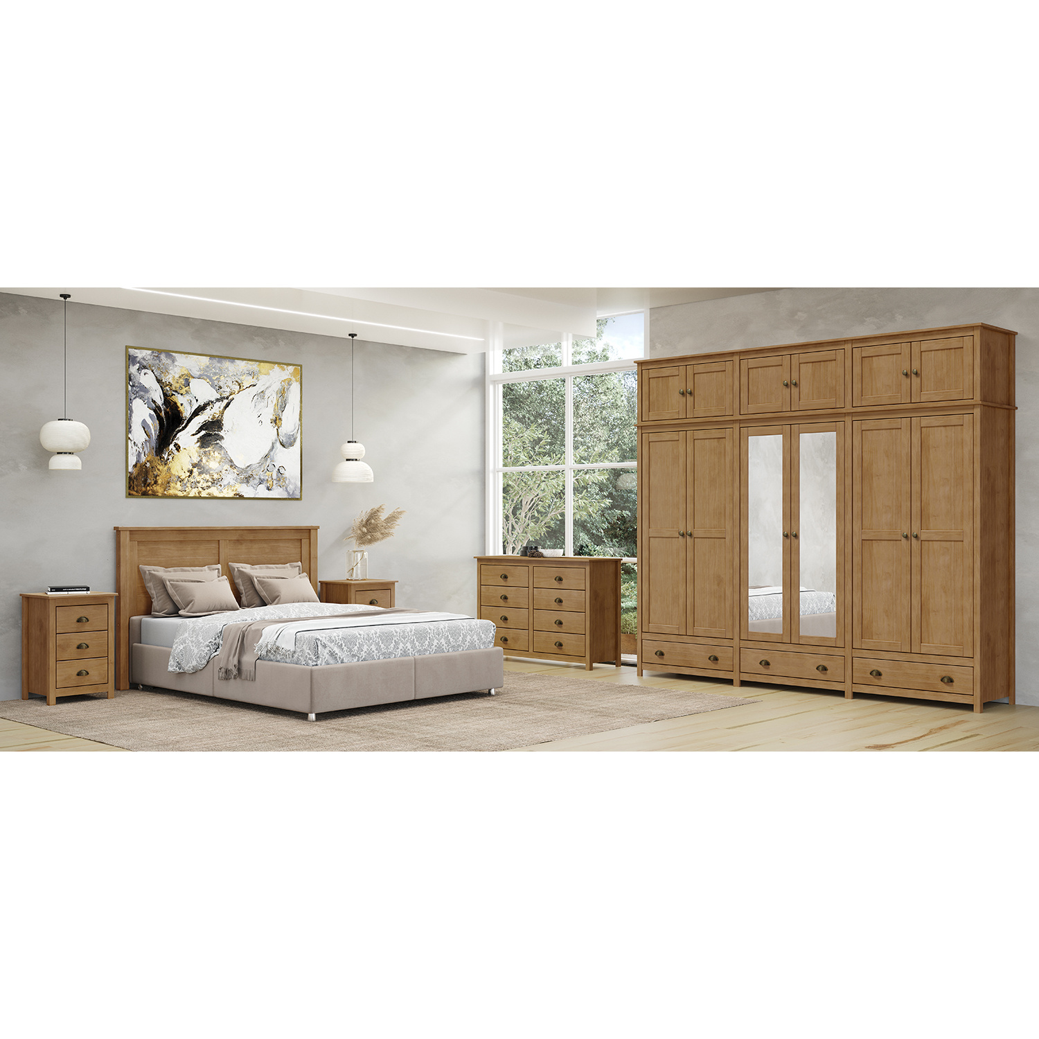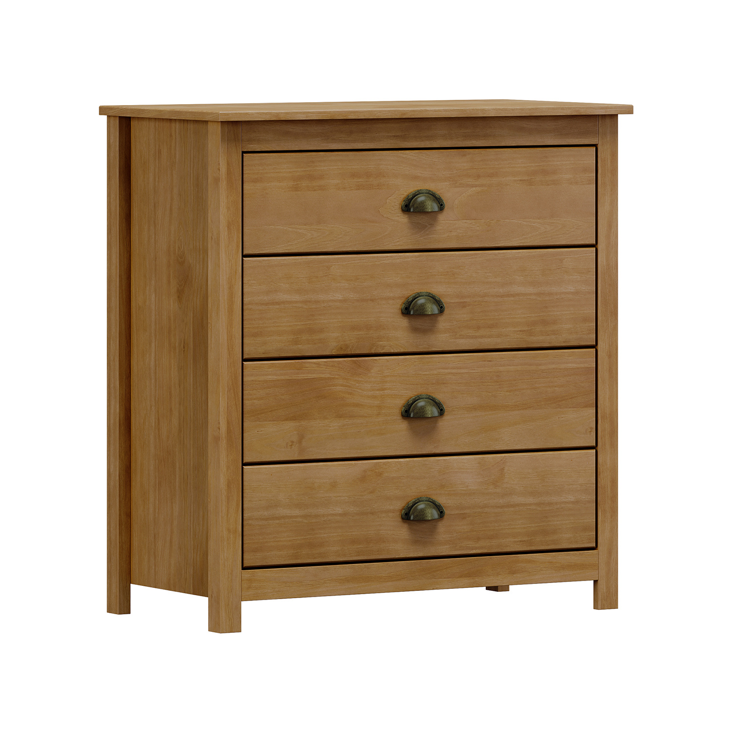 materiál masiv borovice, barevné provedení dub čtyři zásuvky s kovovými úchytkami a pojezdy