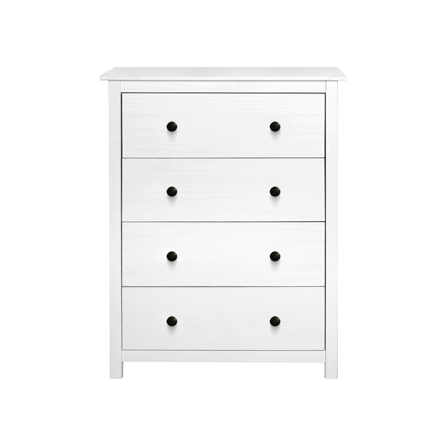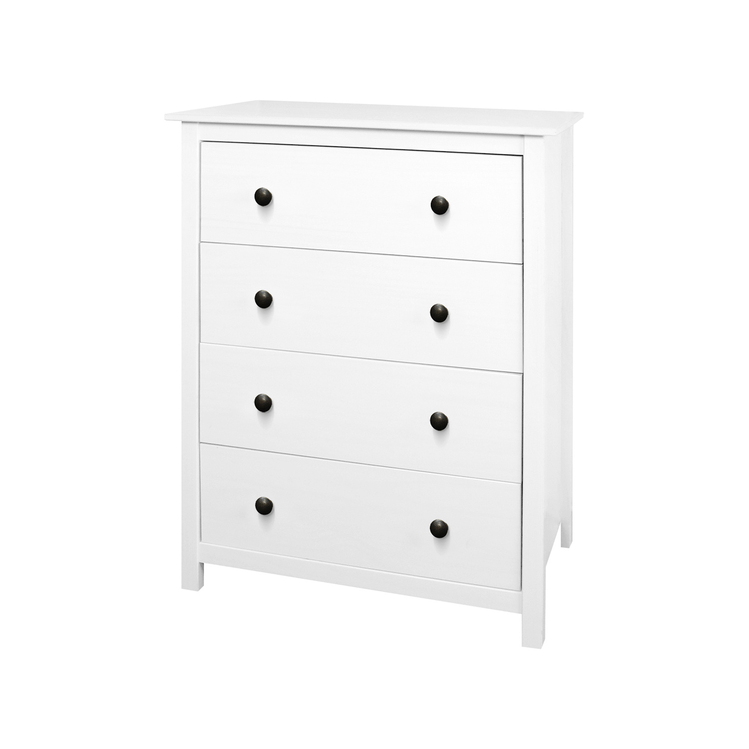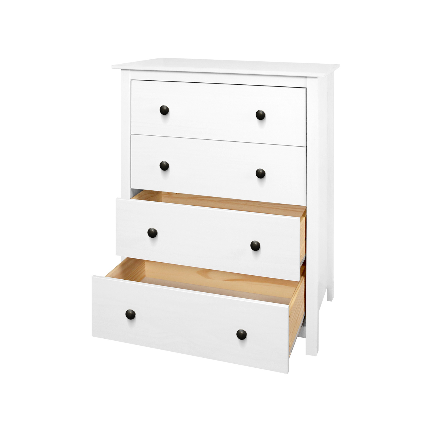 materiál masiv borovice, barevné provedení bílý lak kovové úchytky čtyři zásuvky s kovovými pojezdy