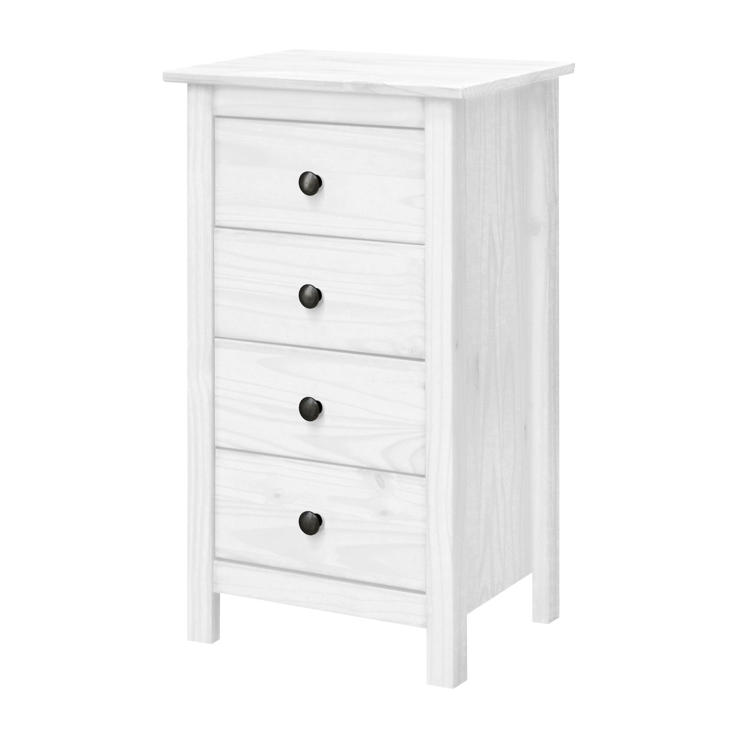 materiál masiv borovice, barevné provedení bílý lak kovové úchytky 4 zásuvky s kovovými pojezdy