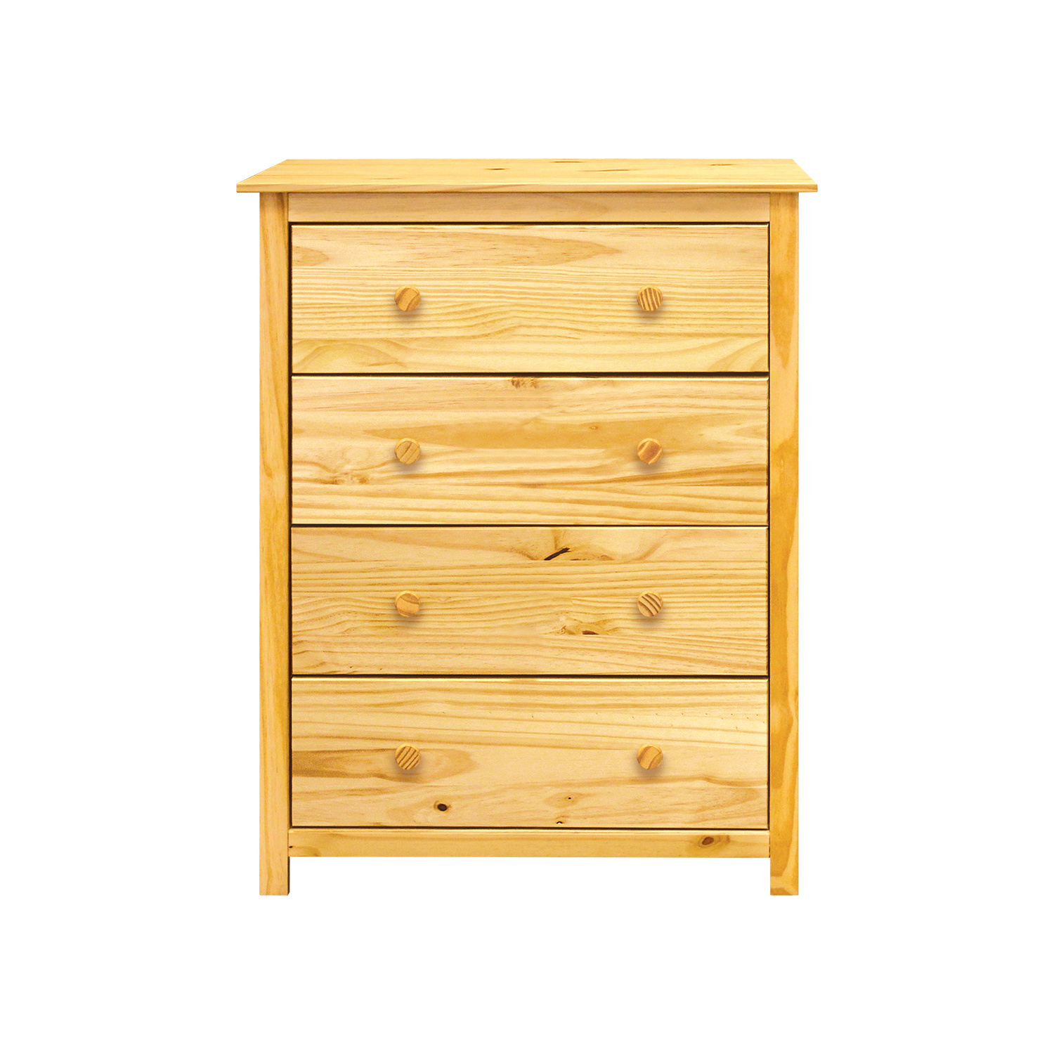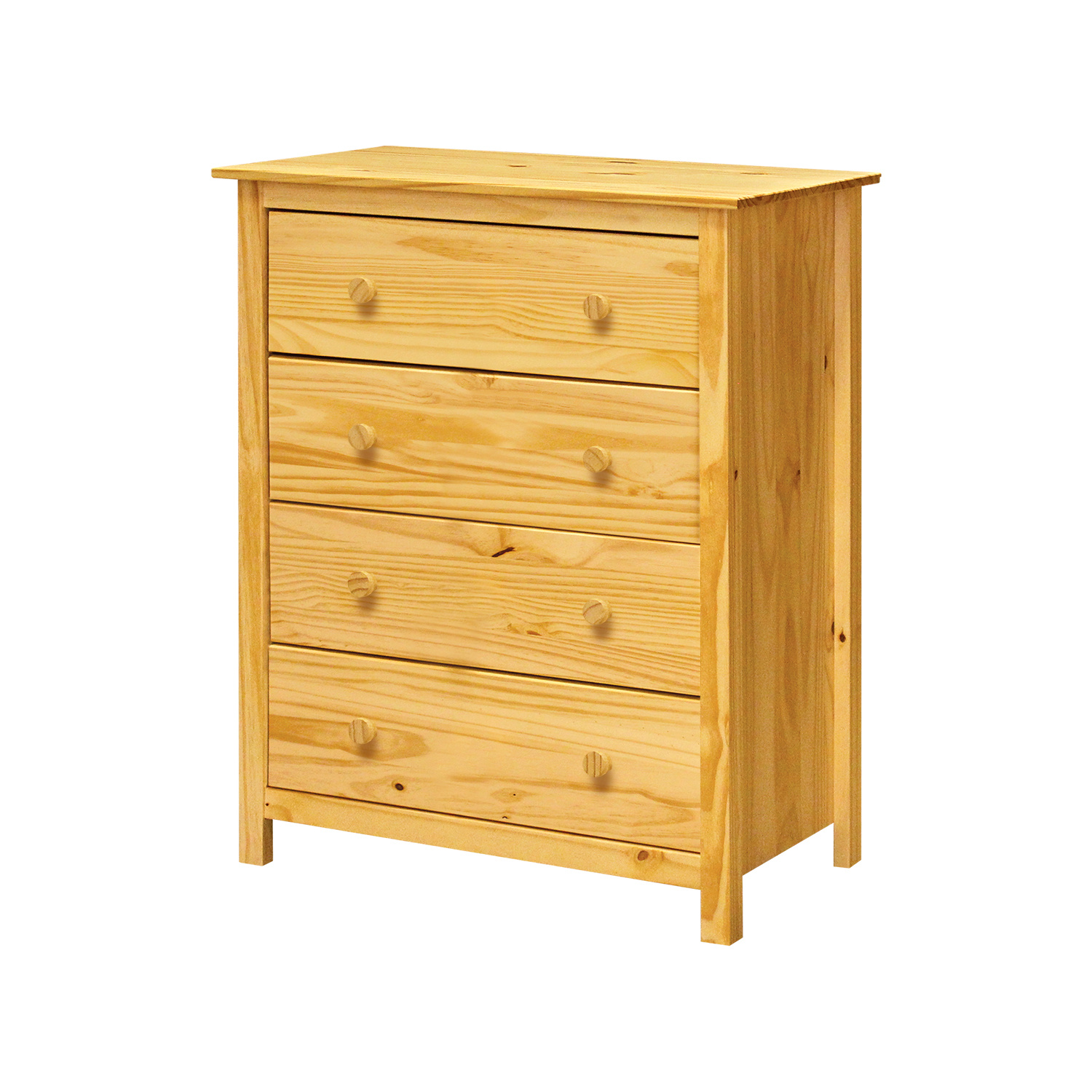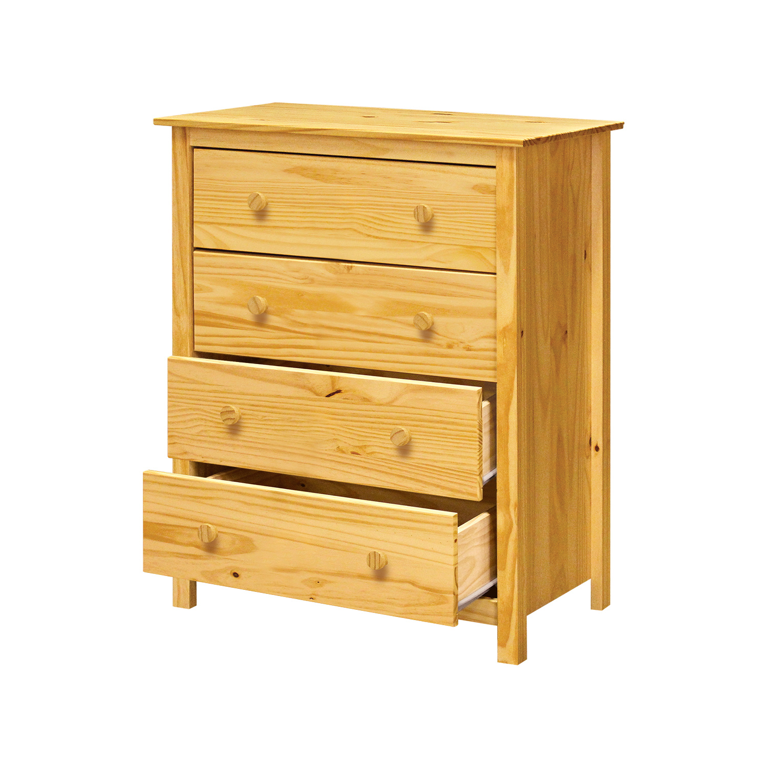 Komoda je vyrobena z materiálu masiv borovice v lakovaném provedení. Má čtyři zásuvky s kovovými pojezdy. Zboží dodáváme v demontu.