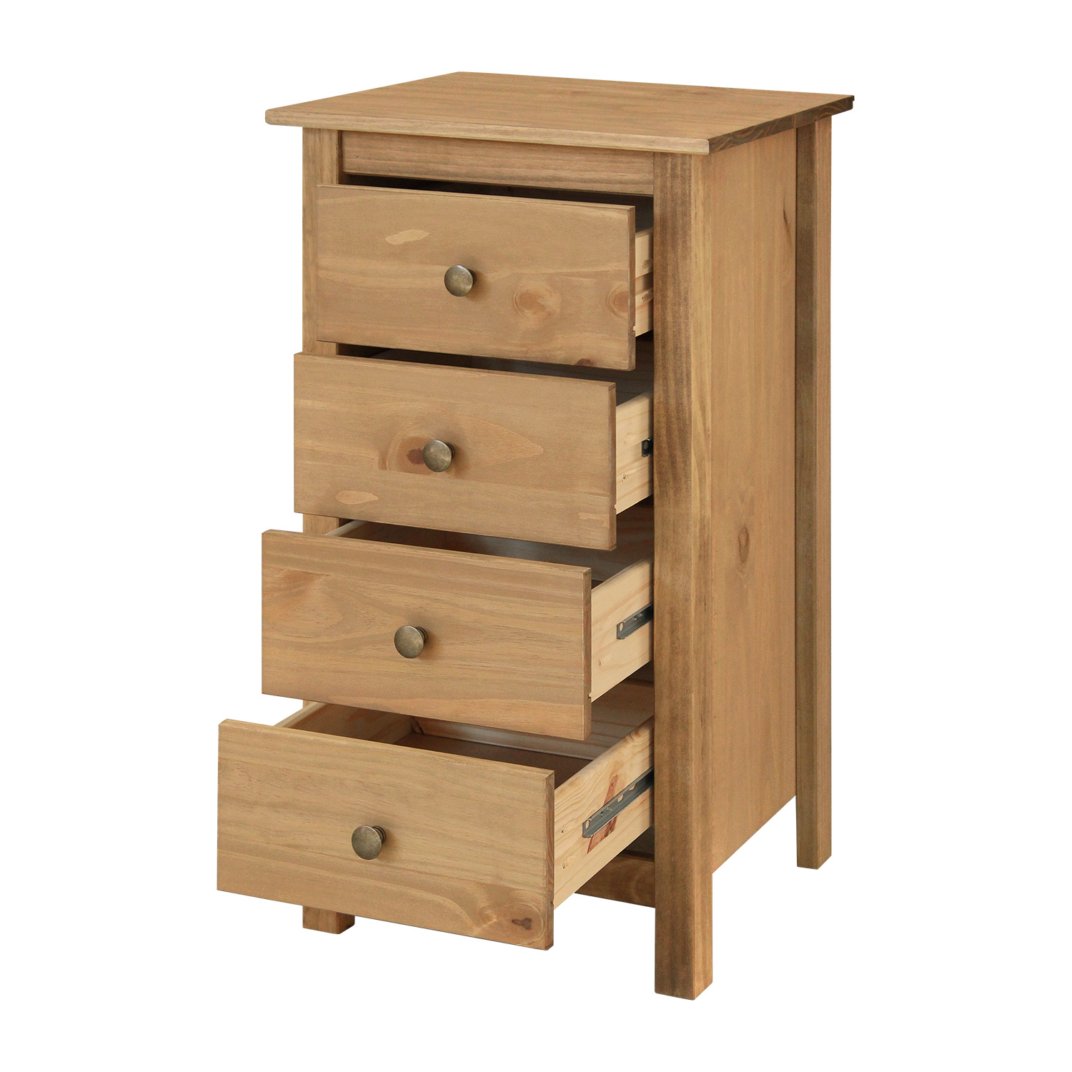 materiál masiv borovice voskovaná v medovém odstínu kovové úchytky v barevném provedení mosaz 4 zásuvky s kovovými pojezdy