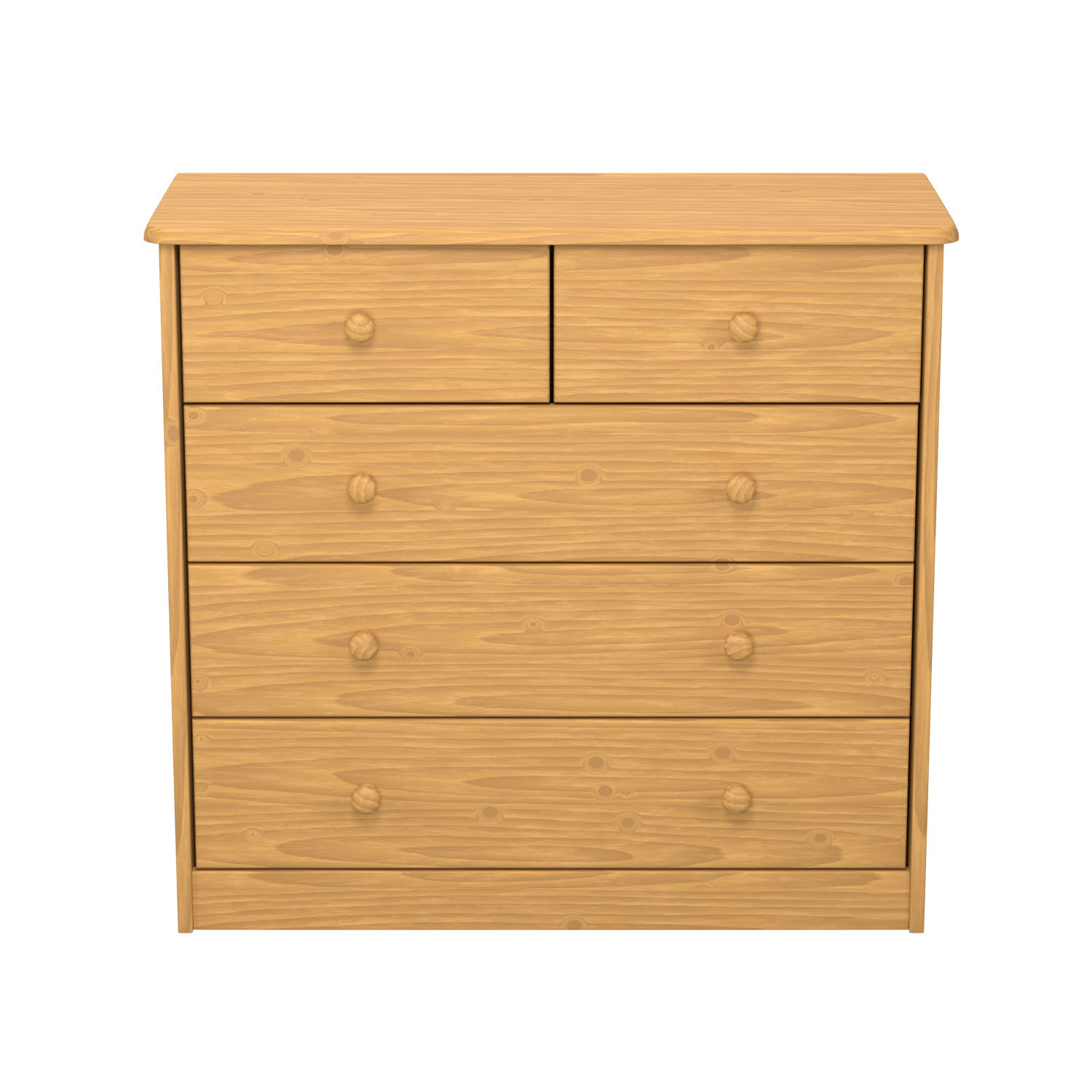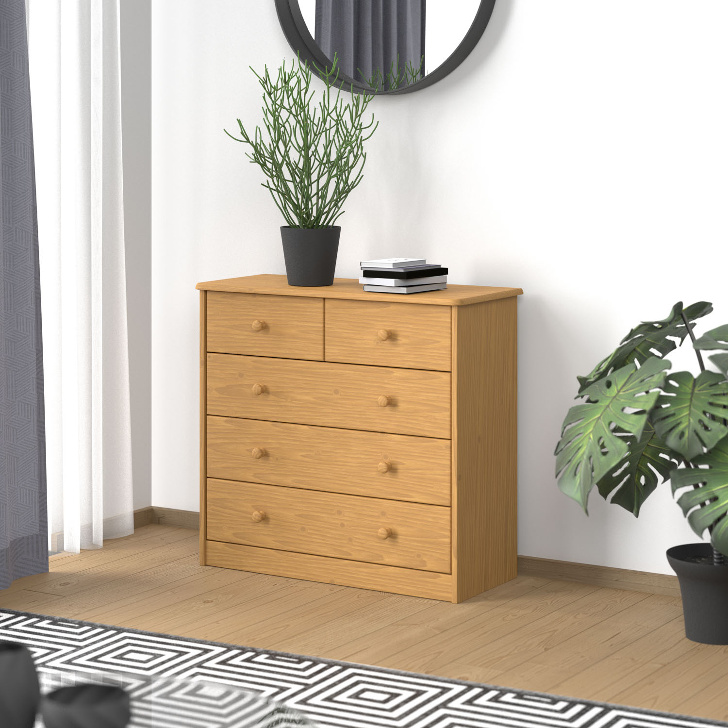 materiál masiv borovice, voskované provedení 2 úzké a 3 široké zásuvky s kovovými pojezdy, hloubka zásuvky 27,5 cm