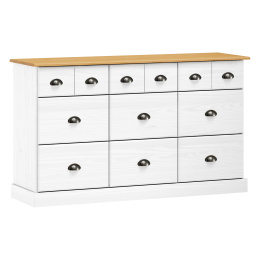 materiál masiv borovice, barevné provedení bílý lak 6 větších a 3 menší zásuvky s kovovými úchytkami a pojezdy