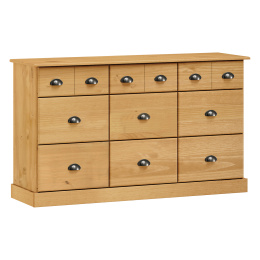 materiál masiv borovice voskovaná v medovém odstínu 6 větších a 3 menší zásuvky s kovovými úchytkami a pojezdy