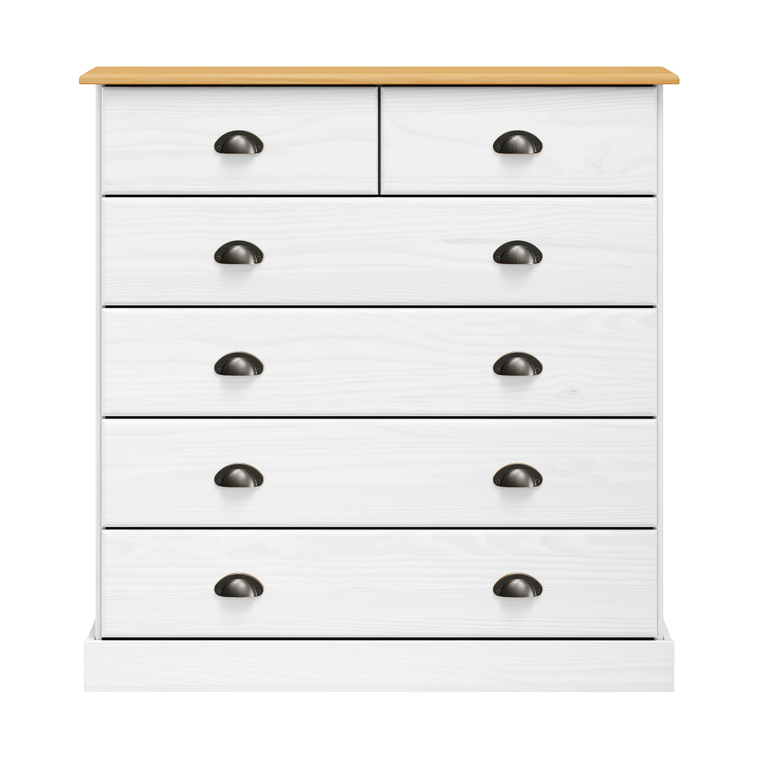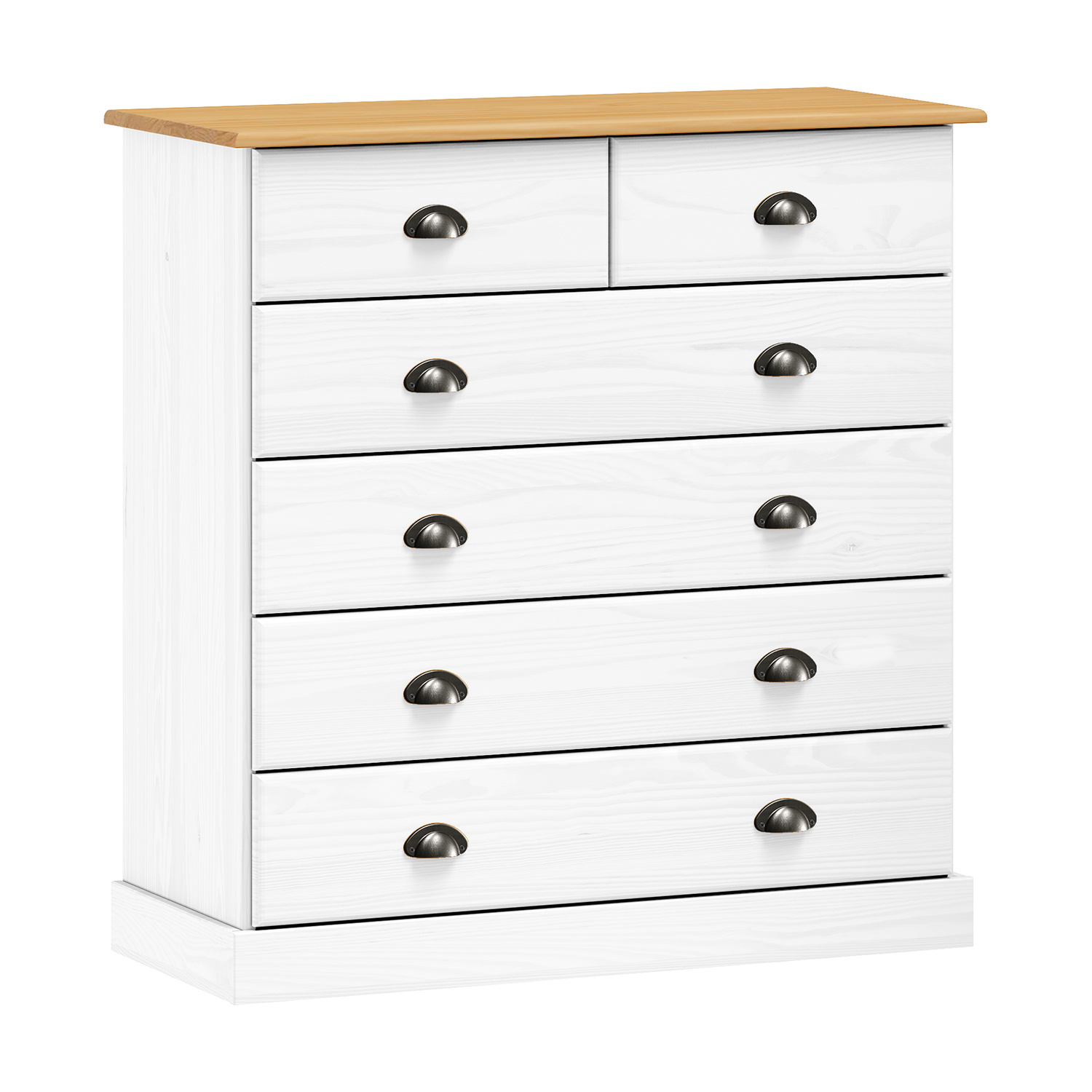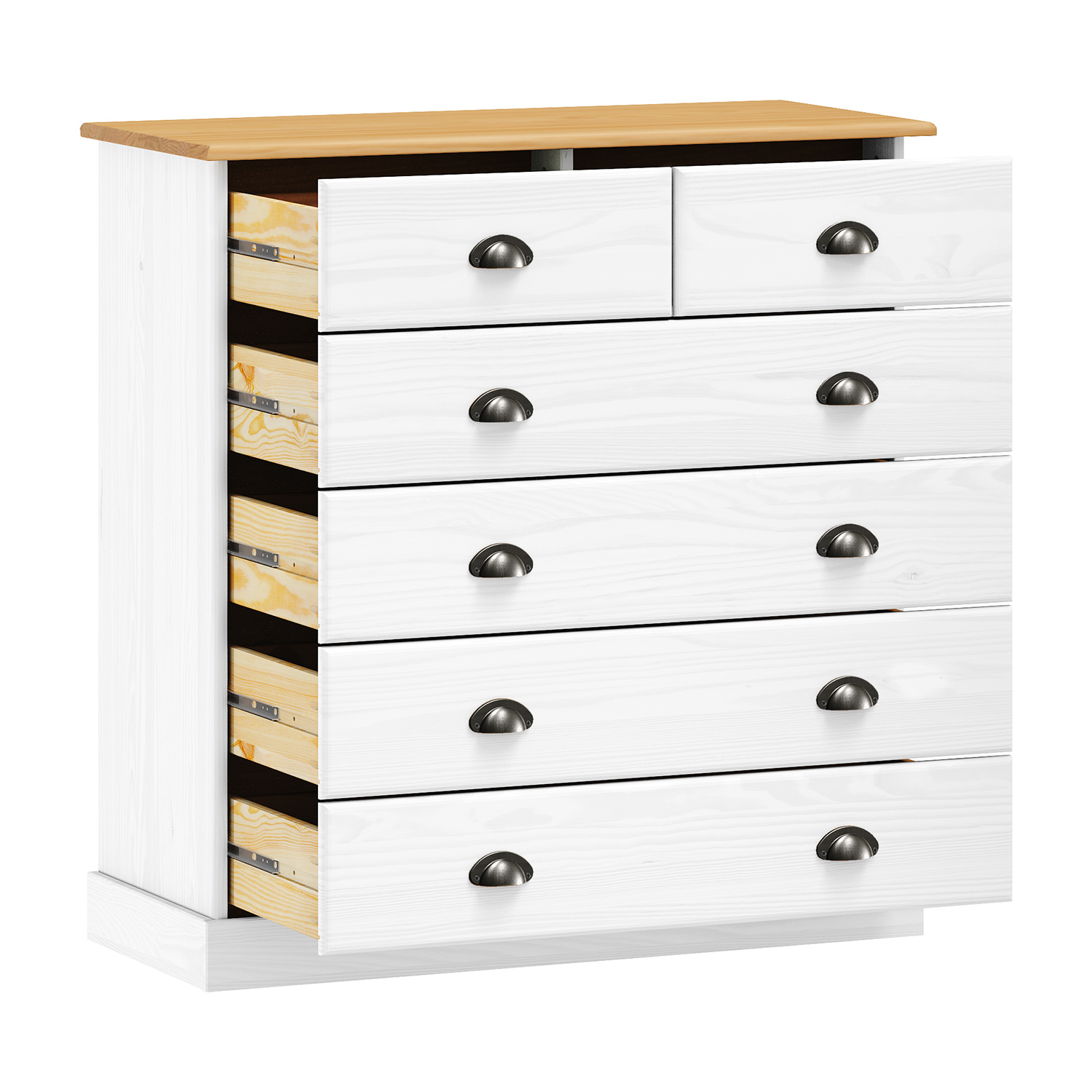 materiál masiv borovice, barevné provedení bílý lak 4 větší a 2 menší zásuvky s kovovými úchytkami a pojezdy