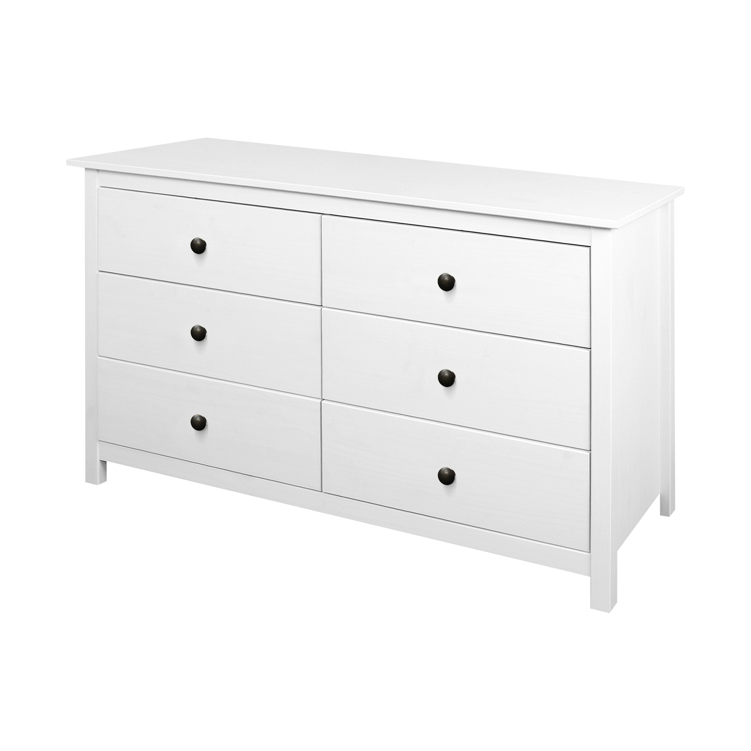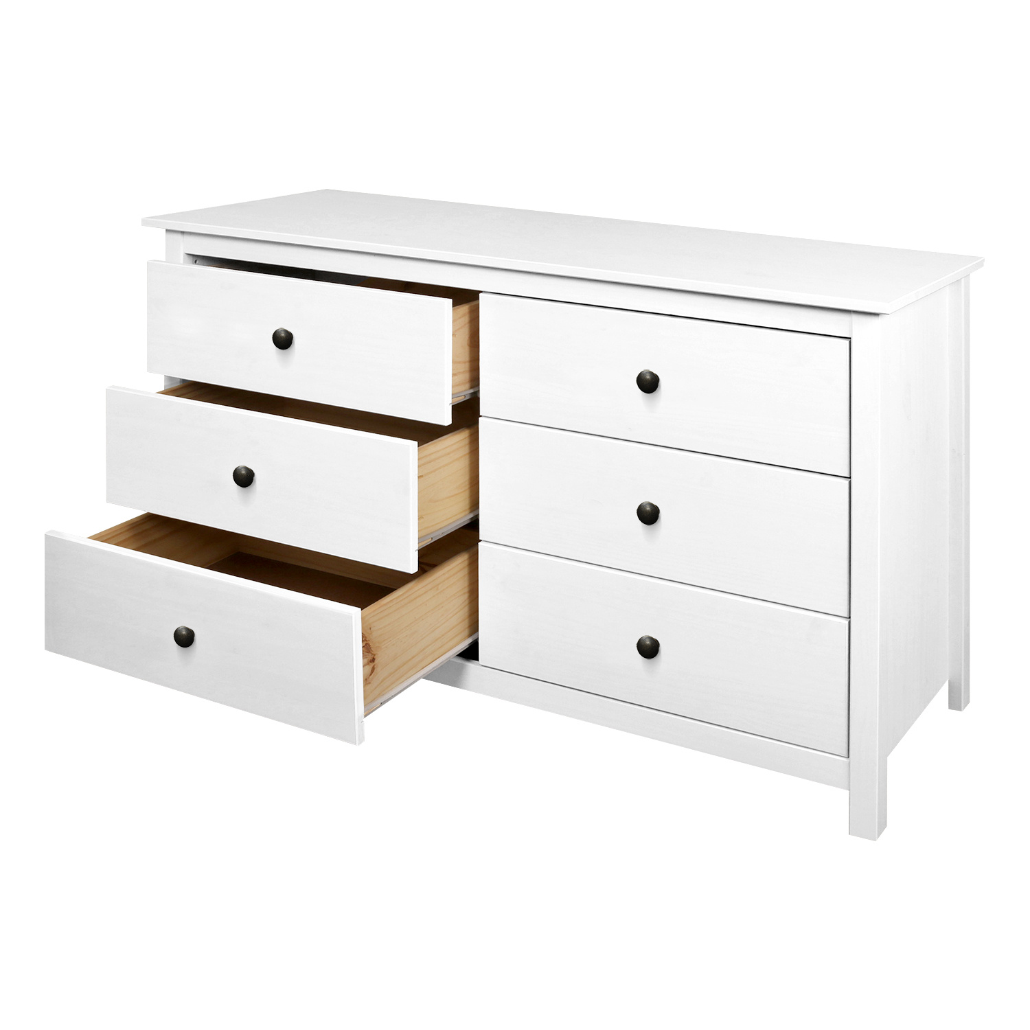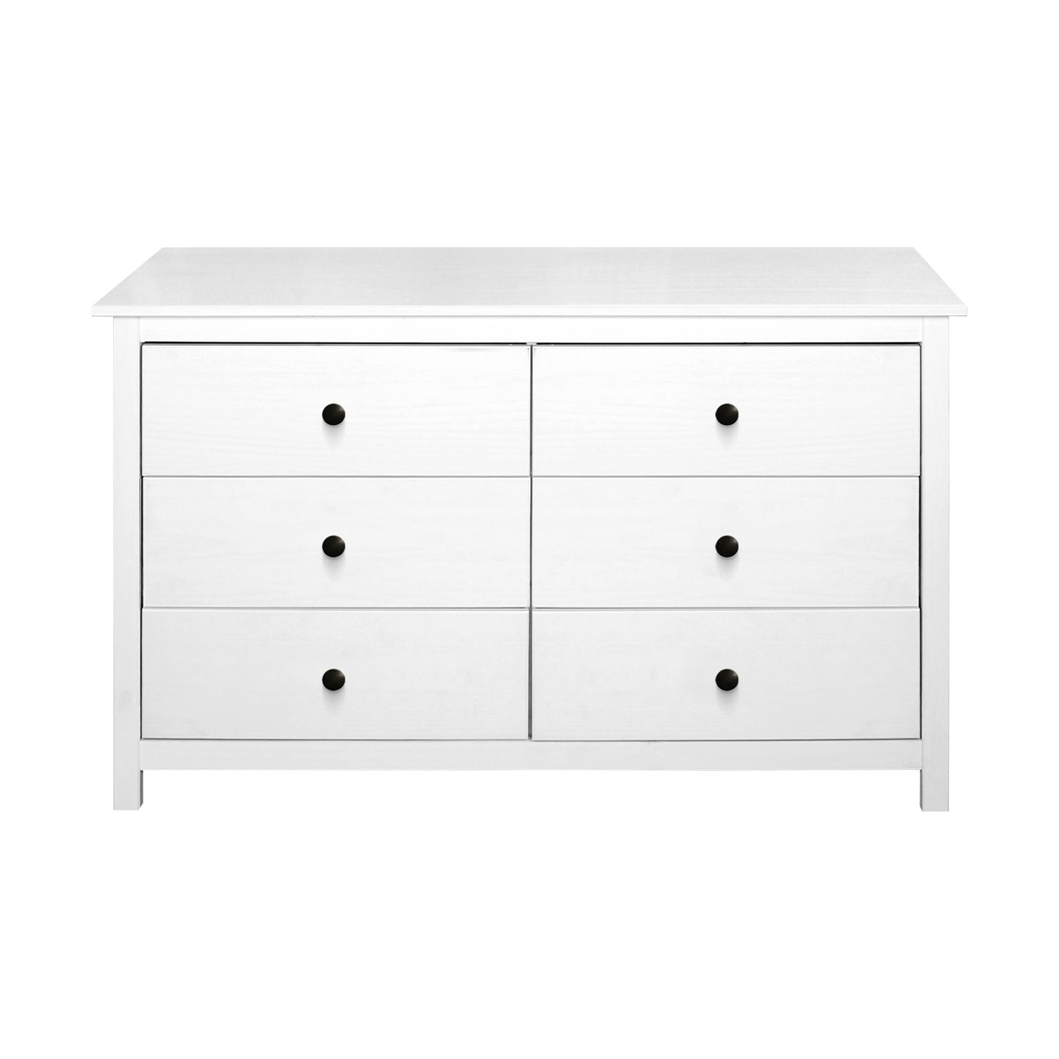materiál masiv borovice, barevné provedení bílý lak kovové úchytky šest zásuvek s kovovými pojezdy rozměr zásuvky (š/h/v) 52 × 33 × 19 cm