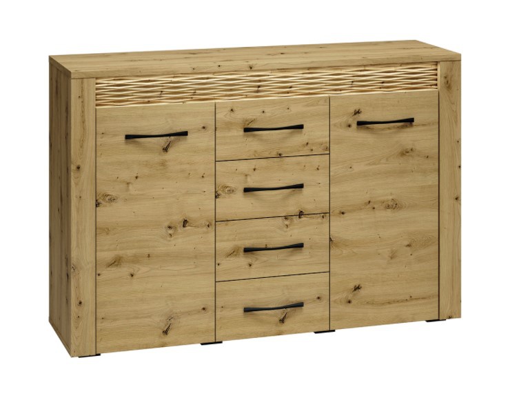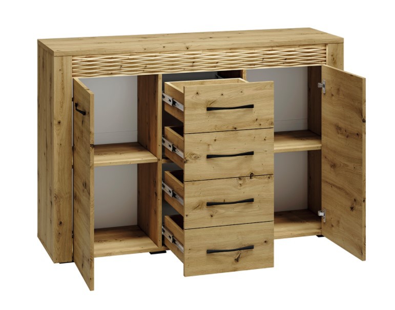 Modernita inspirovaná přírodou, to je pečlivě navržená kolekce nábytku ARTIS. Přirozený vzor dřeva, krásná zrnitost a výrazné suky zdůrazňují charakter nábytku. V kombinaci s jednoduchým stylem vytváří nábytek, který ozdobí jakýkoli interiér. Černé kovové úchytky dokonale kontrastují s dekorem teplého dubu a osvětlená dekorativní drážka dodá vašemu interiéru záři a jedinečnou atmosféru. Kolekce je vyrobena z lamina nejvyšší kvality, odolného proti poškrábání, vlhkosti a vysokým teplotám, v dezénu dub artisan, dekorativní drážka je z MDF. Na nábytku jsou použity hrany ABS, které jsou trvanlivé, odolné proti nárazu a vlhkosti a neodlepují se. Zásuvky disponují plnovýsuvem. Zboží je dodáváno v demontu.