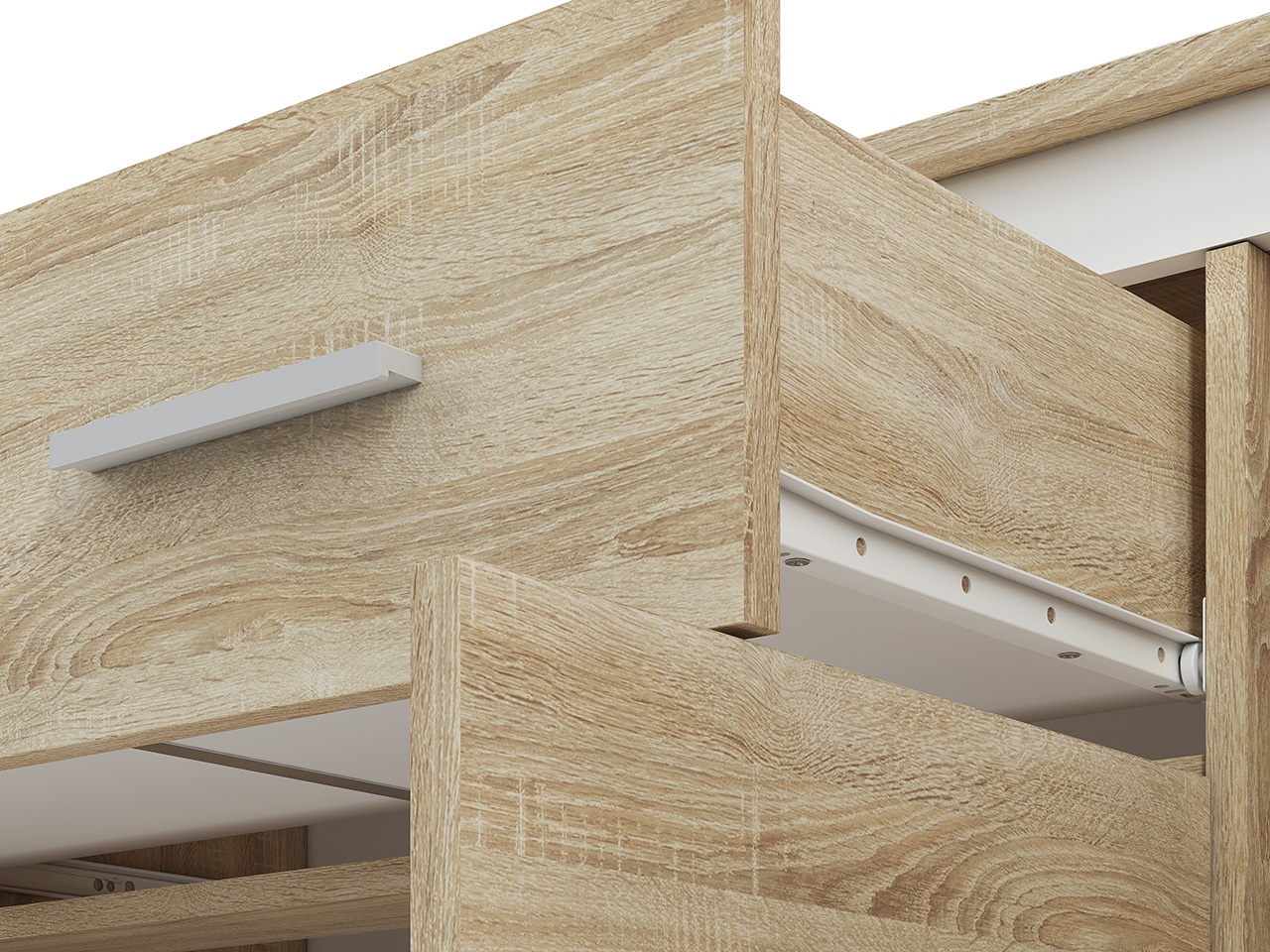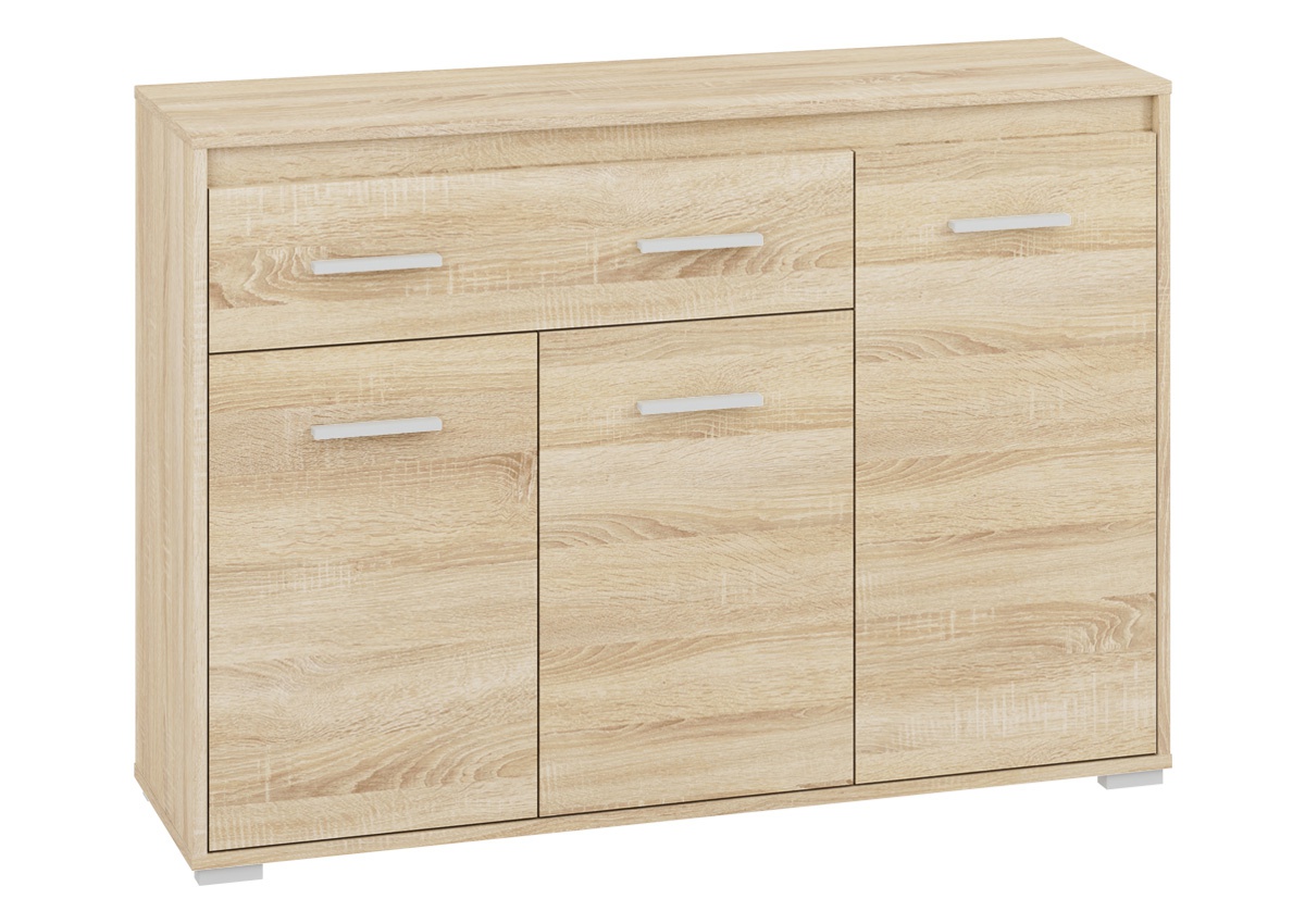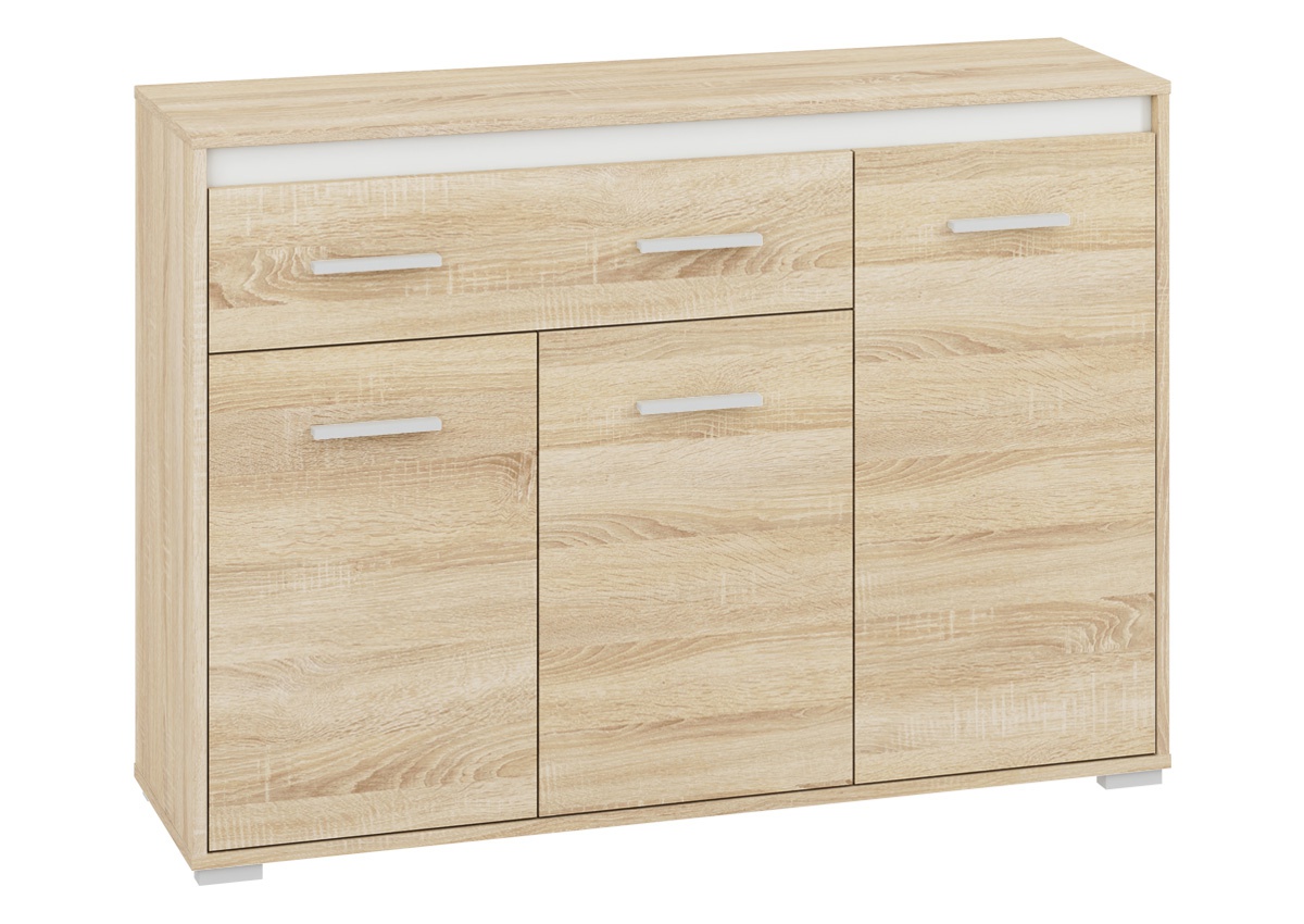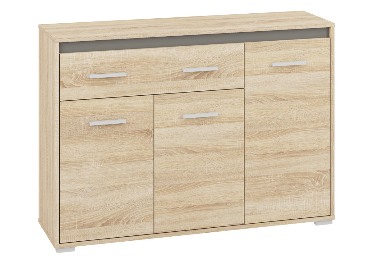 Nábytkový systém je moderní a minimalistický. Nábytek je vyroben z kvalitního lamina, které je odolné proti poškrábání, vlhkosti a vysokým teplotám. Korpus i dvířka jsou v dezénu dub sonoma. Vrchní lišta je dostupná ve třech dezénech - bílá, antracit, sonoma jasná. Hrana ABS představuje stálost, odolnost proti nárazu, estetickou úpravu. Odolná proti vlhkosti, nedeformuje se a neuvolní od povrchu. Komoda je kombinovaná, má jeden šuplík a troje dvířka. Zboží je dodáváno v demontu.