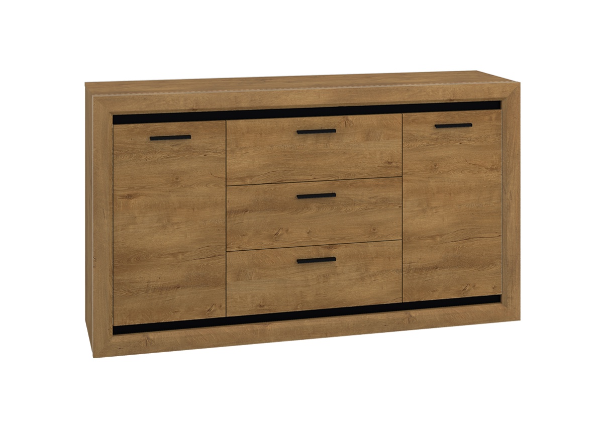 Komoda je vyrobena z vysoce kvalitního lamina v barvě dub lefkas/černá, má dvoje dvířka a tři šuplíky. Tento druh nábytku má velmi pevnou konstrukci a ABS hrany. K této komodě lze nakombinovat i další komponenty ze systému BALTICA. Systém BALTICA  je vhodný do ložnice, obývacího pokoje a jídelny. Zboží dodáváme v demontu.