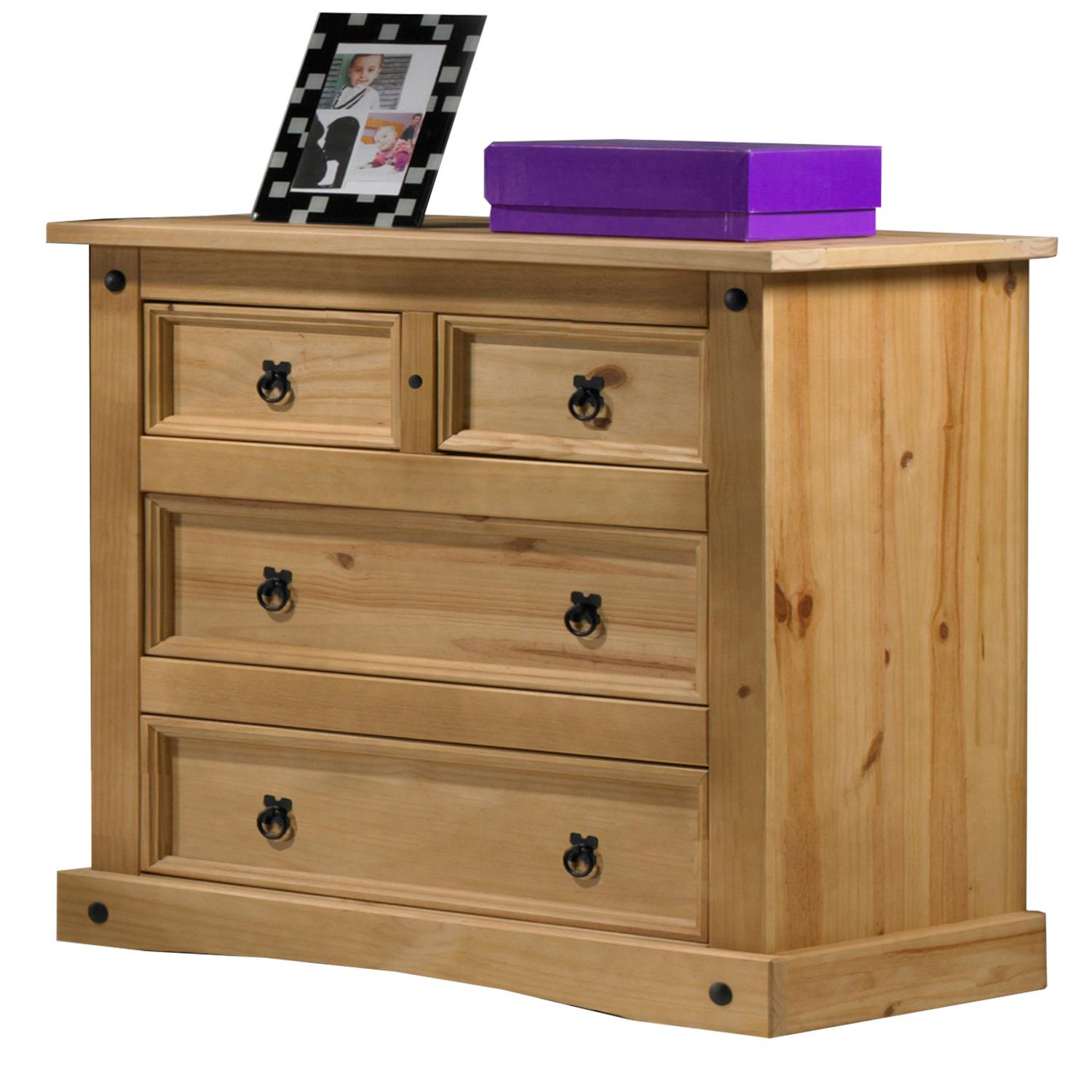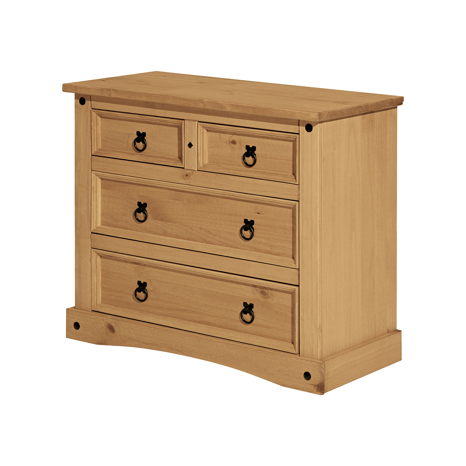 Stylová komoda Corona je vyrobena z masivní borovice, voskovaná v medovém odstínu. Komoda má 2 malé zásuvky a 2 velké zásuvky. Komodu zdobí černé kovové úchytky. Komoda je součast sestavy Corona. Vhodný doplněk je nástavec 16463. Zboží dodáváme v demontu.