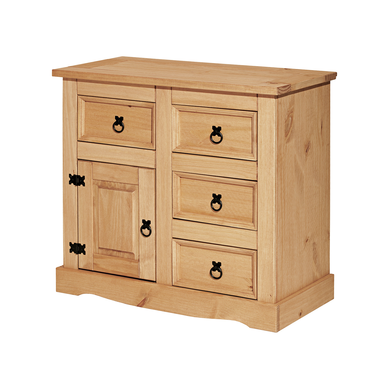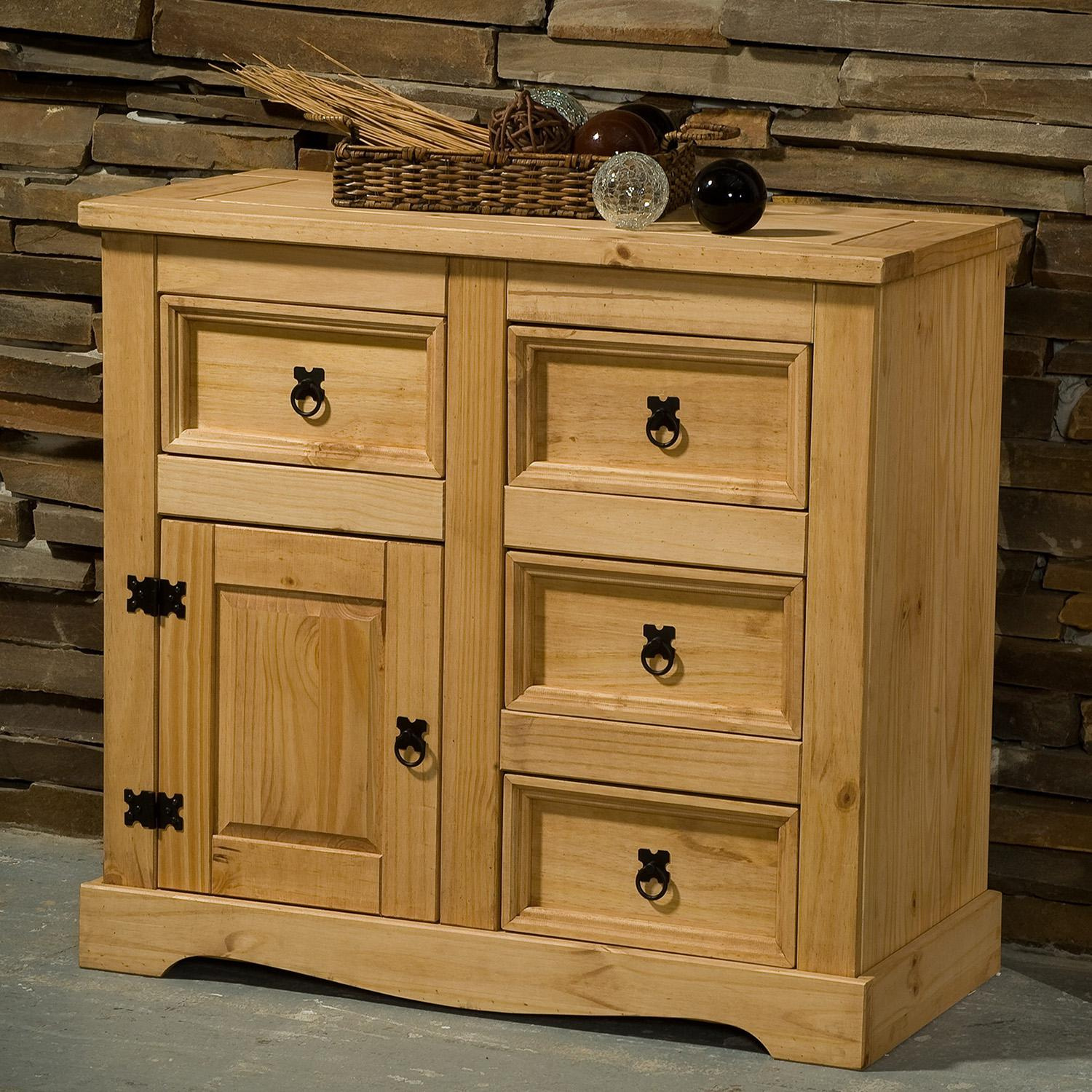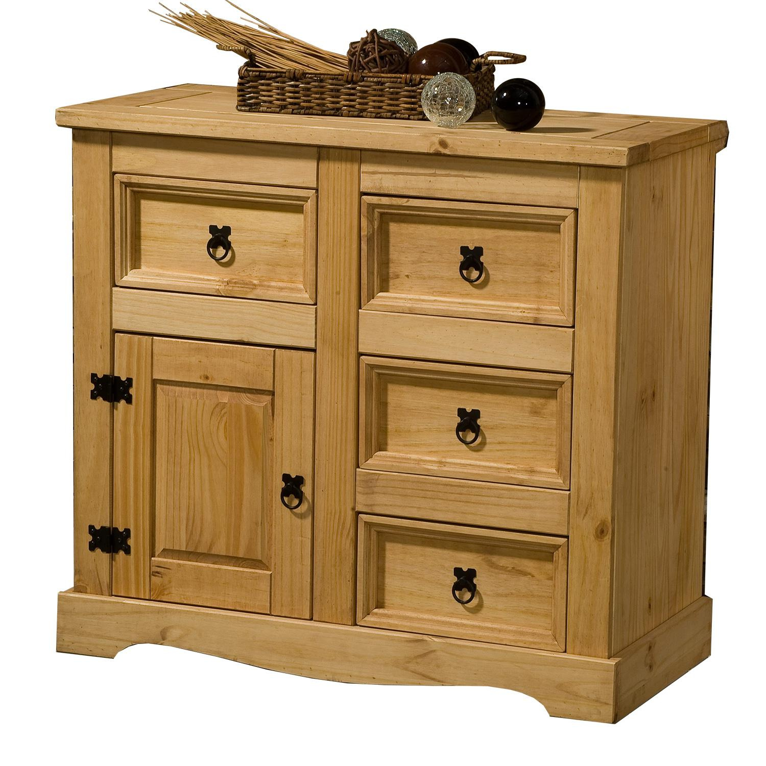 Stylová komoda Corona je vyrobena z masivní borovice, voskovaná v medovém odstínu. Komoda má 4 malé zásuvky a 1 dvířka. Komodu zdobí černé kovové úchytky. Komoda je součast sestavy Corona. Vhodný nadstavec je 16463. Zboží dodáváme v demontu.