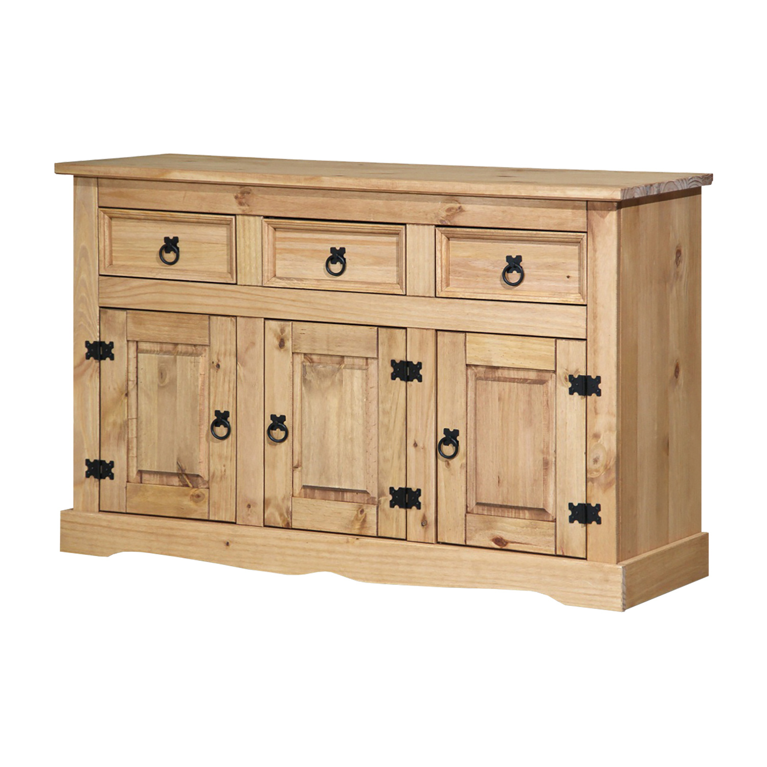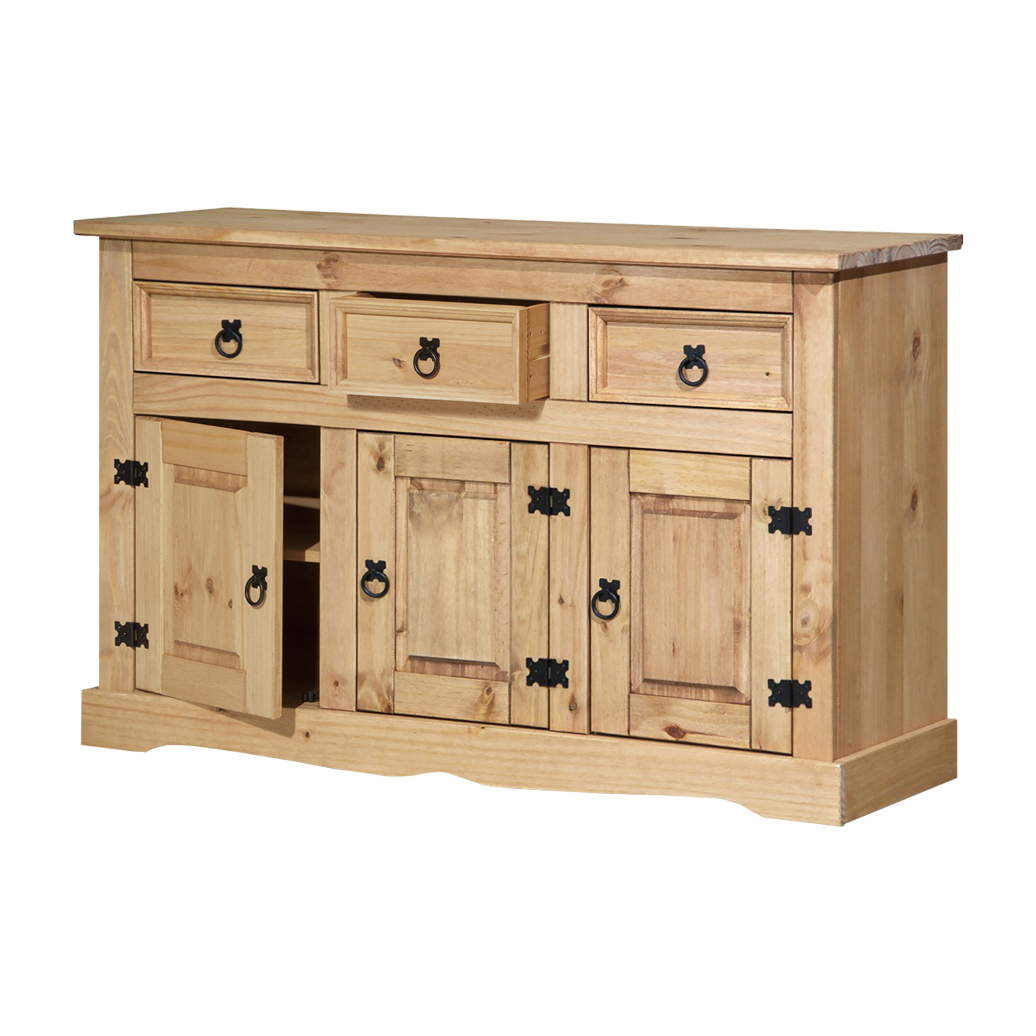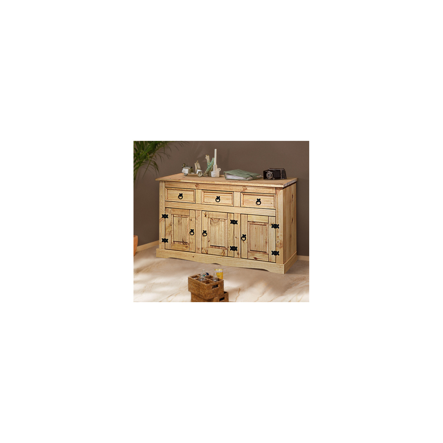 Stylová komoda Corona je vyrobena z masivní borovice, voskovaná v medovém odstínu. Komoda má 3 malé zásuvky a 3 dvířka, 1 polici. Komodu zdobí černé kovové úchytky. Komoda je součast sestavy Corona. Vhodný doplněk je nástavec 16465. Zboží dodáváme v demontu.
