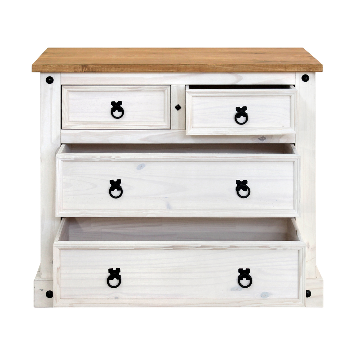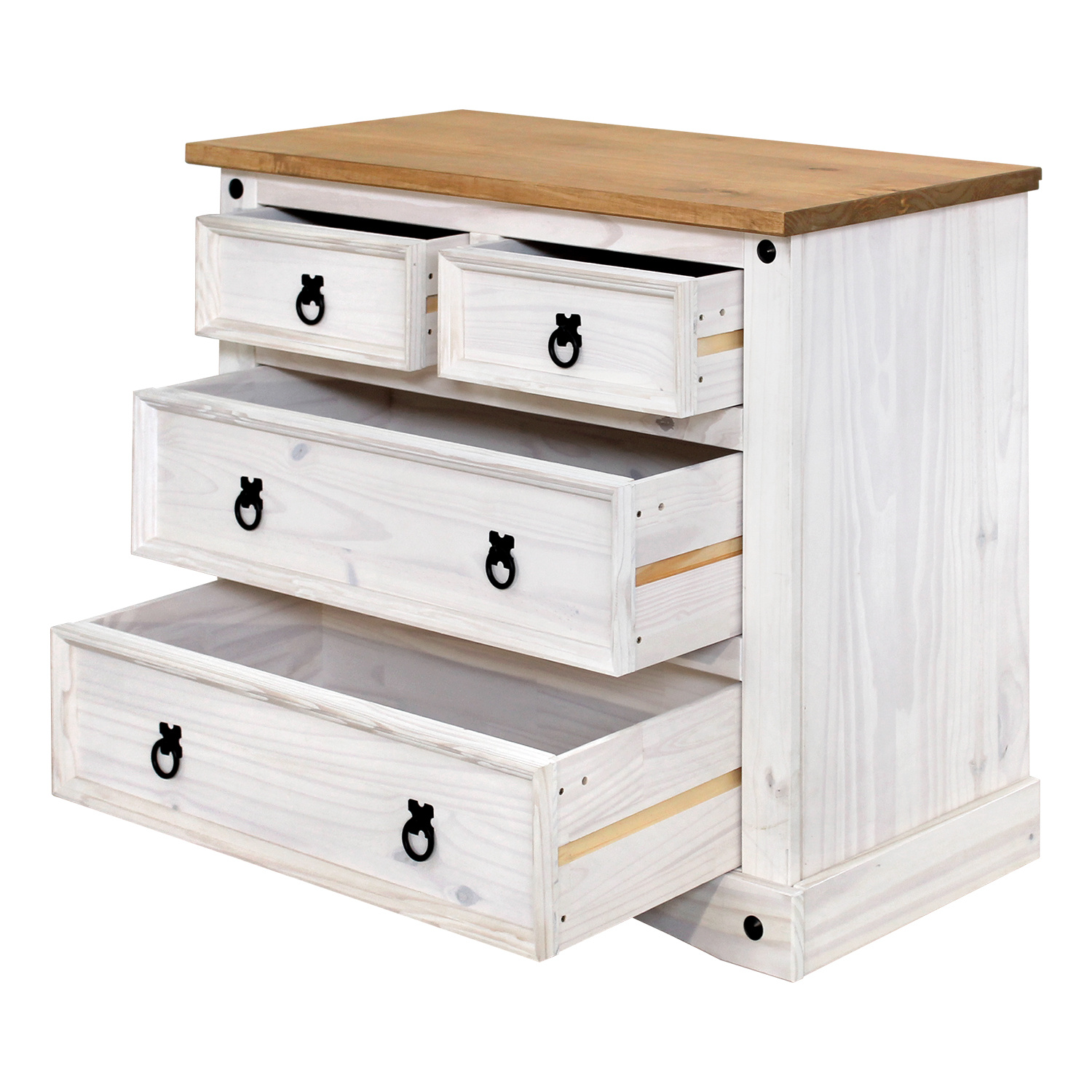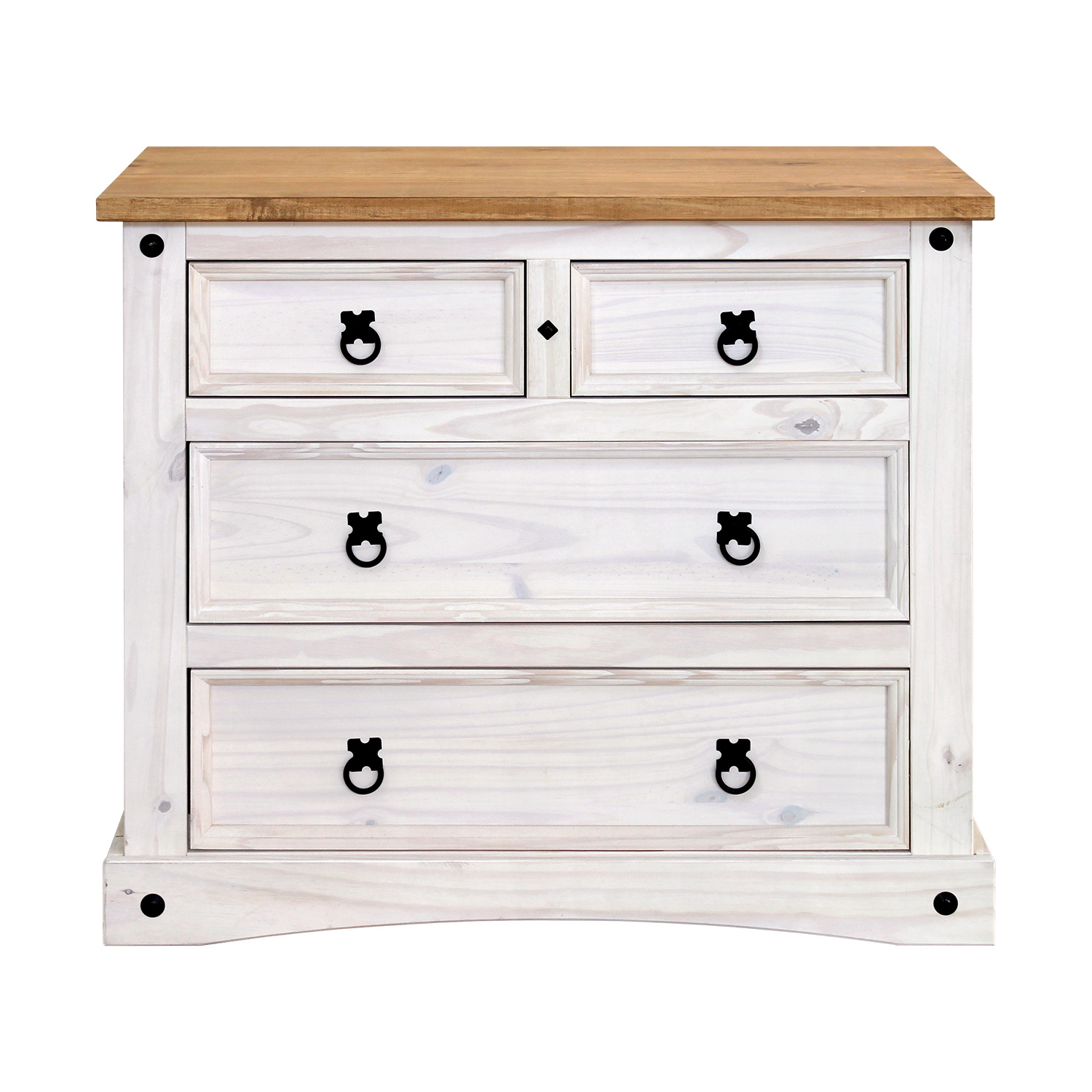 Komoda je vyrobena z materiálu masiv borovice voskovaná v barevném provedení bílá. Horní deska komody je v medovém odstínu. Komoda má 2 malé a 2 velké zásuvky s kovovými ozdobnými úchytky. Zboží dodáváme v demontu.