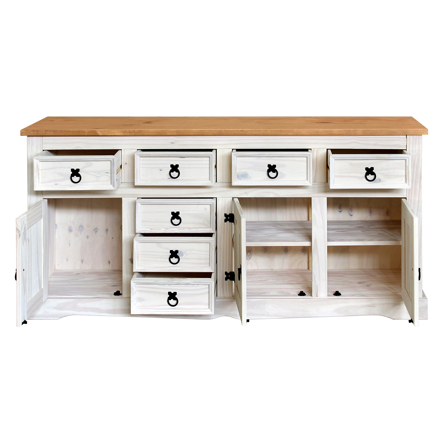 Komoda je vyrobena z materiálu masiv borovice voskovaná v barevném provedení bílá. Horní deska komody je v medovém odstínu. Komoda má 3 dvířka, za 2 dvířky se ukrývá 1 police, a 7 zásuvek s kovovými ozdobnými úchytky. Zboží dodáváme v demontu.