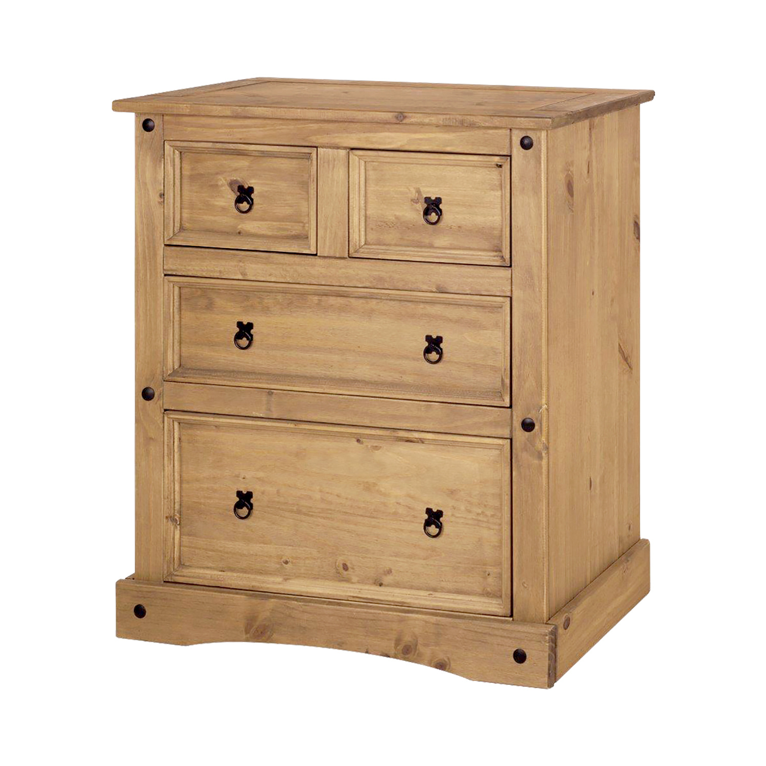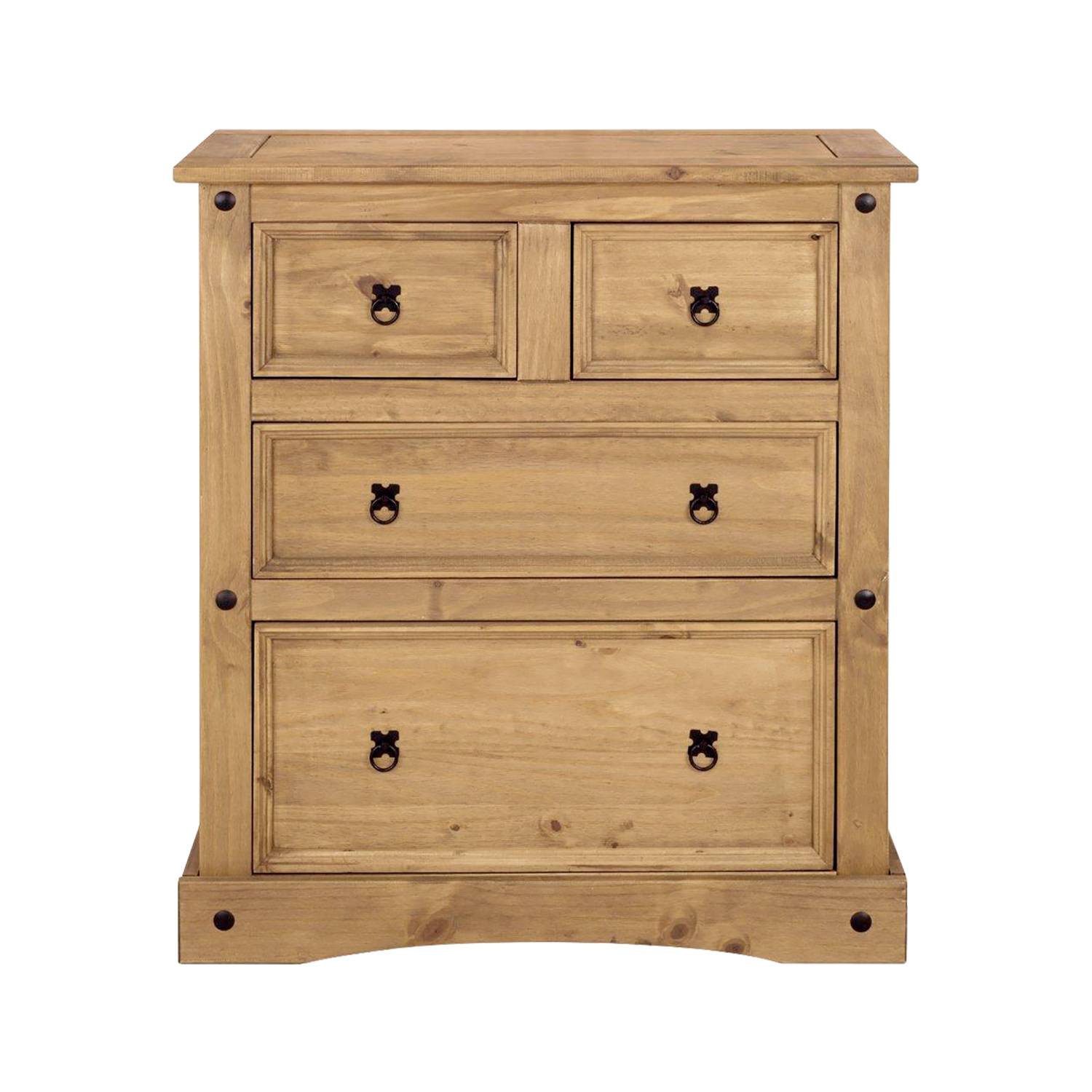Komoda z materiálu masiv borovice voskovaná v medovém odstínu. Komoda má 2 menší a 2 větší zásuvky s kovovými ozdobnými úchytkami. Zboží dodáváme v demontu.