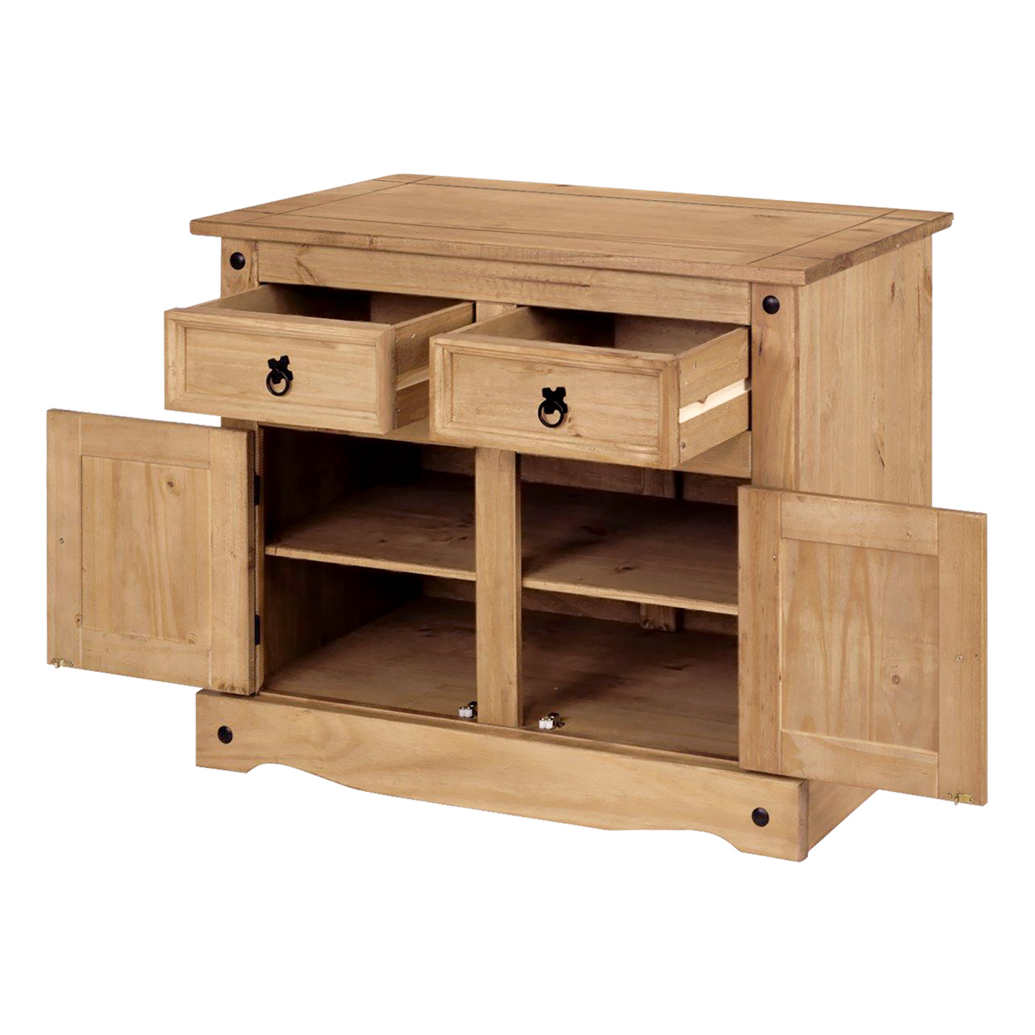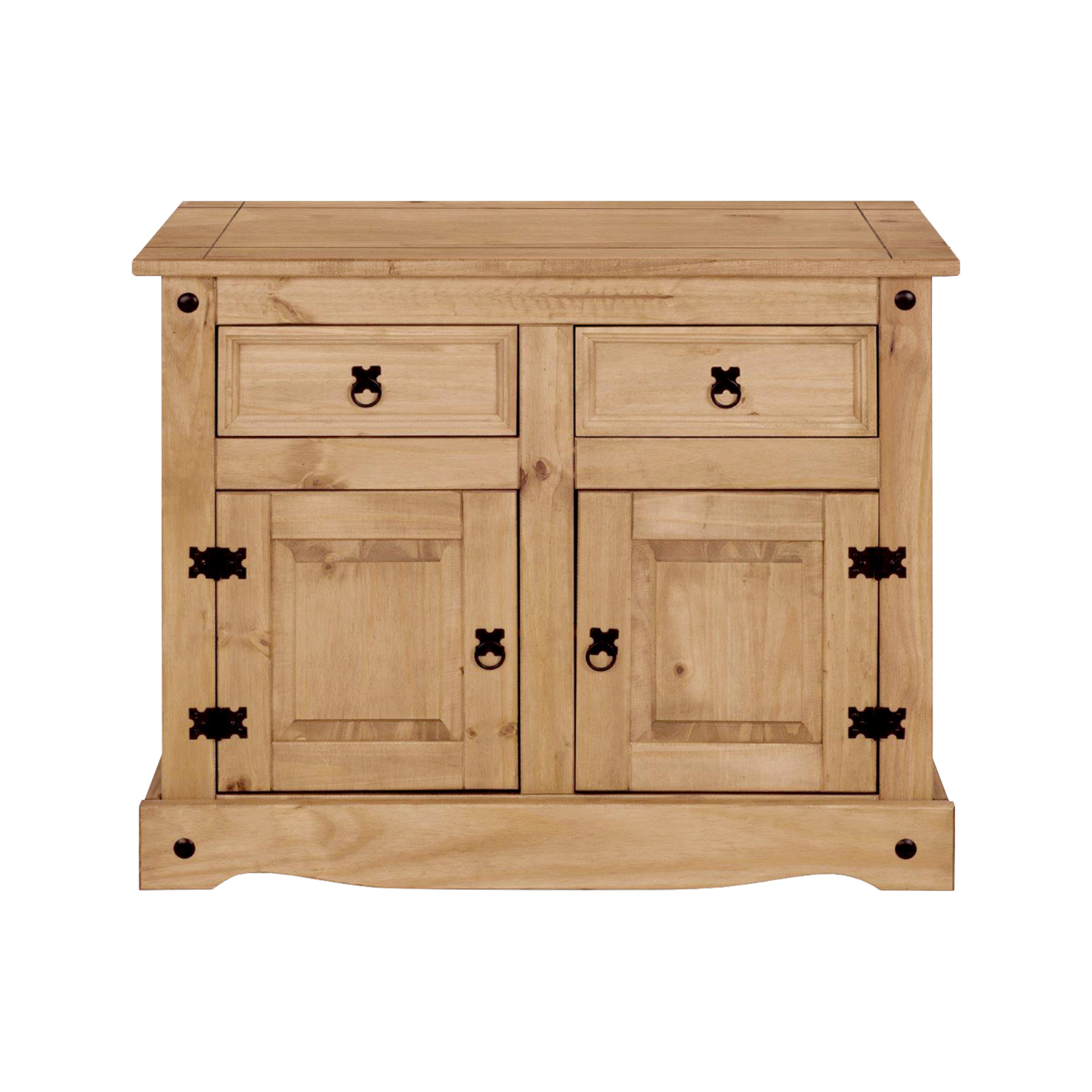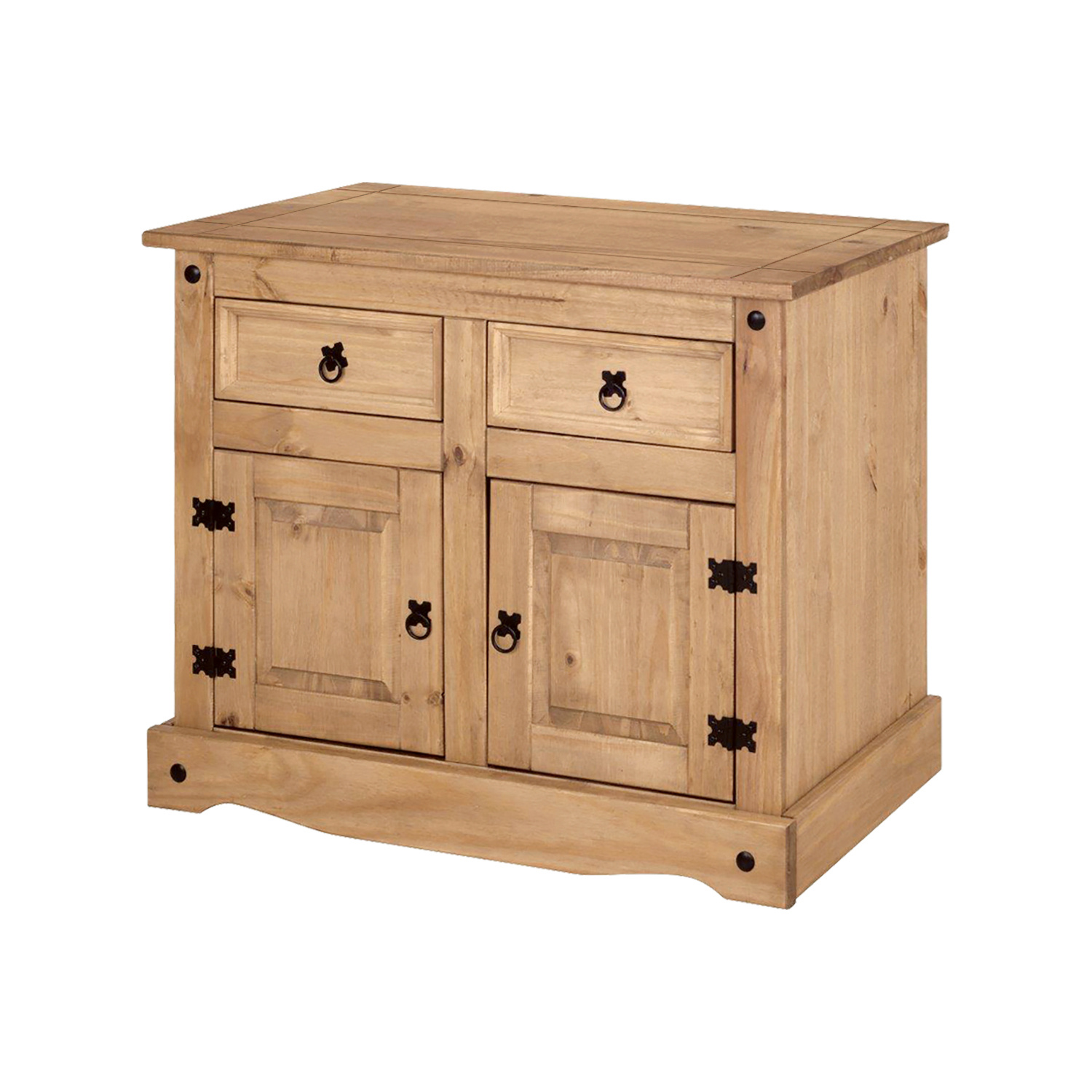 Komoda z materiálu masiv borovice voskovaná v medovém odstínu. Komoda s kovovými ozdobnými úchytkami má 2 zásuvky a 2 dvířka, které ukrývají 1 polici. Zboží dodáváme v demontu.