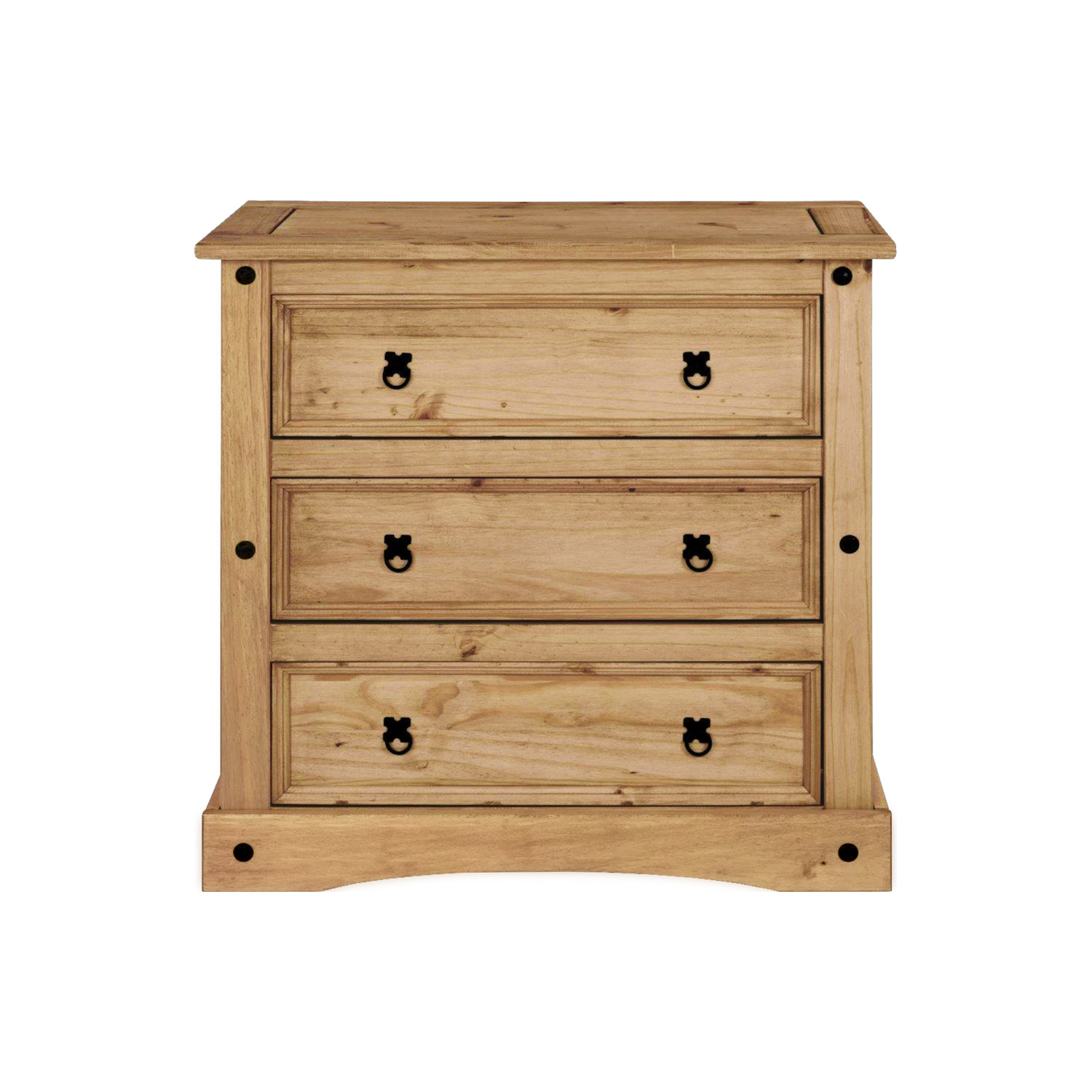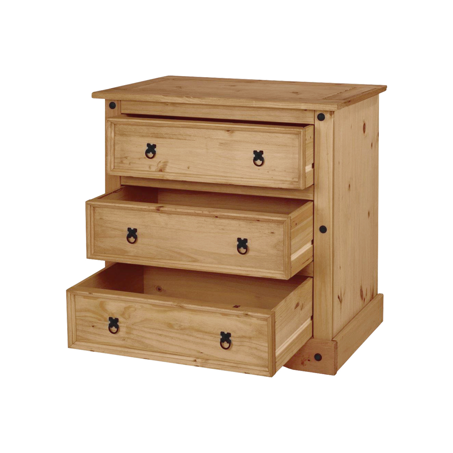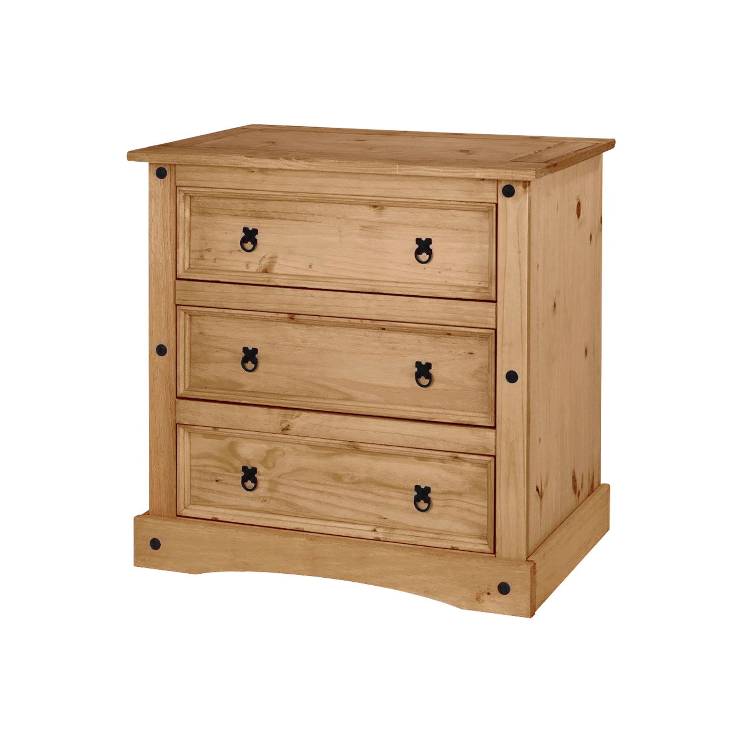 Komoda z materiálu masiv borovice voskovaná v medovém odstínu. Komoda má 3 zásuvky s kovovými ozdobnými úchytkami. Zboží dodáváme v demontu.