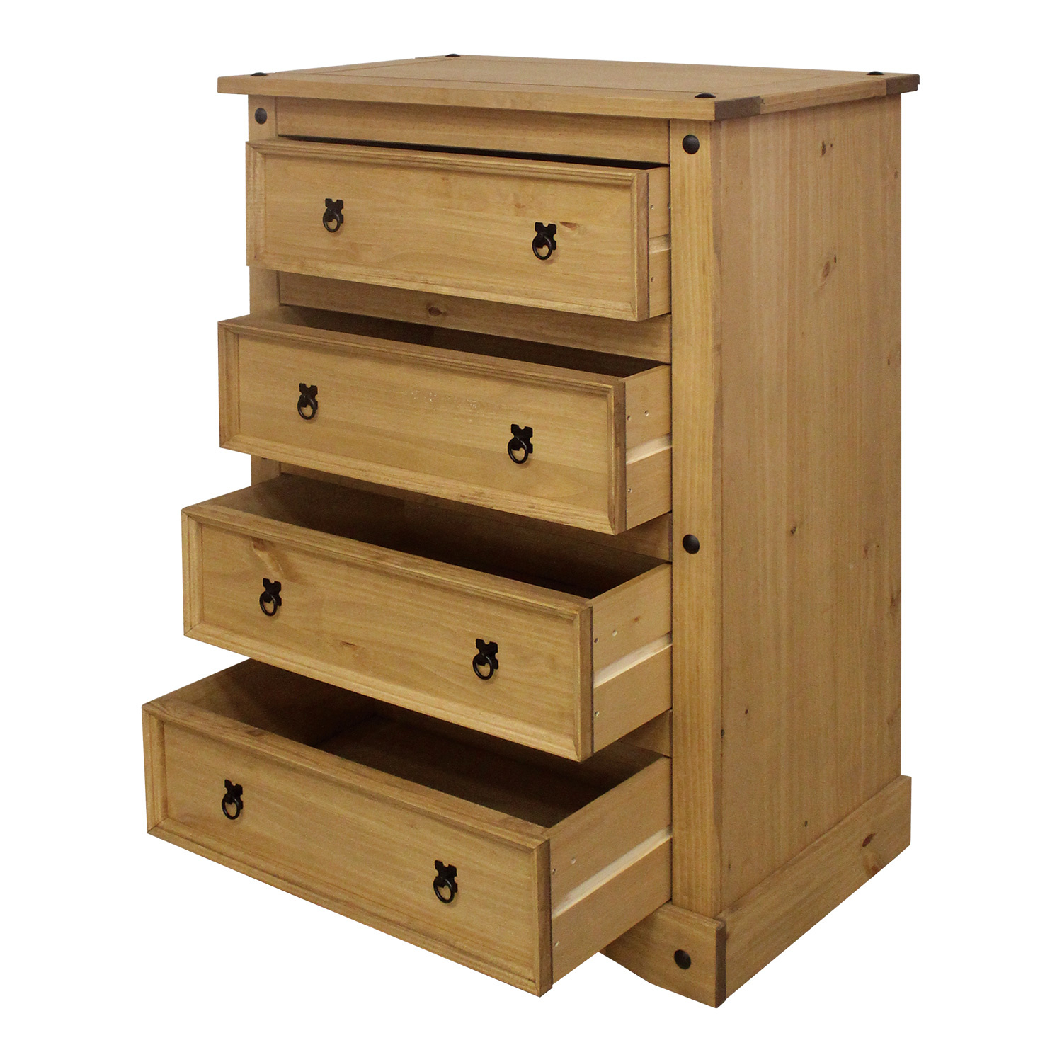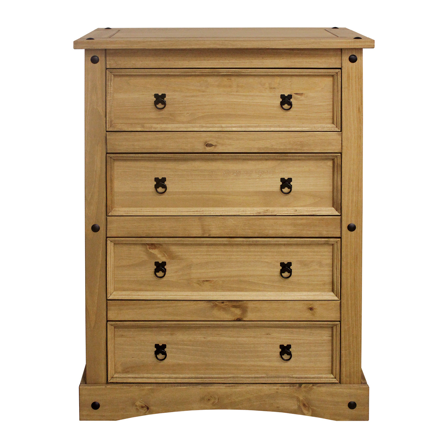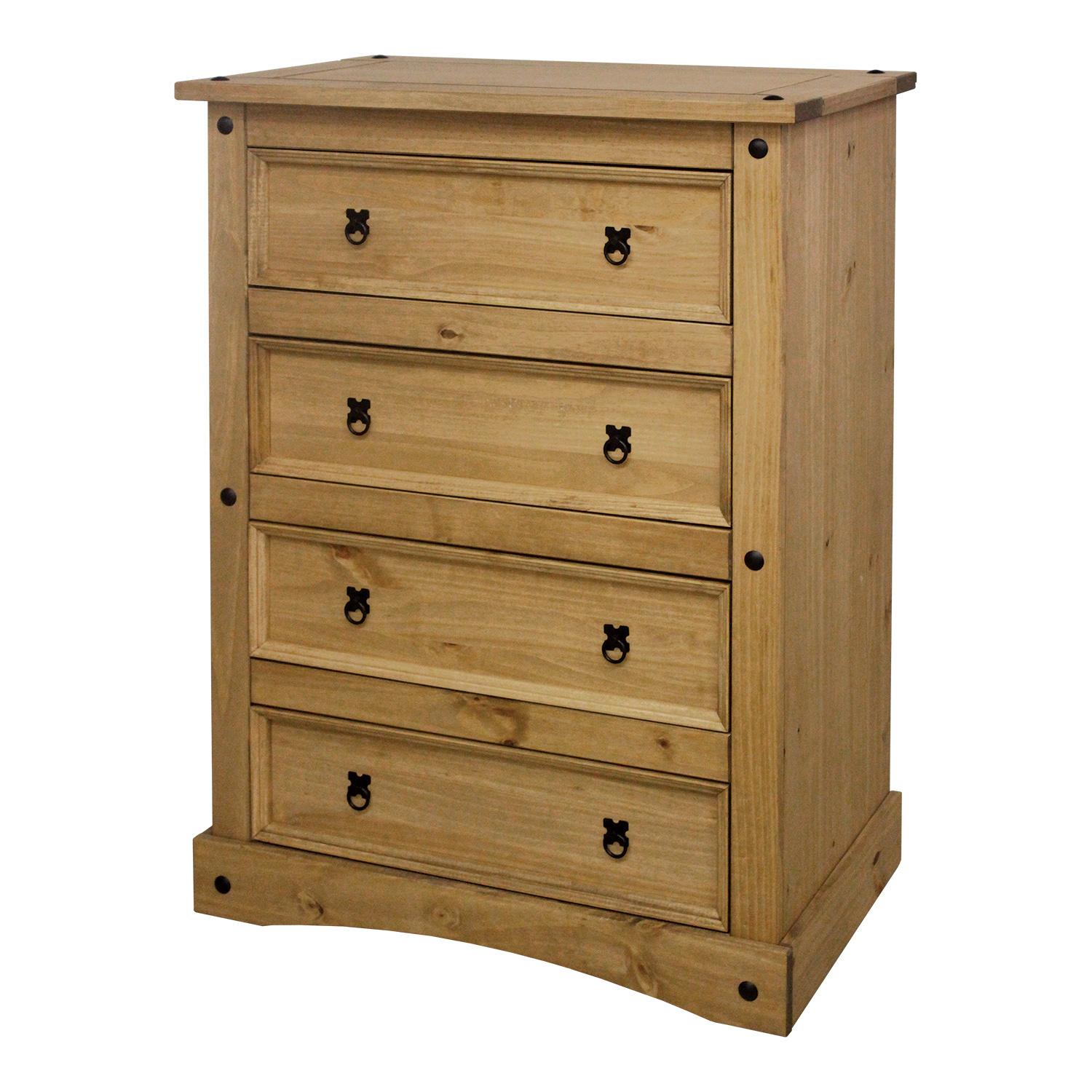 Stylová komoda Corona je vyrobena z masivní borovice, voskovaná v medovém odstínu. Komoda má 4 velké zásuvky. Komodu zdobí černé kovové úchytky. Komoda je součast sestavy Corona. Dekorační transparentní vosky odpuzují vodu a nečistoty. Díky své hloubce má široké využití i v užších prostorech. Zboží dodáváme v demontu.